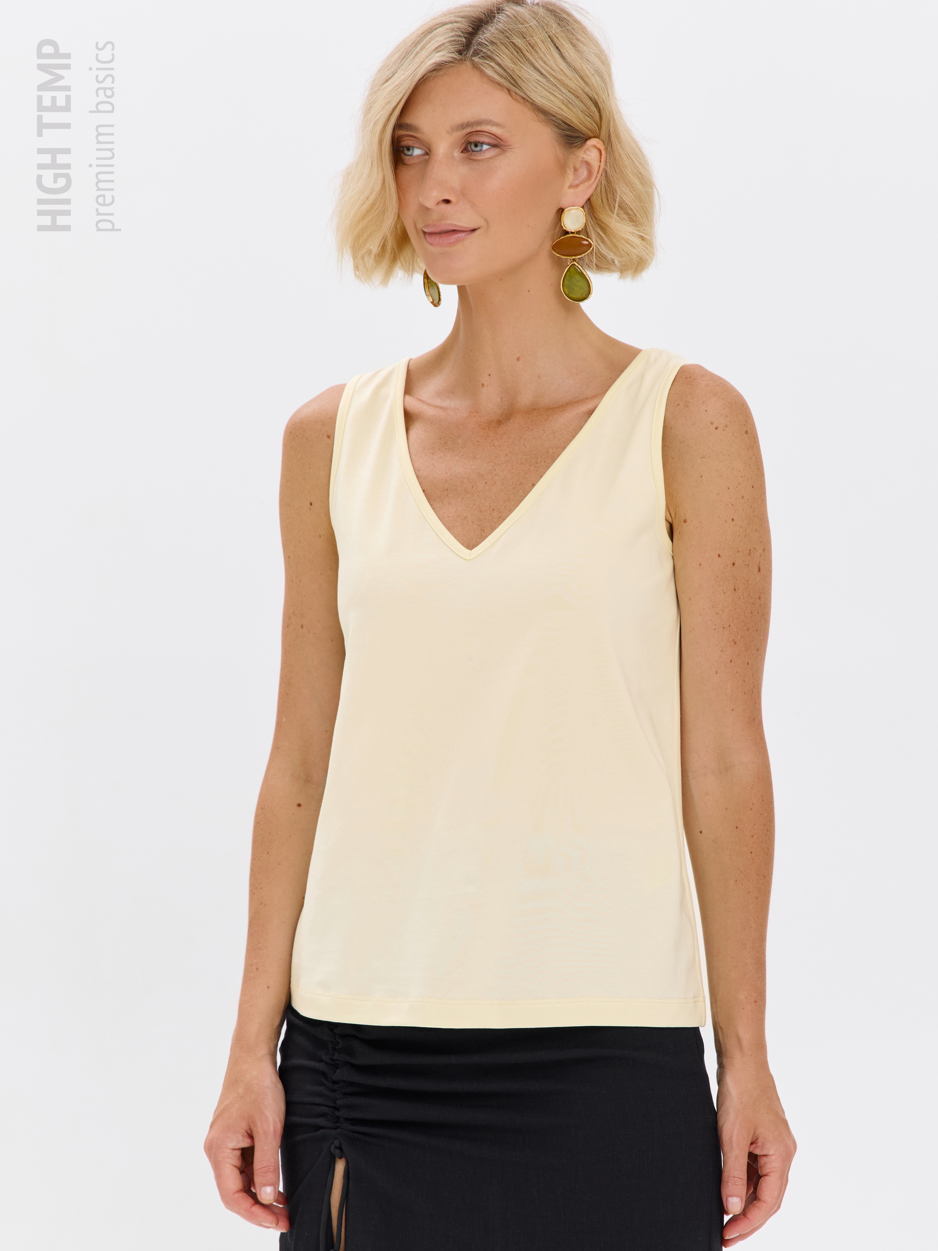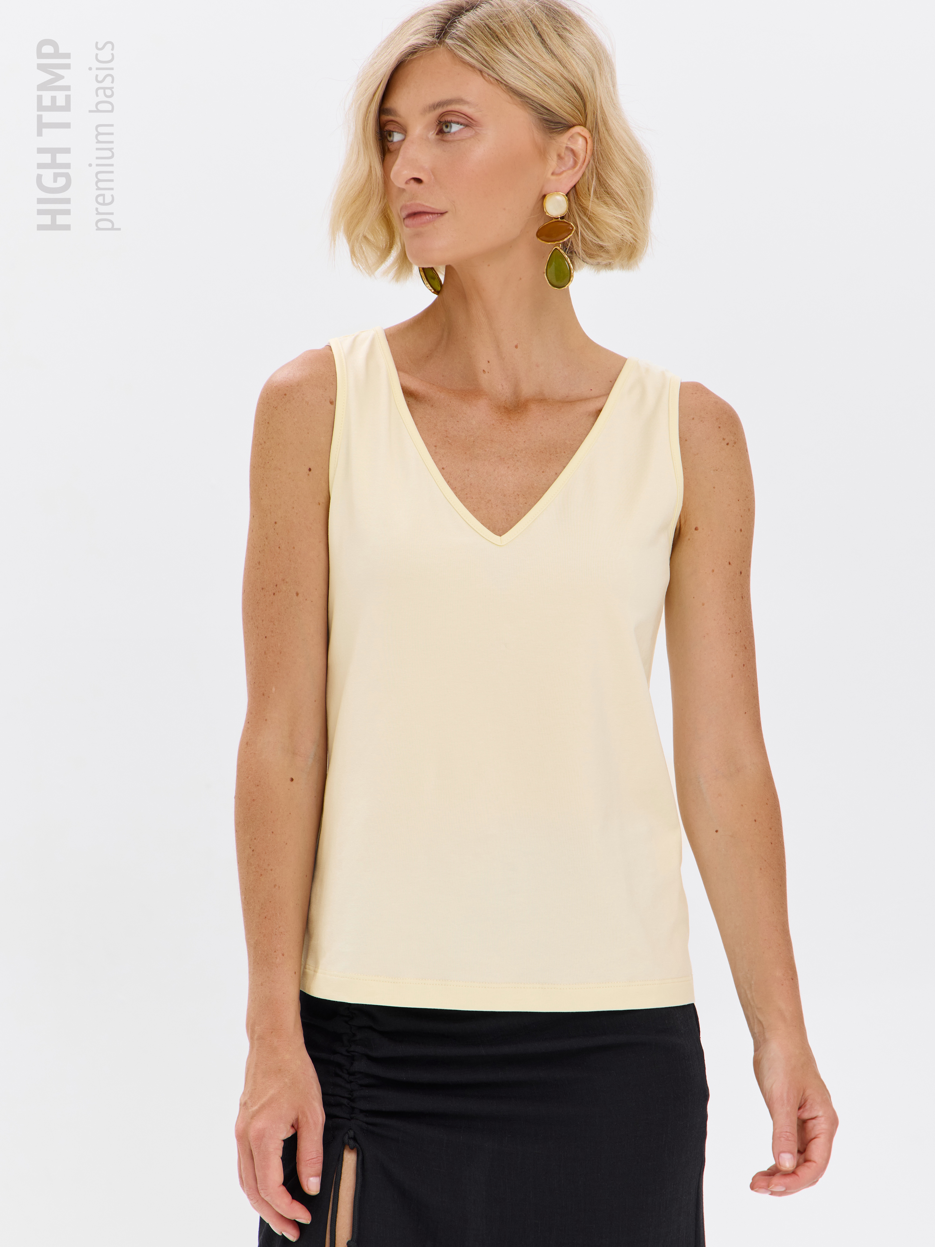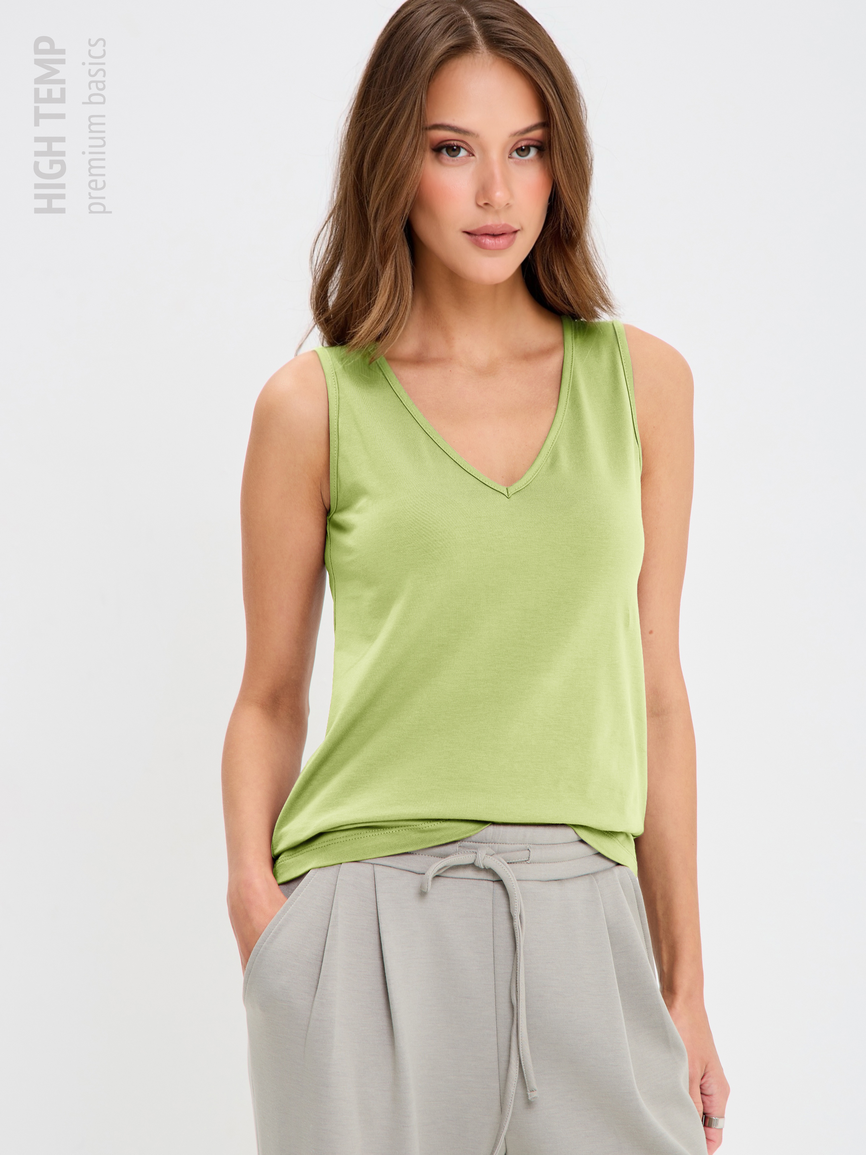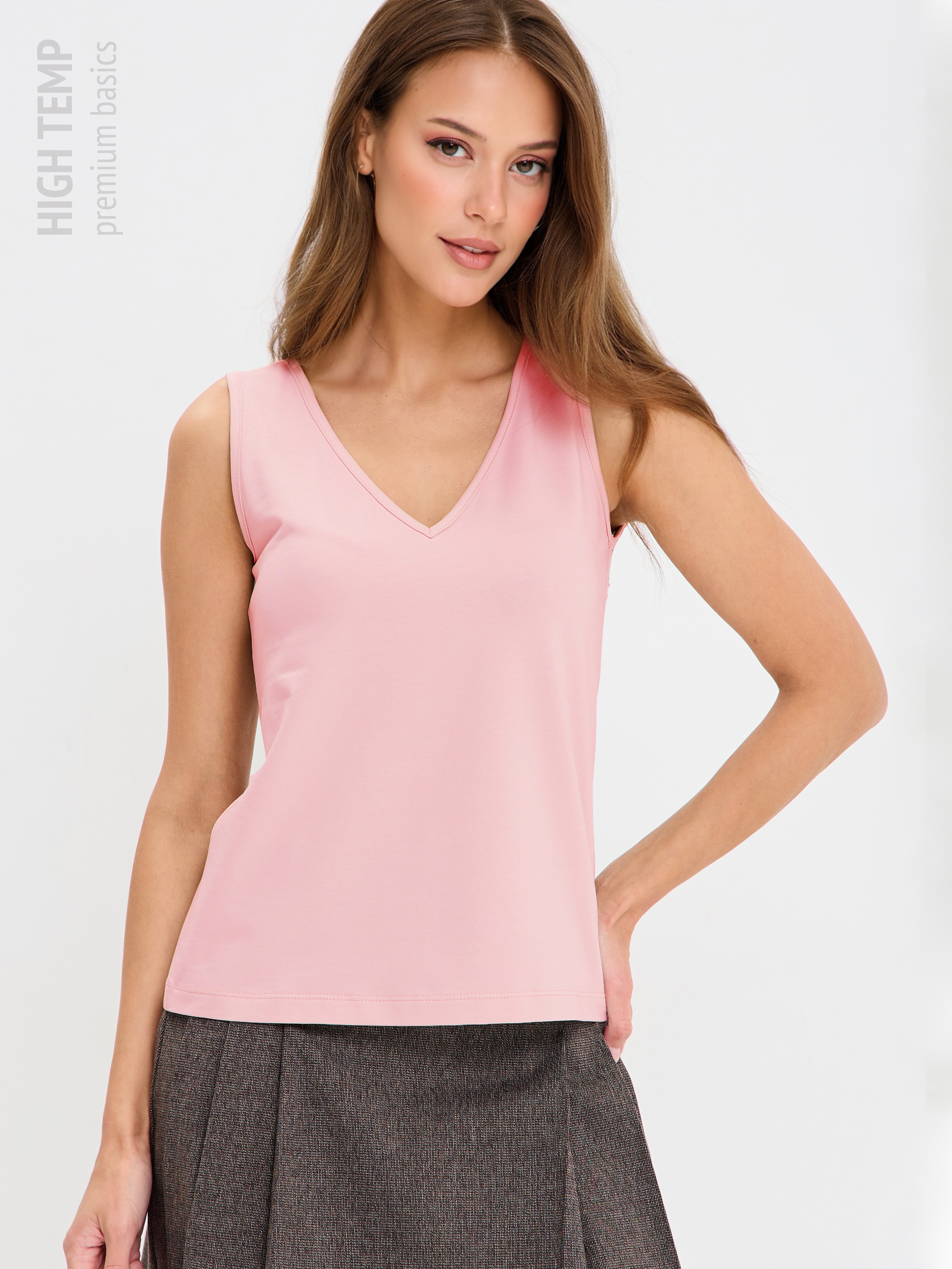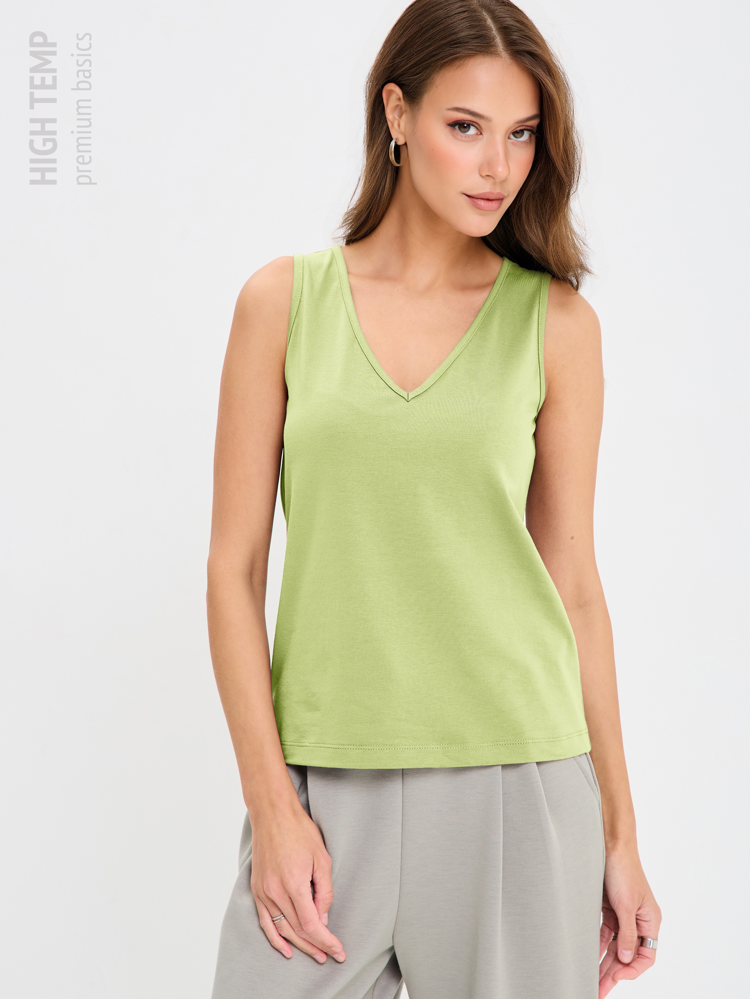 Базовый трикотажный однотонный топ с V-образным вырезом горловины - оптимальный выбор для лета и для офиса. Такая женская майка из хлопка идеальное дополнение к жакету, пиджаку или кардигану. Женский топ с треугольным вырезом благодаря своему натуральному составу можно использовать как спортивный, повседневный, как домашнюю одежду или пижаму. Полуприлегающий фасон футболки без рукавов эффектно подчеркивает грудь, а глубокий вырез горловины V-формы топа придает образу легкость и женственность. Топ женский летний на широких бретелях полностью закрывает лямки от белья и на плечах, и на спинке, поэтому в нем Вы всегда будете чувствовать себя свободно и уверенно. Бельевой топ из трикотажа заменит футболку или блузку, избавив от лишнего объема, что важно при создании многослойных образов. Открытая женская блузка в виде топа - трендовый предмет одежды женского гардероба на любой сезон. Модный фасон классической майки идеален для спортивной формы команды или для девичника, так как топ футбола подойдет для росписи и печати. Повседневный легкий хлопковый топик из натуральной ткани классической длины хорошо сочетается с джинсами и шортами, юбками и брючными костюмами, что делает его практичным и незаменимым в качестве майки на море или топа для прогулок или на выход. Стильная одежда для женщин большого и маленького размера актуальна всегда, даже если Вы ищите одежду для мамы или бабушки. Желто-оранжевый, черный, зелёный, бежевый, розовый классический топ с треугольным вырезом горловины под блейзер от HIGH TEMP - выбор для тех, кто ценит качество.