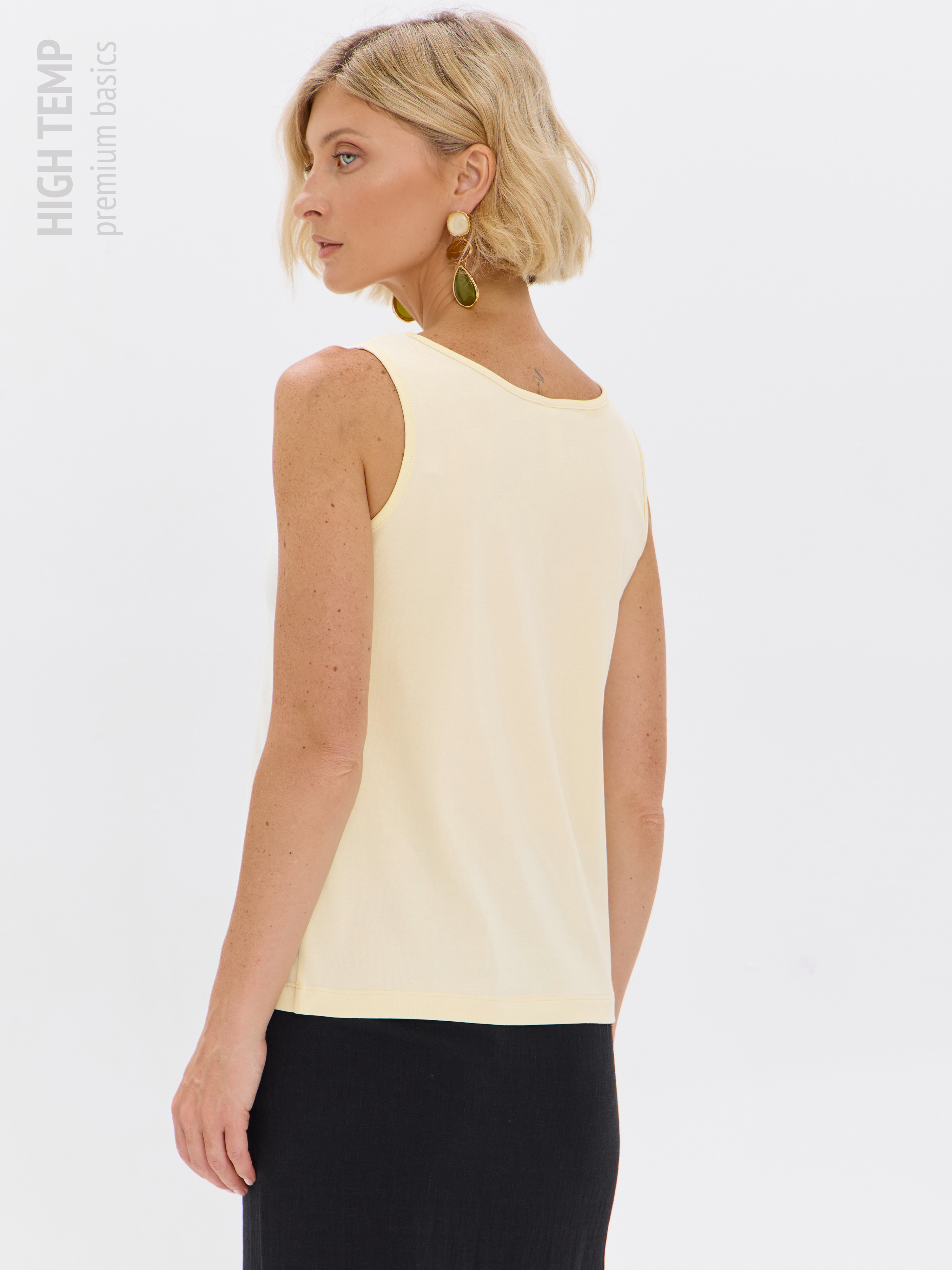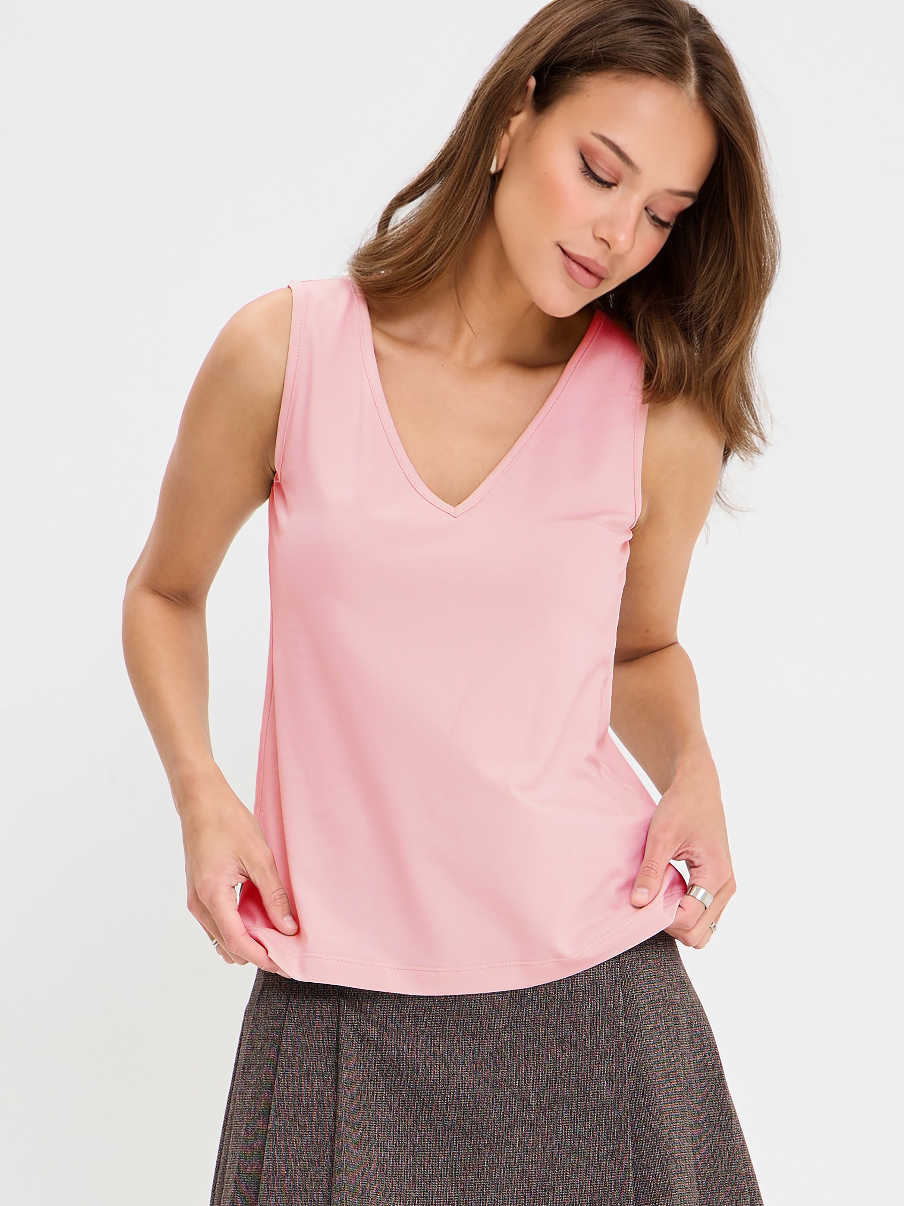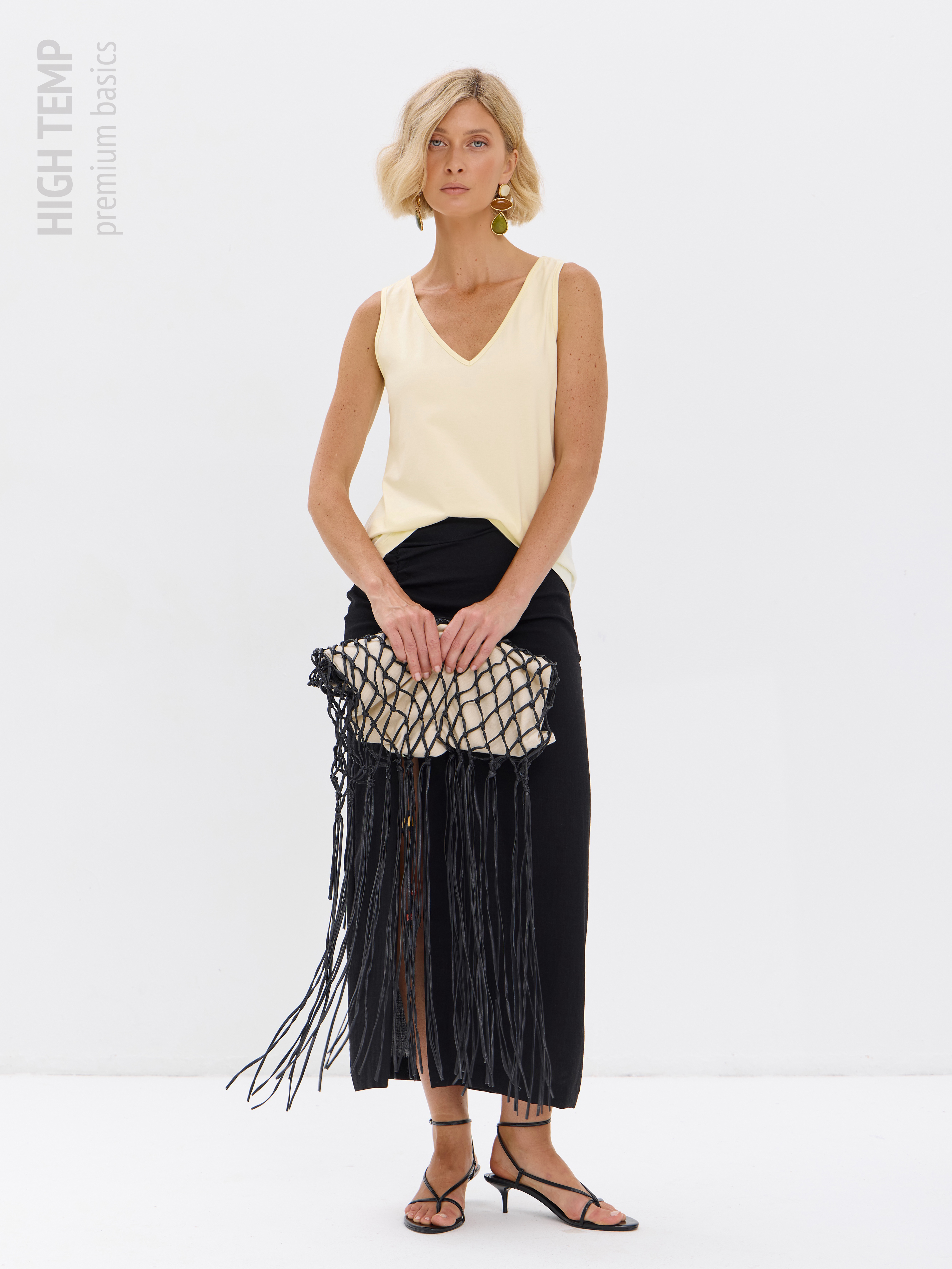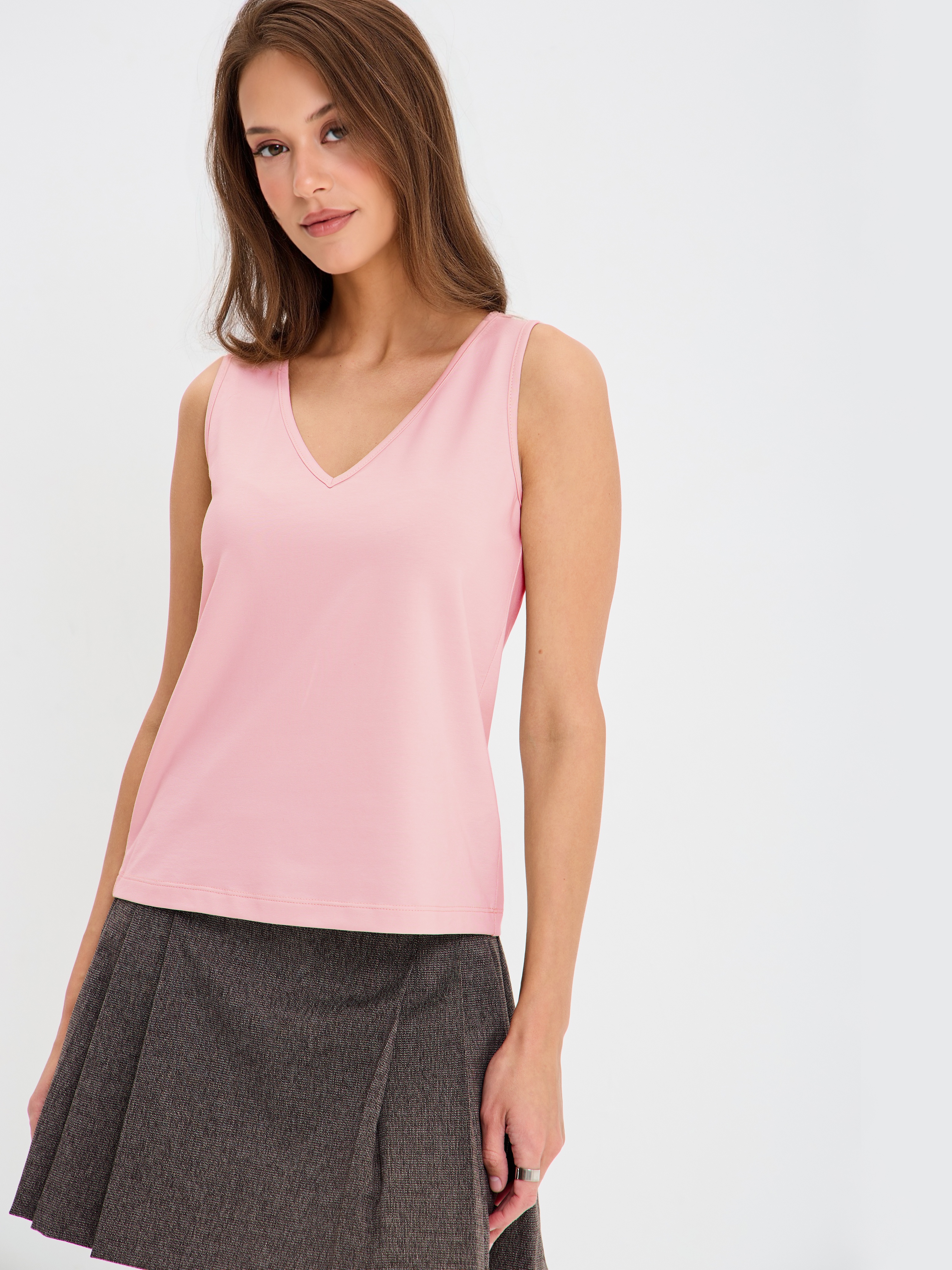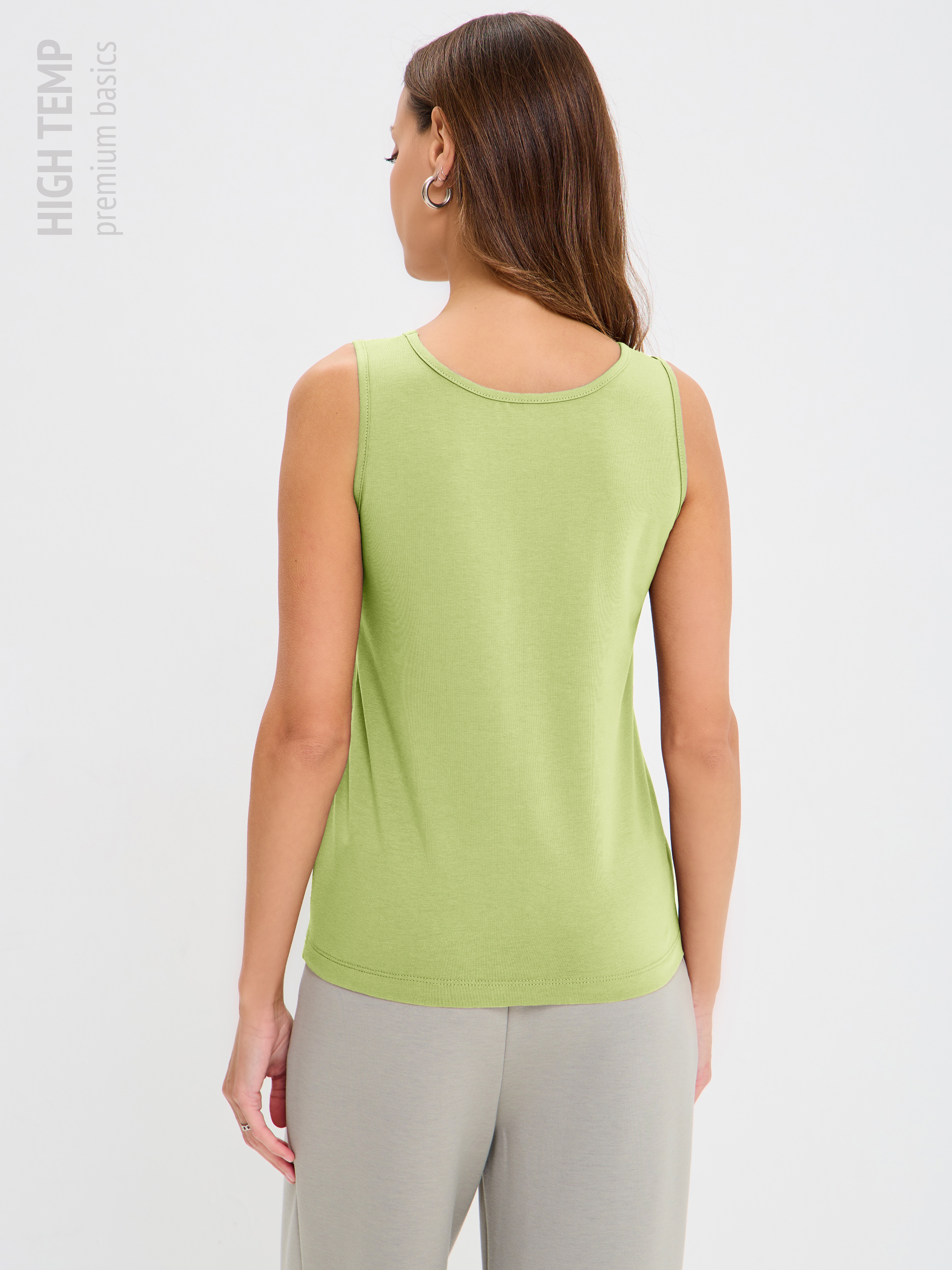Базовый трикотажный однотонный топ с V-образным вырезом горловины - оптимальный выбор для лета и для офиса. Такая женская майка из хлопка идеальное дополнение к жакету, пиджаку или кардигану. Женский топ с треугольным вырезом благодаря своему натуральному составу можно использовать как спортивный, повседневный, как домашнюю одежду или пижаму. Полуприлегающий фасон футболки без рукавов эффектно подчеркивает грудь, а глубокий вырез горловины V-формы топа придает образу легкость и женственность. Топ женский летний на широких бретелях полностью закрывает лямки от белья и на плечах, и на спинке, поэтому в нем Вы всегда будете чувствовать себя свободно и уверенно. Бельевой топ из трикотажа заменит футболку или блузку, избавив от лишнего объема, что важно при создании многослойных образов. Открытая женская блузка в виде топа - трендовый предмет одежды женского гардероба на любой сезон. Модный фасон классической майки идеален для спортивной формы команды или для девичника, так как топ футбола подойдет для росписи и печати. Повседневный легкий хлопковый топик из натуральной ткани классической длины хорошо сочетается с джинсами и шортами, юбками и брючными костюмами, что делает его практичным и незаменимым в качестве майки на море или топа для прогулок или на выход. Стильная одежда для женщин большого и маленького размера актуальна всегда, даже если Вы ищите одежду для мамы или бабушки. Желто-оранжевый, черный, зелёный, бежевый, розовый классический топ с треугольным вырезом горловины под блейзер от HIGH TEMP - выбор для тех, кто ценит качество.