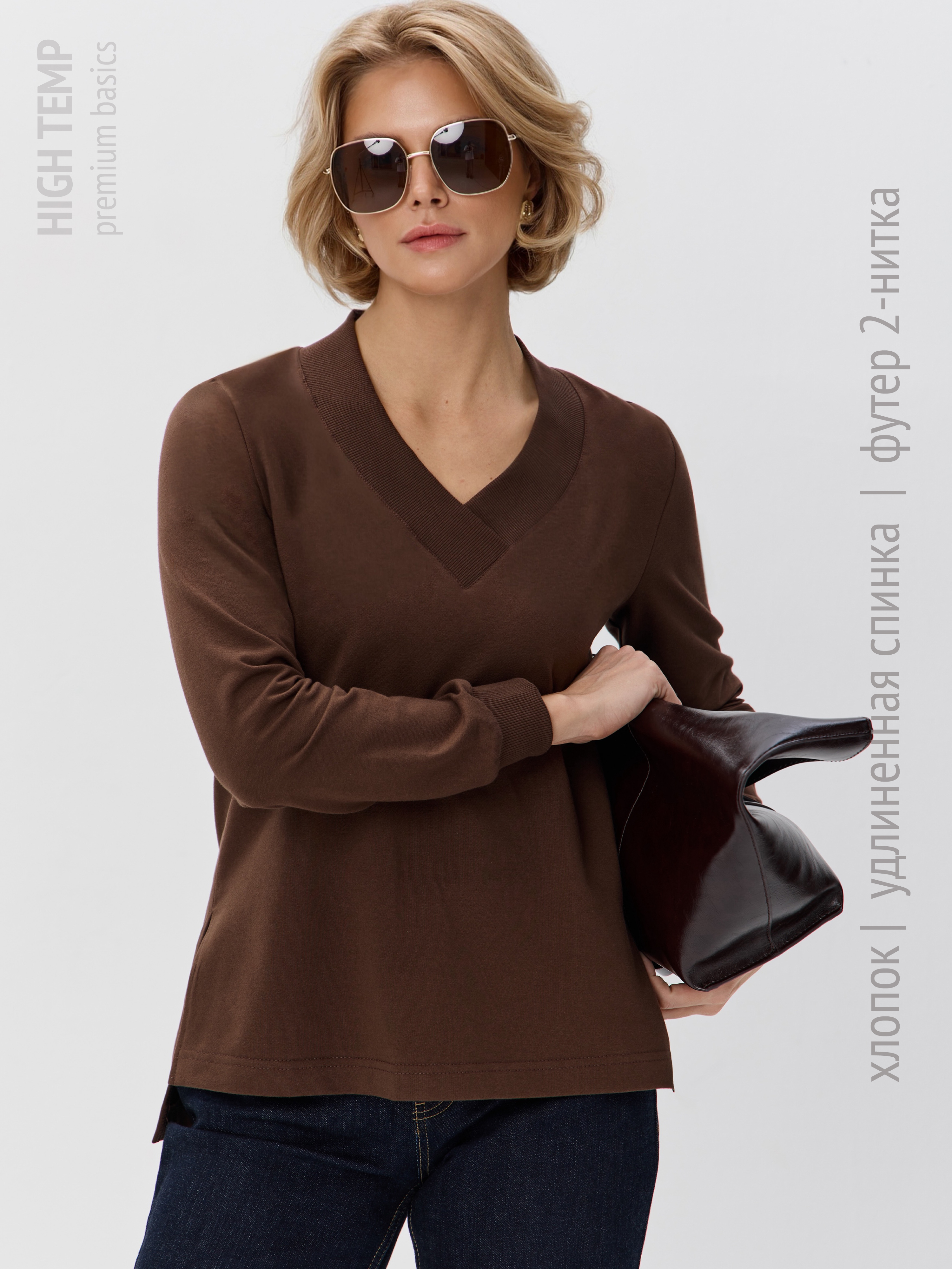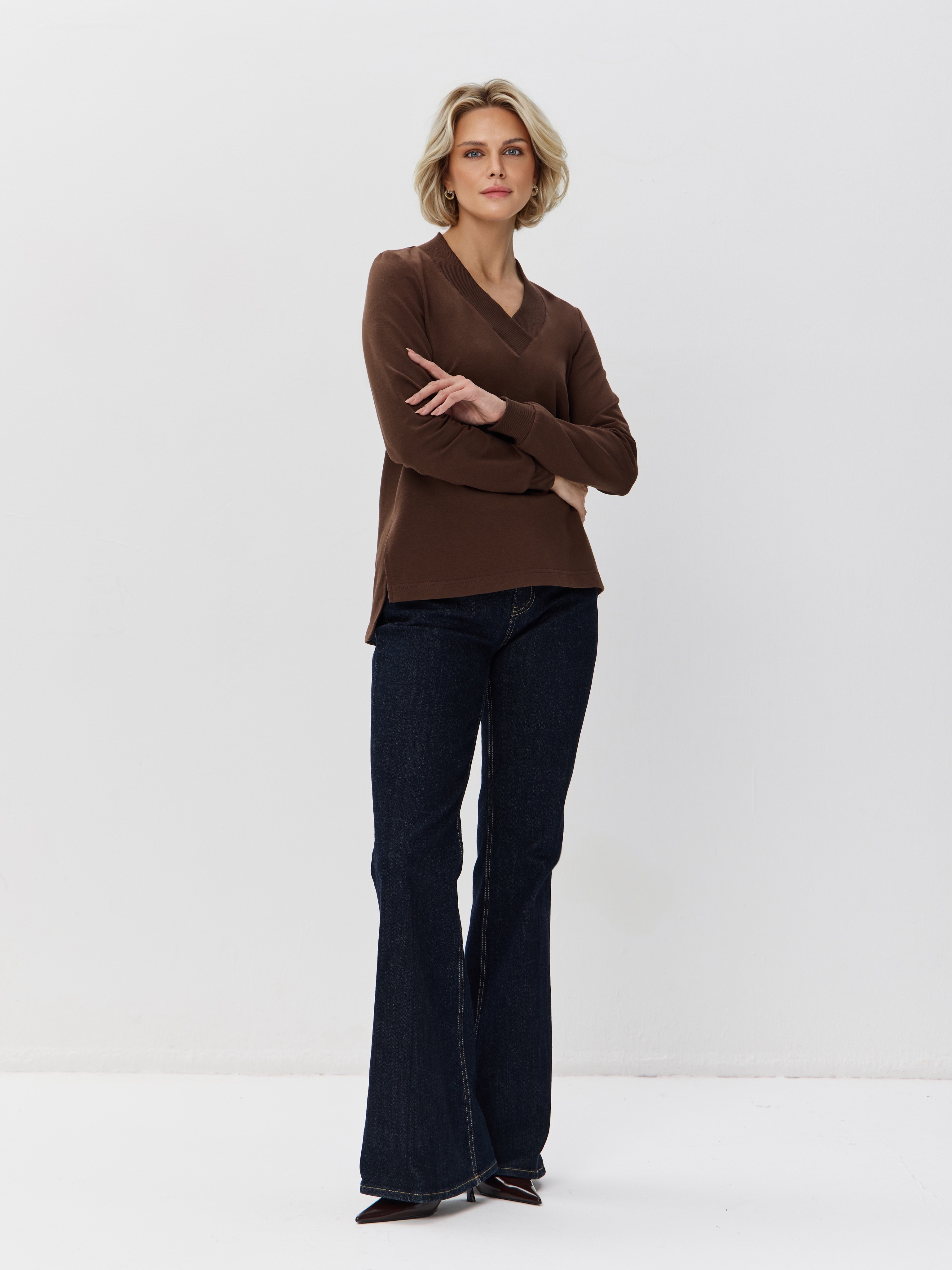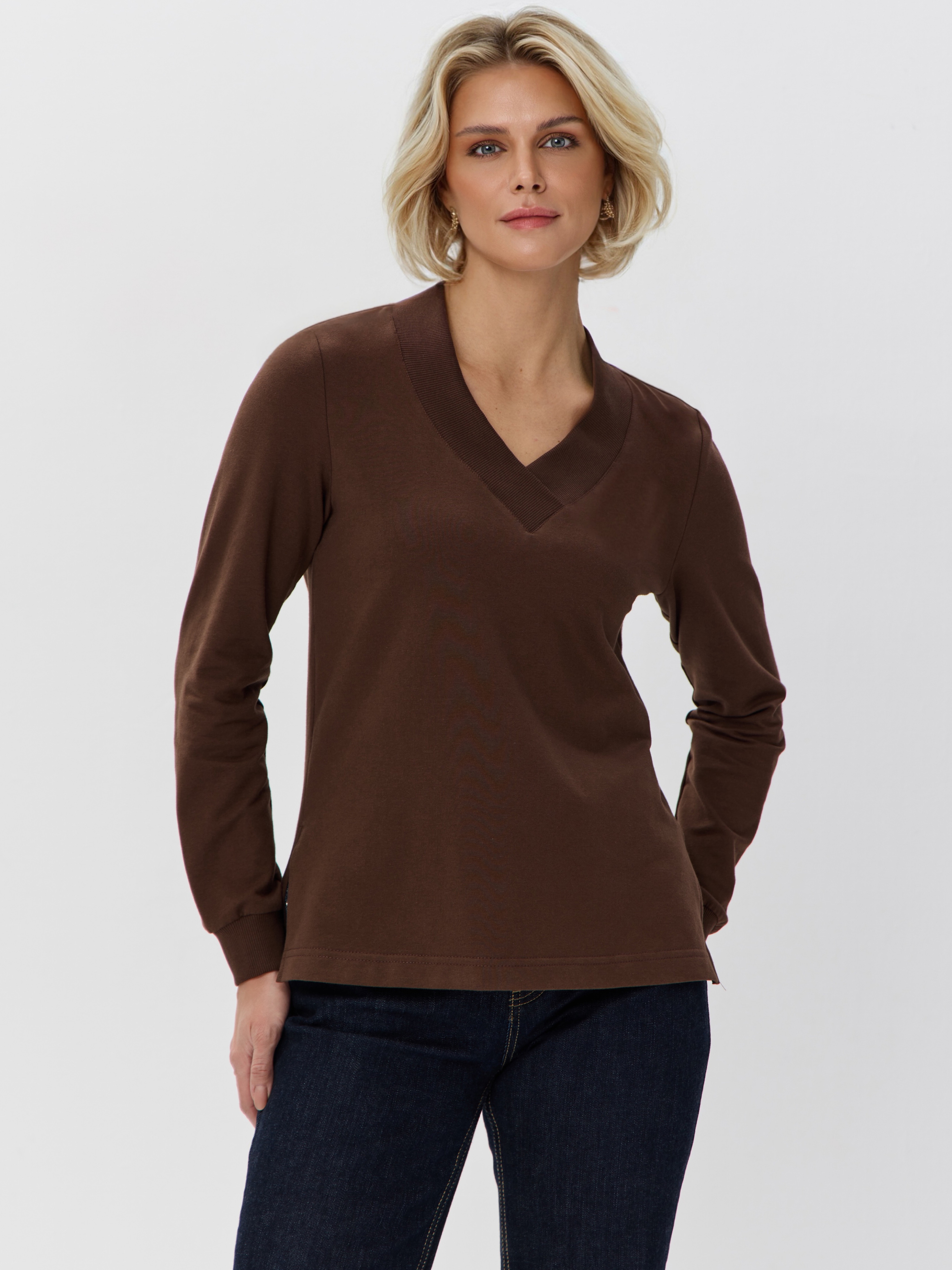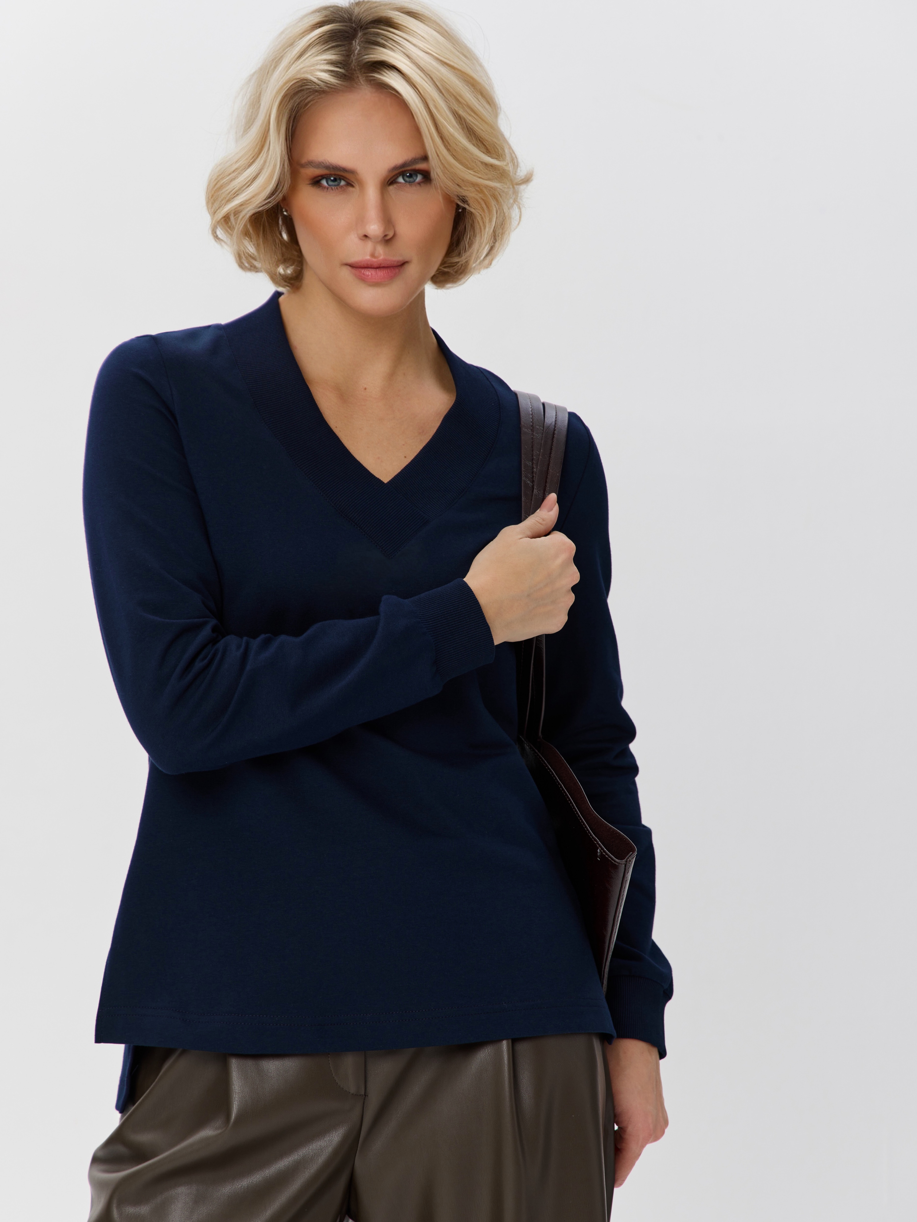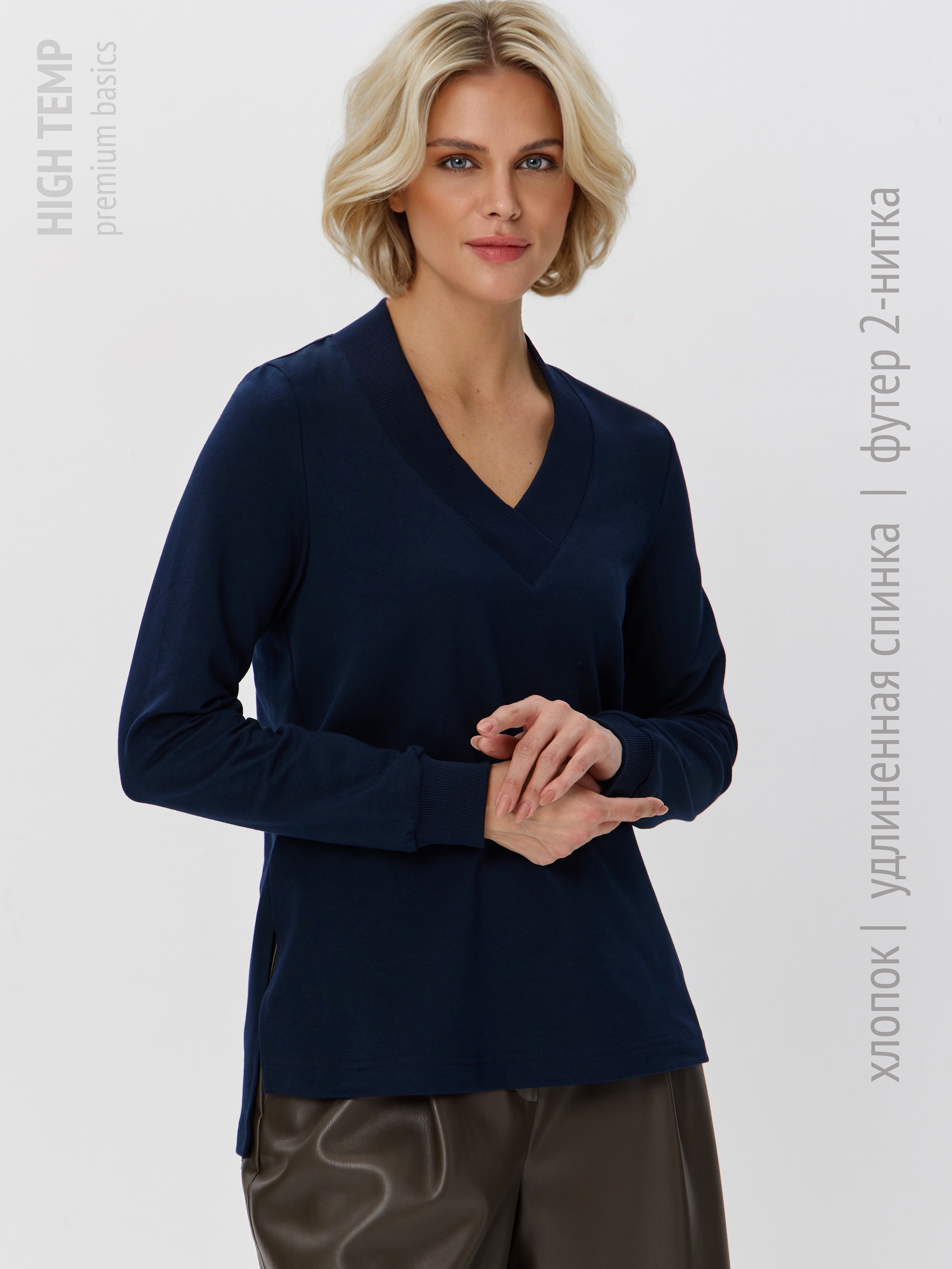 1095F2 Свитшот с V-образным вырезом и разрезами по бокам. Равновеликая длина переда и спинки придает толстовке непринужденности, а Вам дарит дополнительный комфорт. Кофта выполнена из облегченного футера 2-нитки (92% хлопок, 8% эластан) благодаря чему тело дышит. Кофточка с V-вырезом идеально дополнит и брюки, и юбки любого стиля. Свитшот с треугольным вырезом можно носить с монохромными брюками в виде костюма.