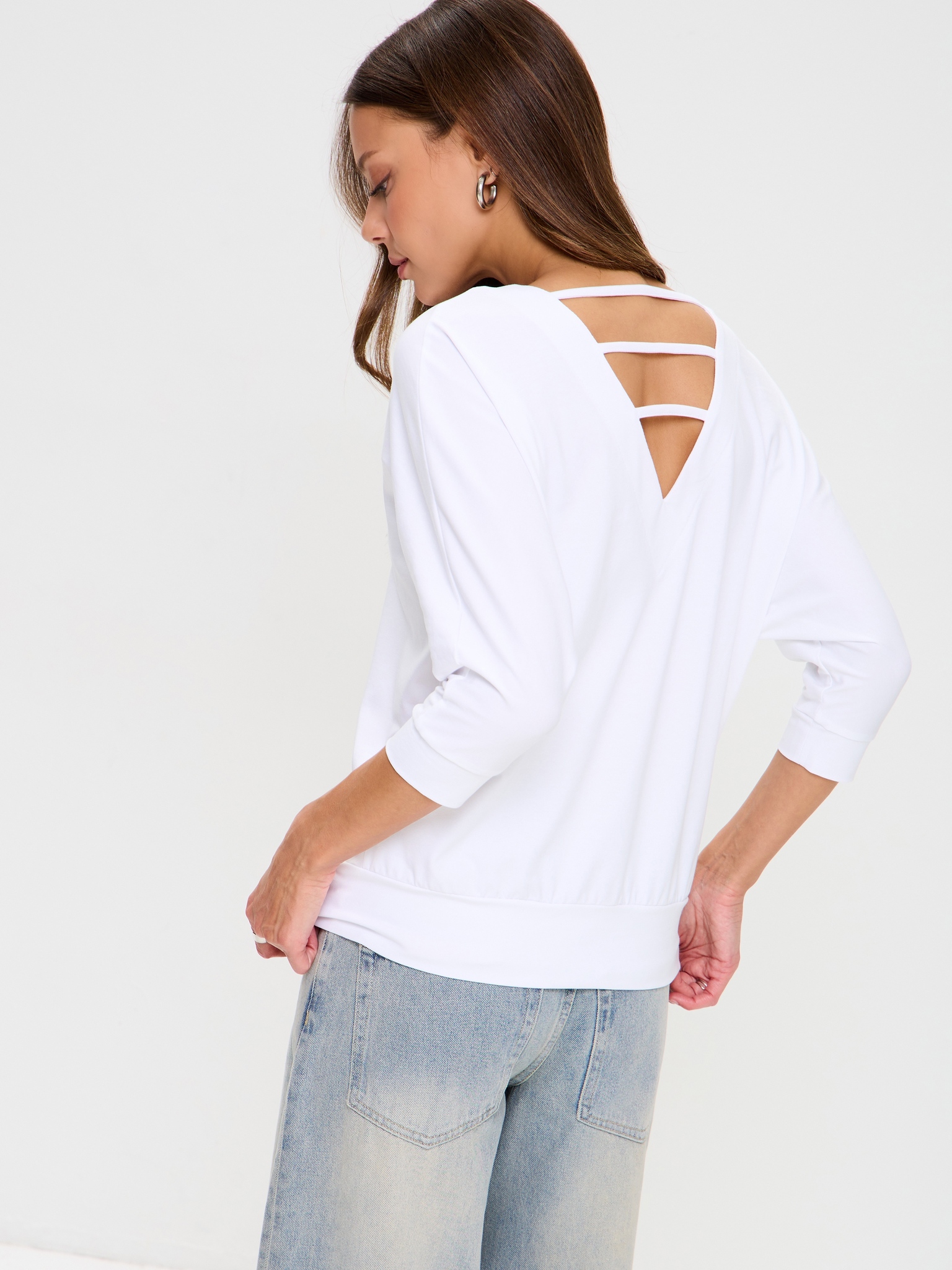 Оригинальный дизайн футболки привлекает внимание. Декоративные планки на спинке добавляют изюминку в образ. V-вырез горловины подчеркнет грудь и добавит женственности. Короткий рукав-крыло дополнит образ и сделает его более модным. Футболка выполнена из натуральной ткани, что обеспечивает комфорт и легкость.