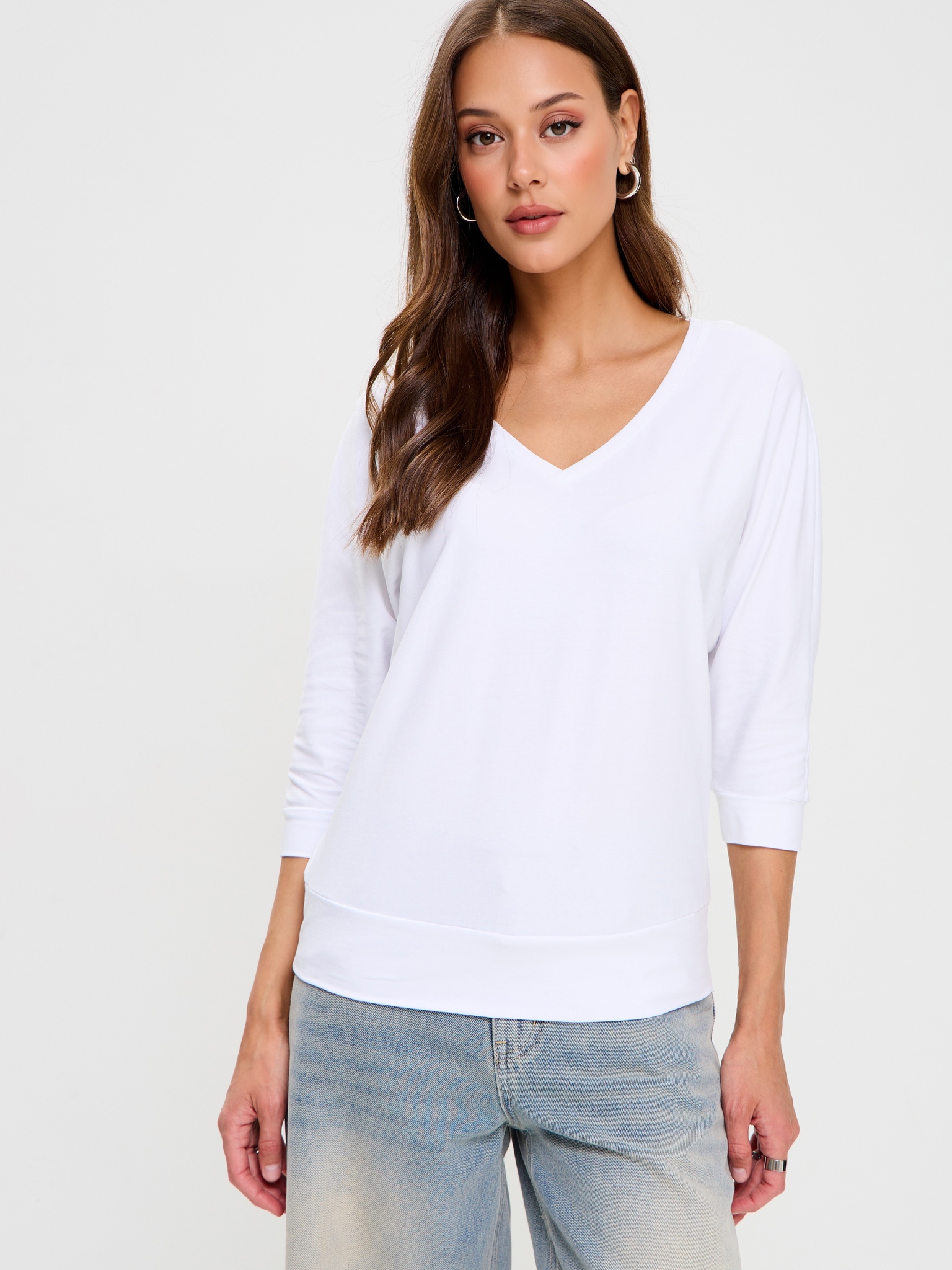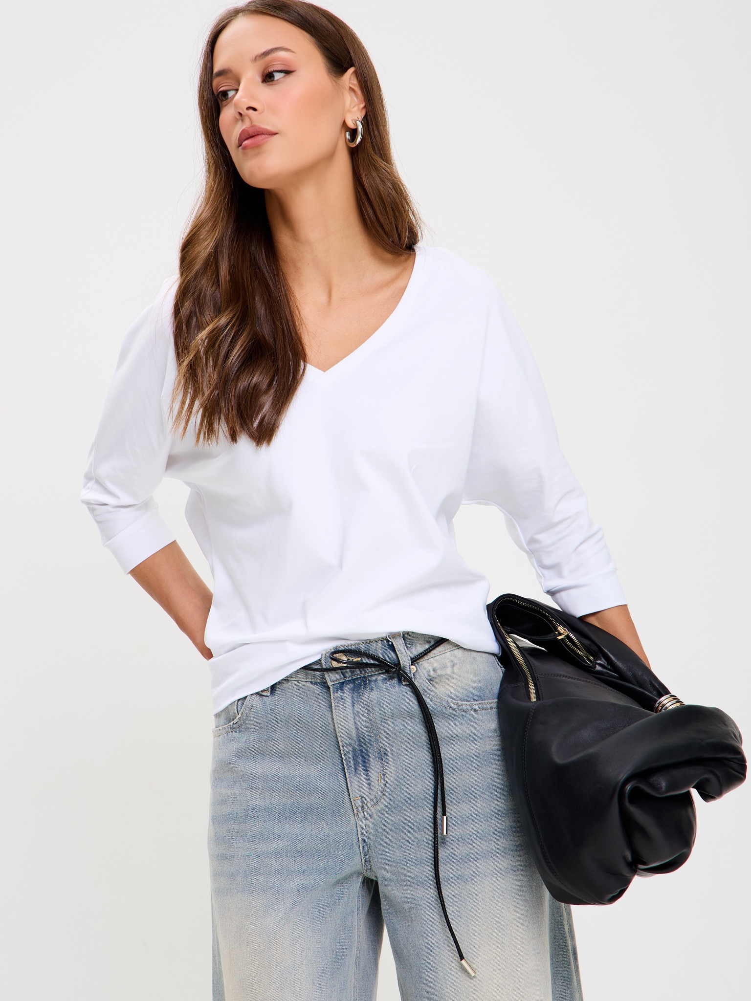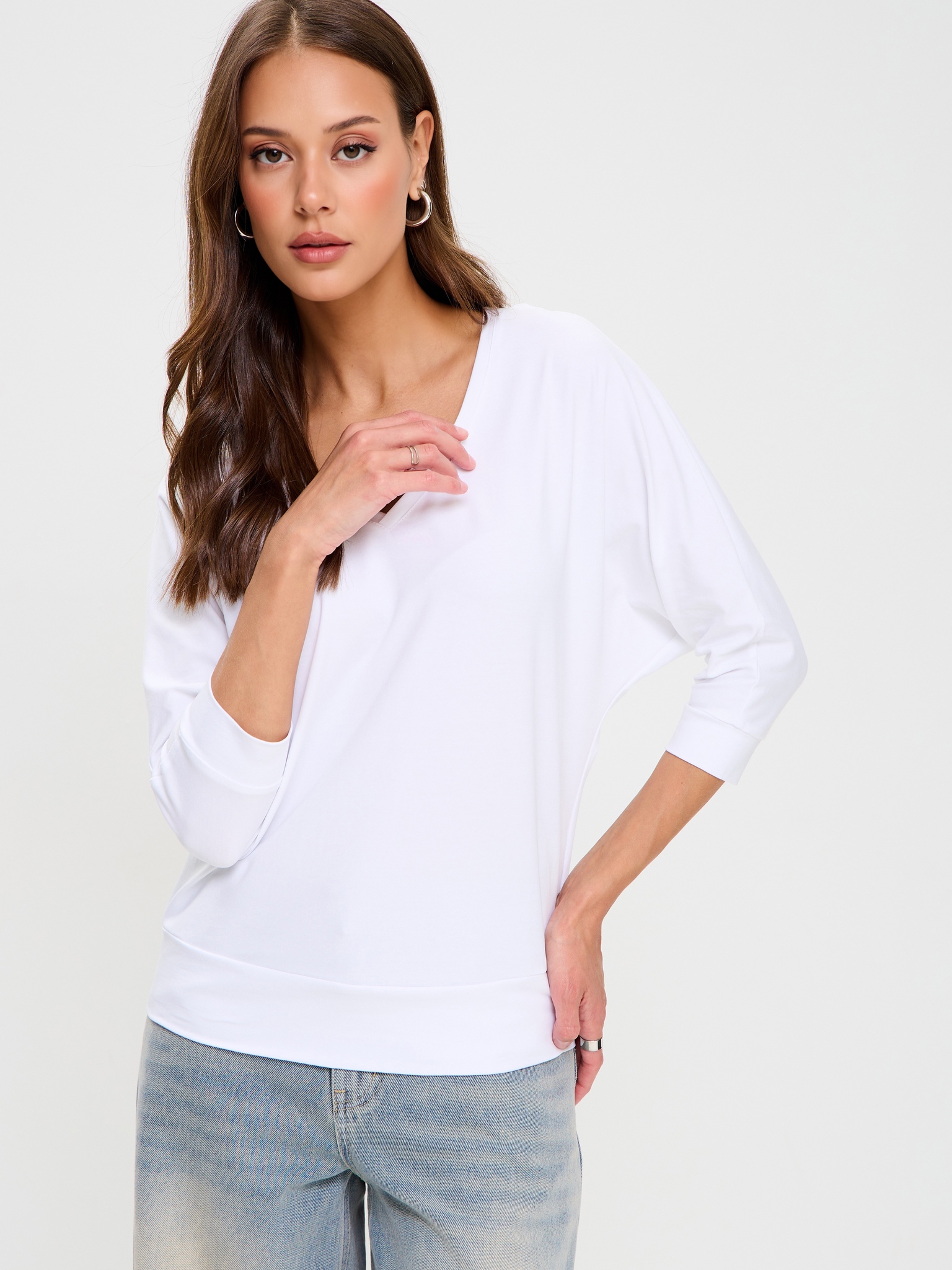 Свободная футболка летучая мышь - идеальный выбор для женщин, которые ценят комфорт и стиль. Эта вещь подходит для повседневной носки, офисного стиля, а также для вечерних выходов. Благодаря свободному покрою и спущенному плечу, футболка легко подойдет для любой фигуры и не сковывает движений.