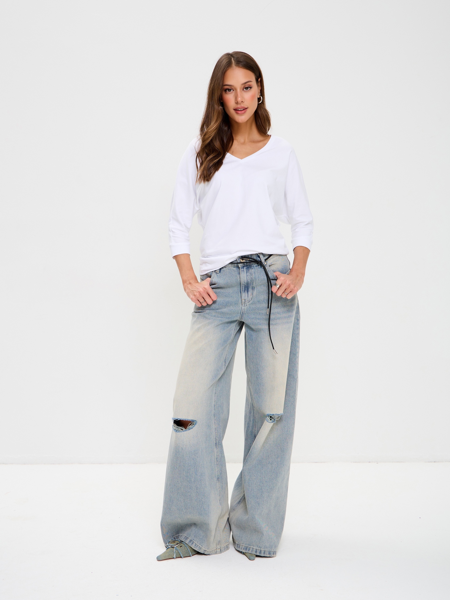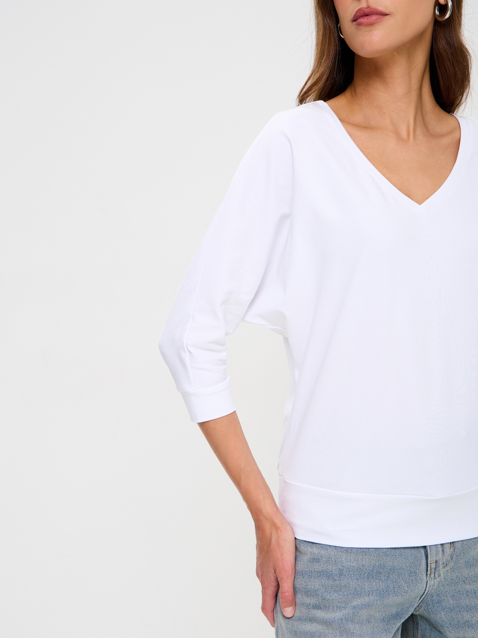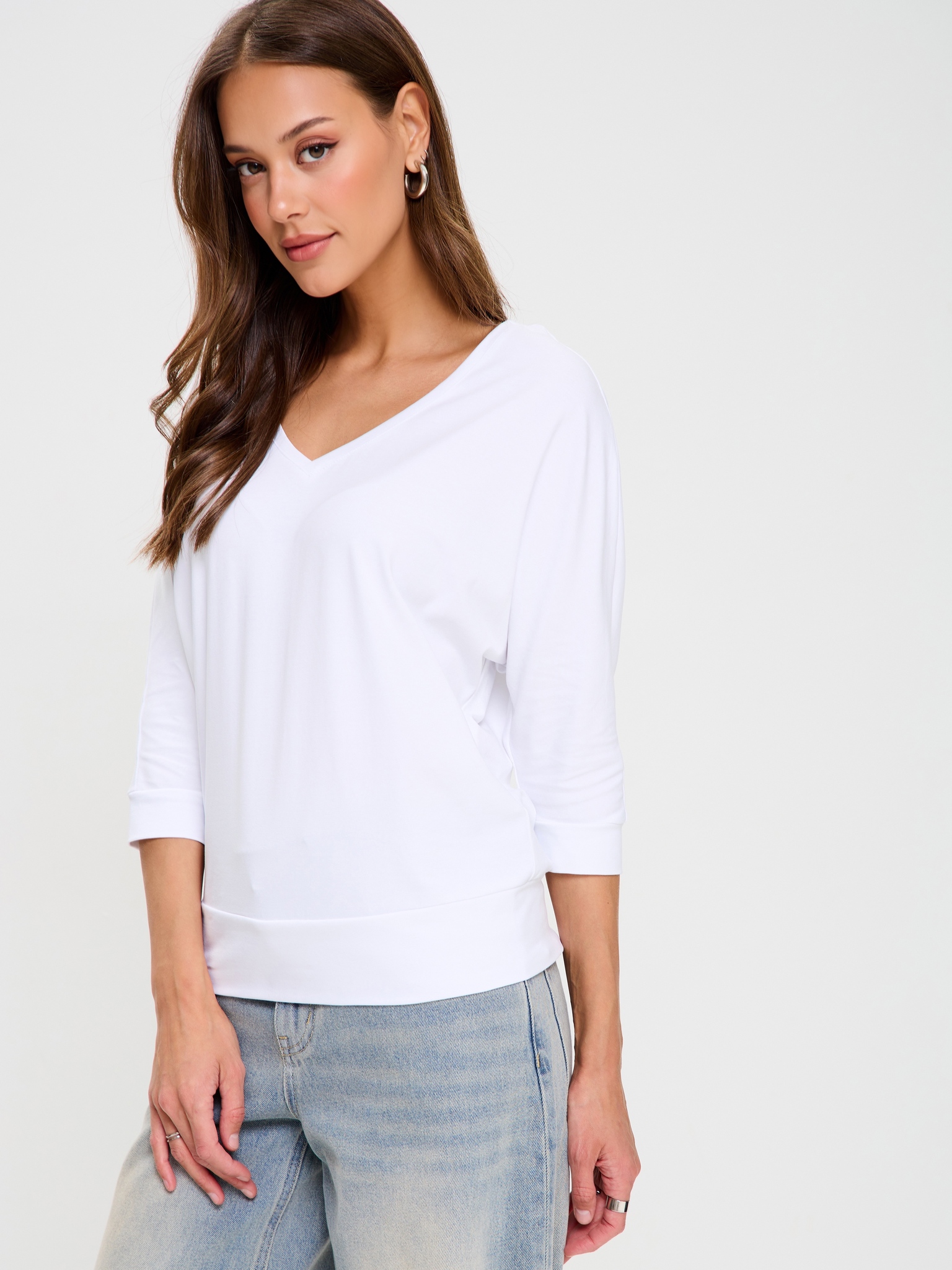 Свободная футболка летучая мышь - идеальный выбор для женщин, которые ценят комфорт и стиль. Эта вещь подходит для повседневной носки, офисного стиля, а также для вечерних выходов. Благодаря свободному покрою и спущенному плечу, футболка легко подойдет для любой фигуры и не сковывает движений.