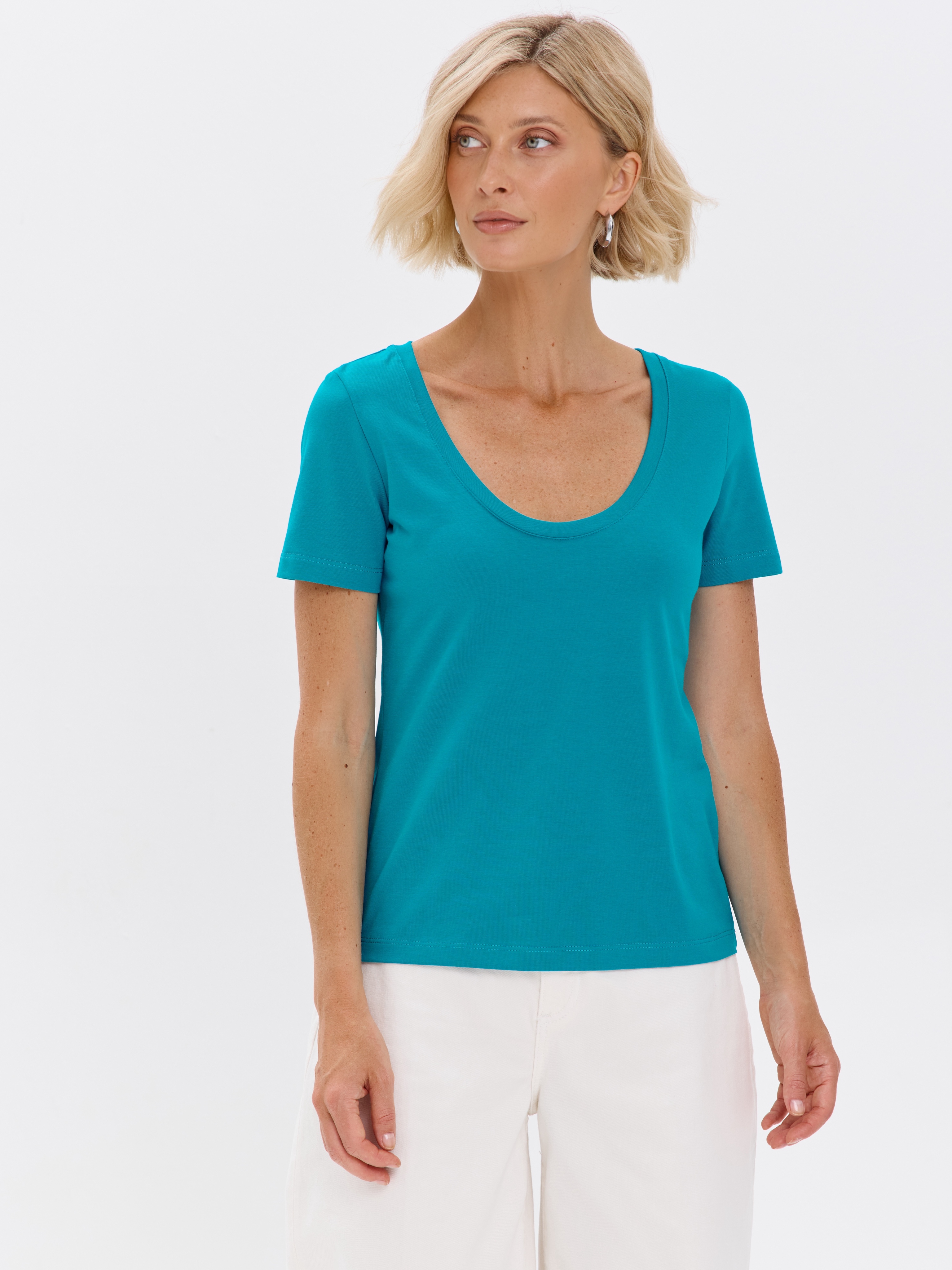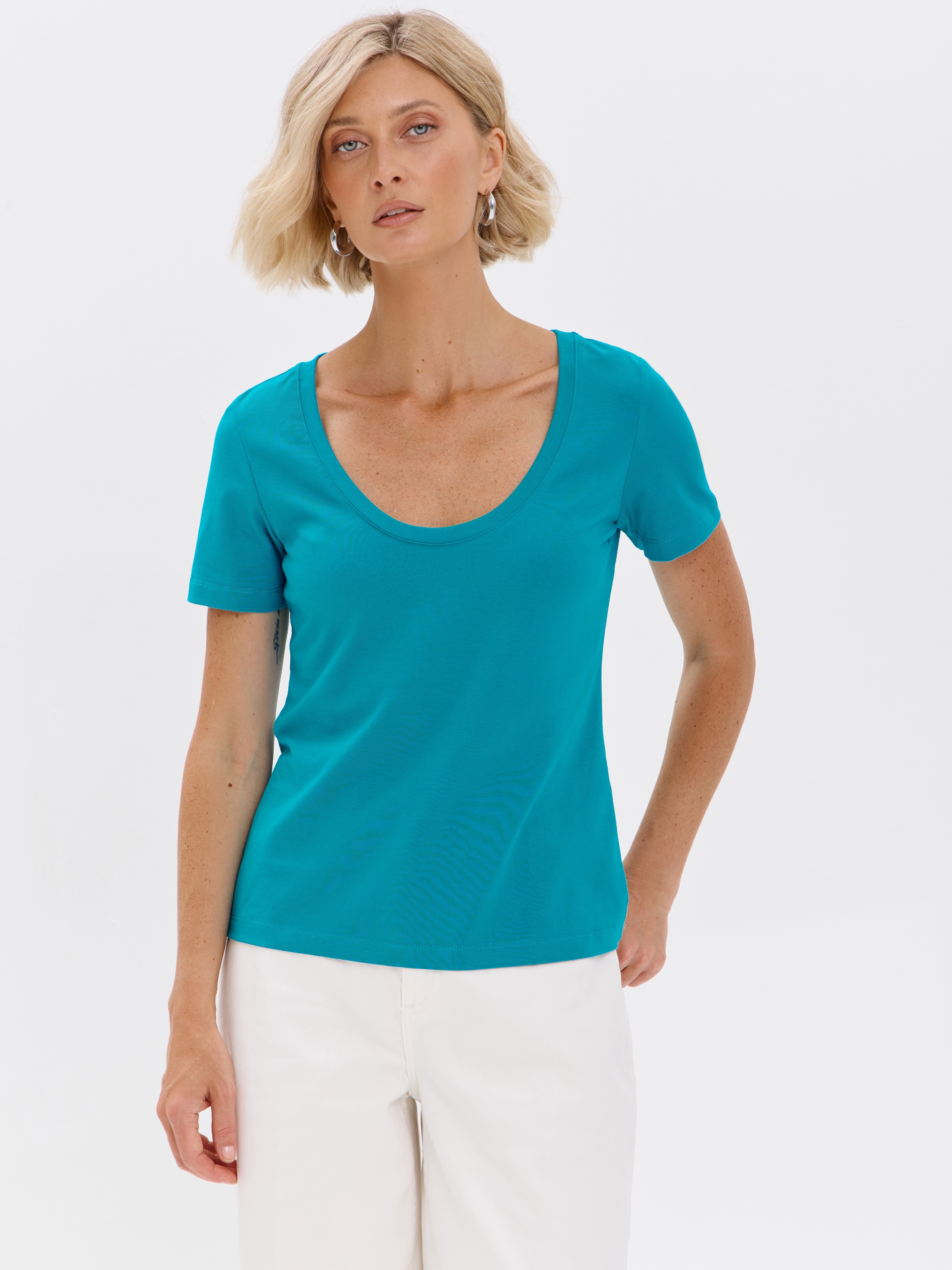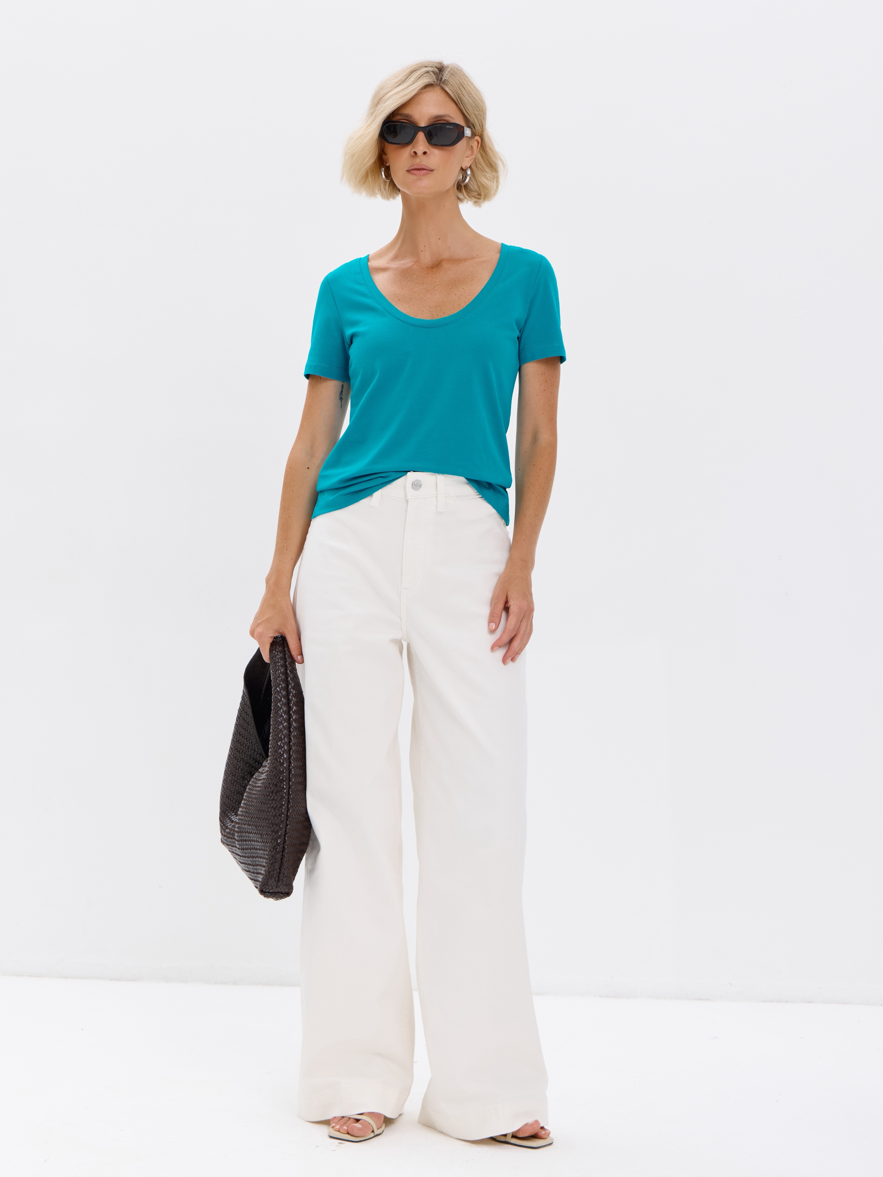 Однотонная базовая футболка с глубоким круглым вырезом горловины полуприлегающего силуэта и короткими рукавами. Округлый вырез сексуально подчеркивает зону декольте. Фасон кофточки позволяет использовать футболку как повседневную в офис или в школу. Футболка из натурального хлопка (пенье с добавлением эластана) дает возможность коже дышать, чувствуя себя комфортно даже в жаркую погоду и отлично подойдет для фитнесса, став изящной спортивной футболкой, т.к. материал не теряет форму, не пилингуется и не дает усадку после стирки, обладает высокой воздухопроницаемостью. Трикотажная классическая белая футболка. Женская хлопковая футболка подойдет для росписи и принта, на любой тип и размер фигуры, в том числе для больших размеров.