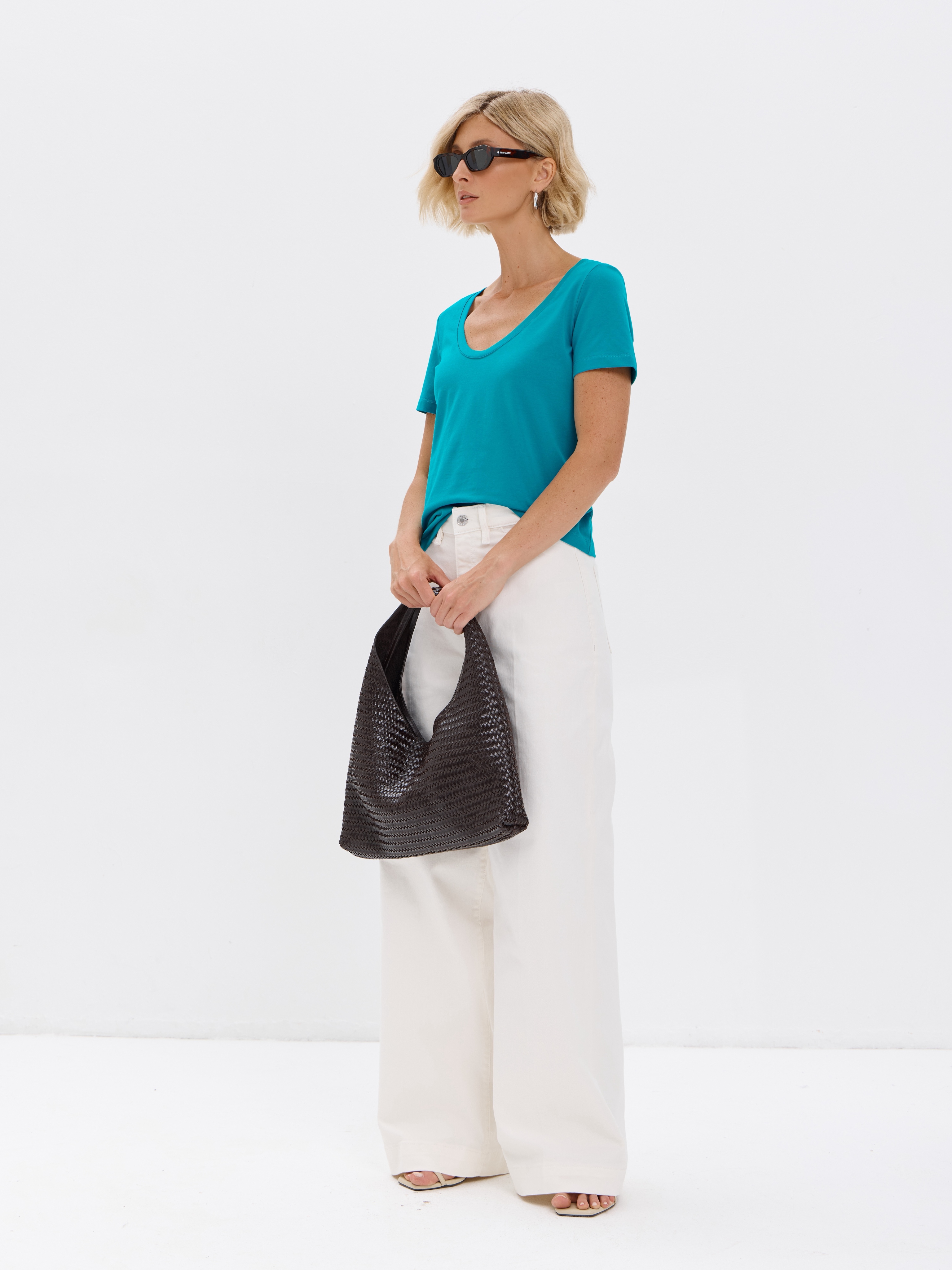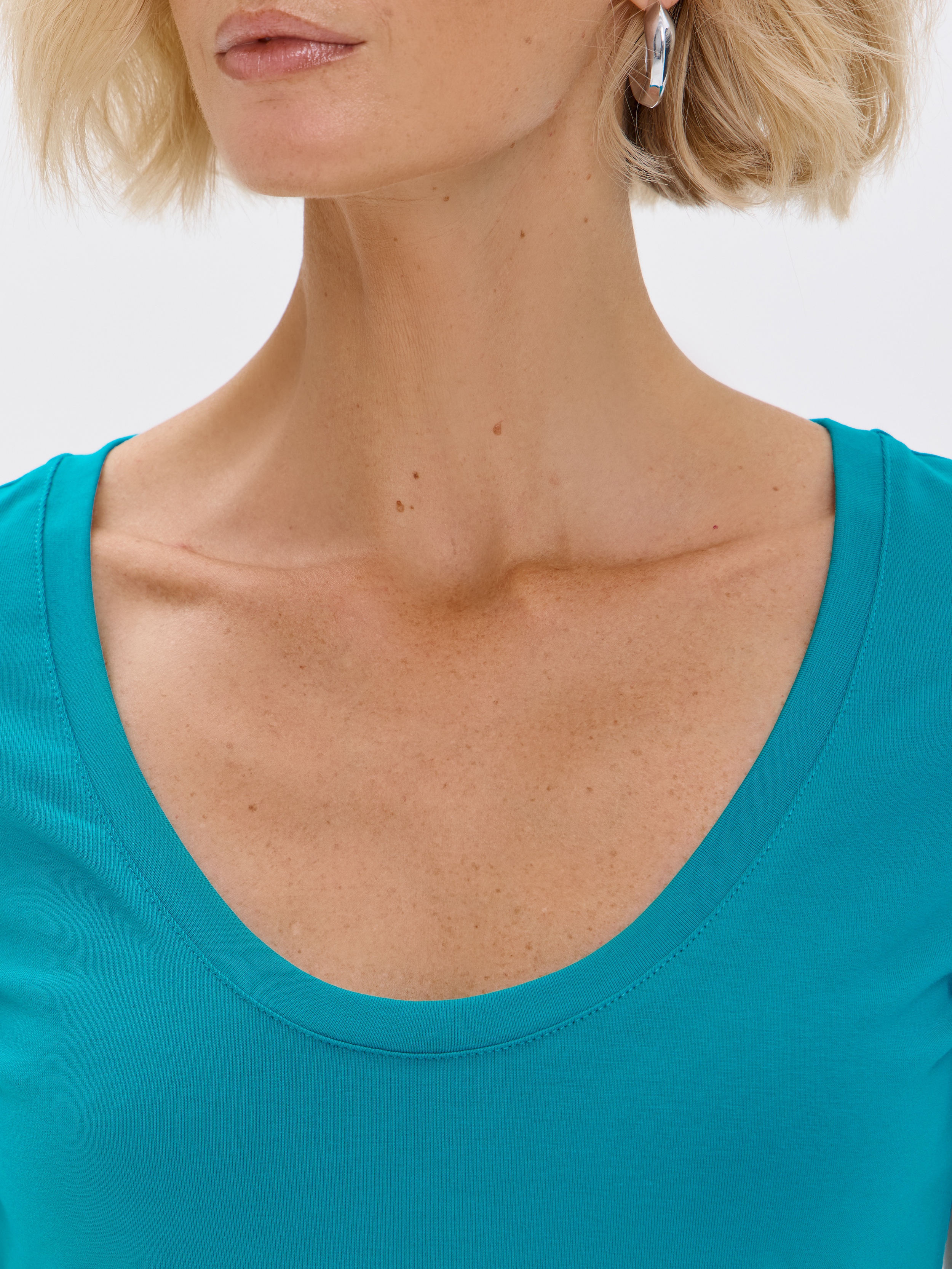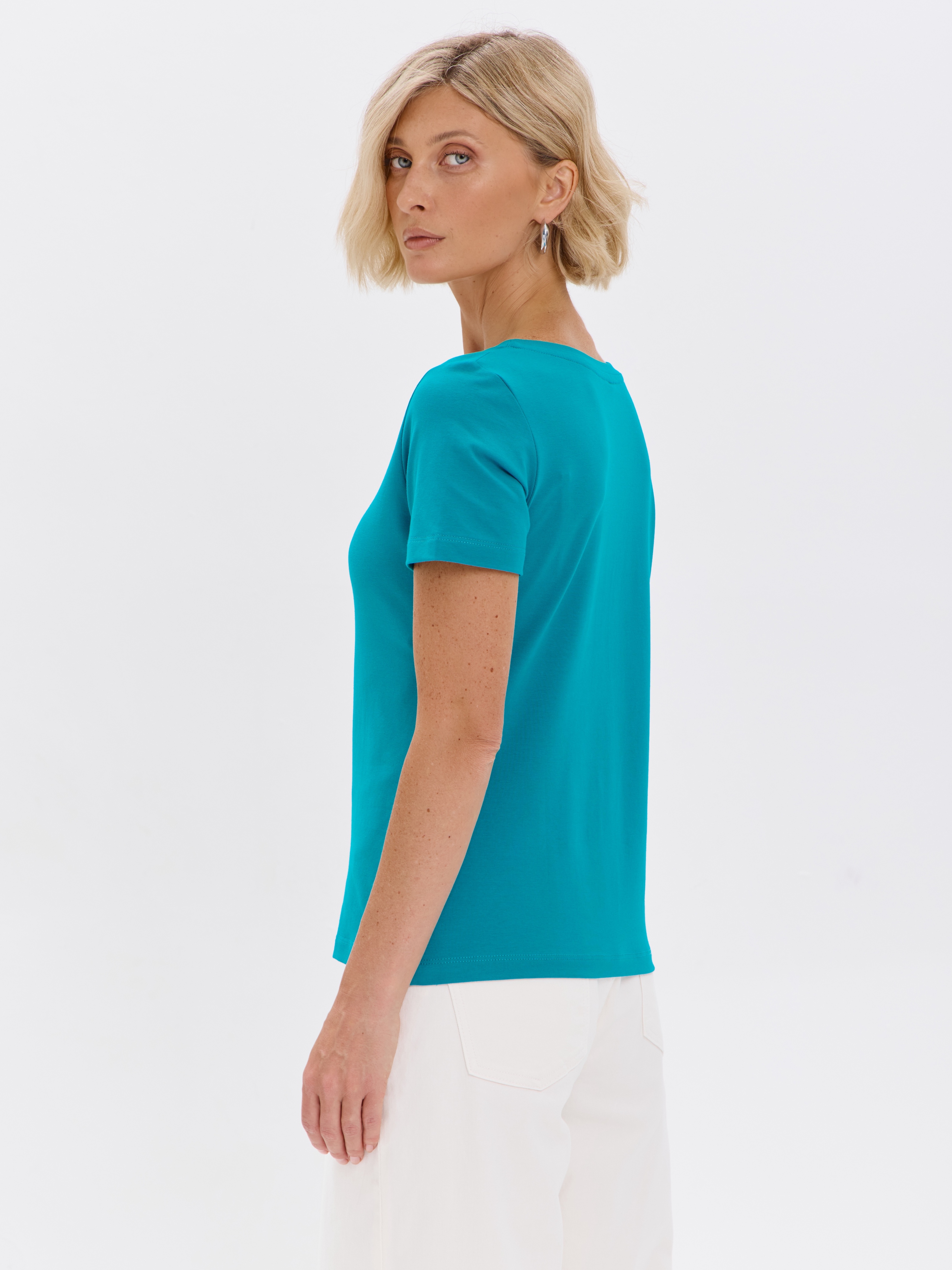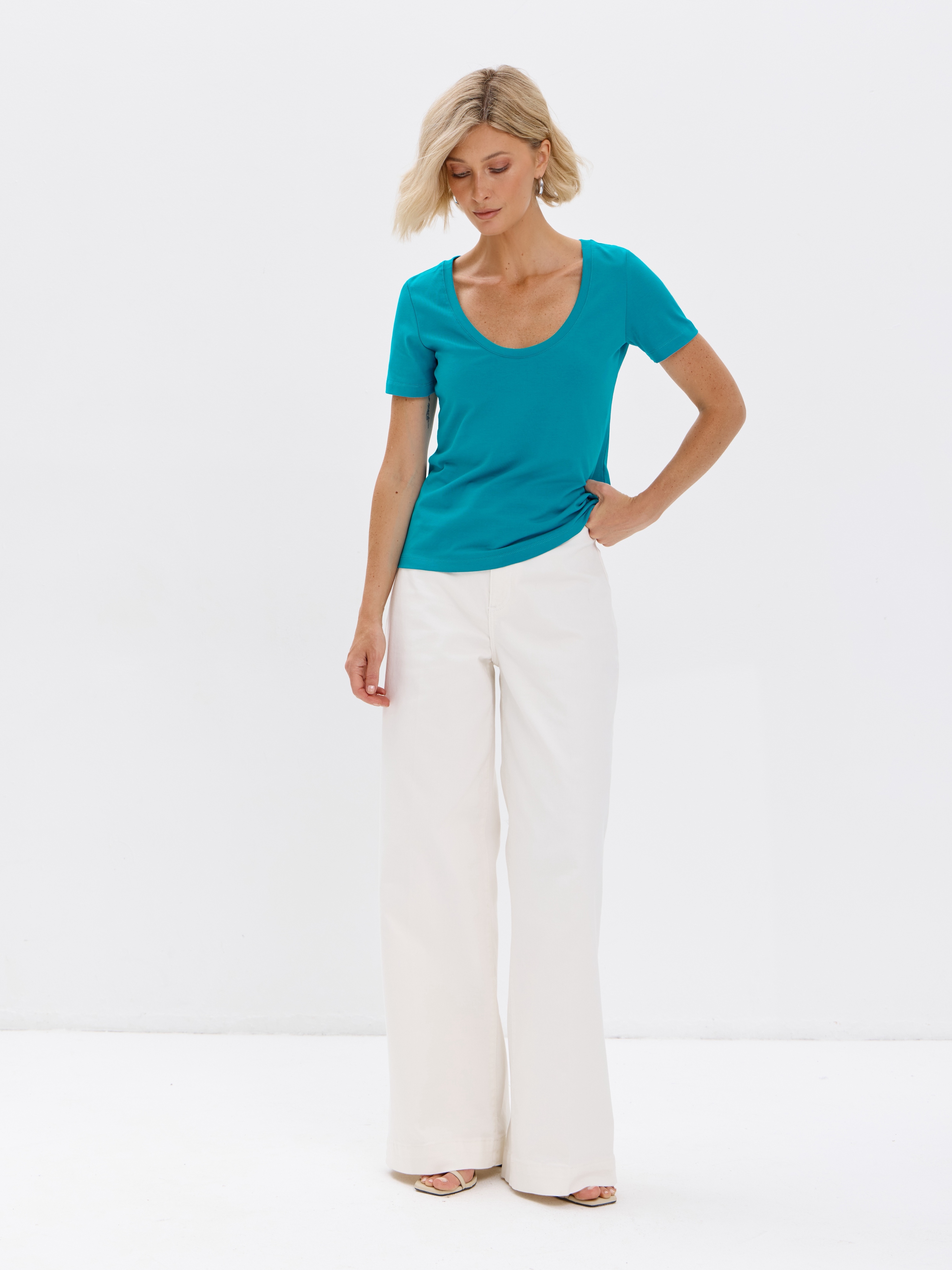 Однотонная базовая футболка с глубоким круглым вырезом горловины полуприлегающего силуэта и короткими рукавами. Округлый вырез сексуально подчеркивает зону декольте. Фасон кофточки позволяет использовать футболку как повседневную в офис или в школу. Футболка из натурального хлопка (пенье с добавлением эластана) дает возможность коже дышать, чувствуя себя комфортно даже в жаркую погоду и отлично подойдет для фитнесса, став изящной спортивной футболкой, т.к. материал не теряет форму, не пилингуется и не дает усадку после стирки, обладает высокой воздухопроницаемостью. Трикотажная классическая белая футболка. Женская хлопковая футболка подойдет для росписи и принта, на любой тип и размер фигуры, в том числе для больших размеров.