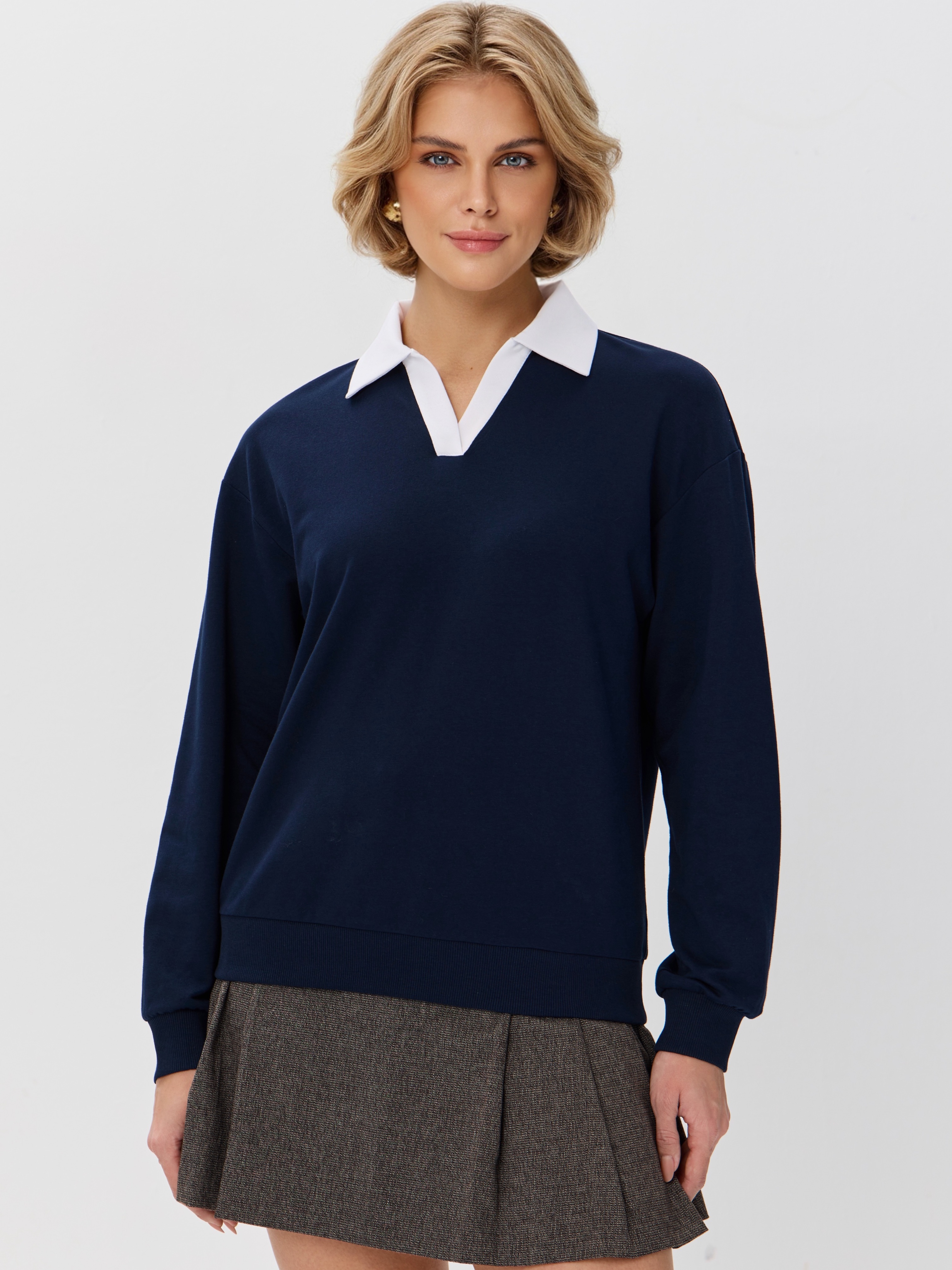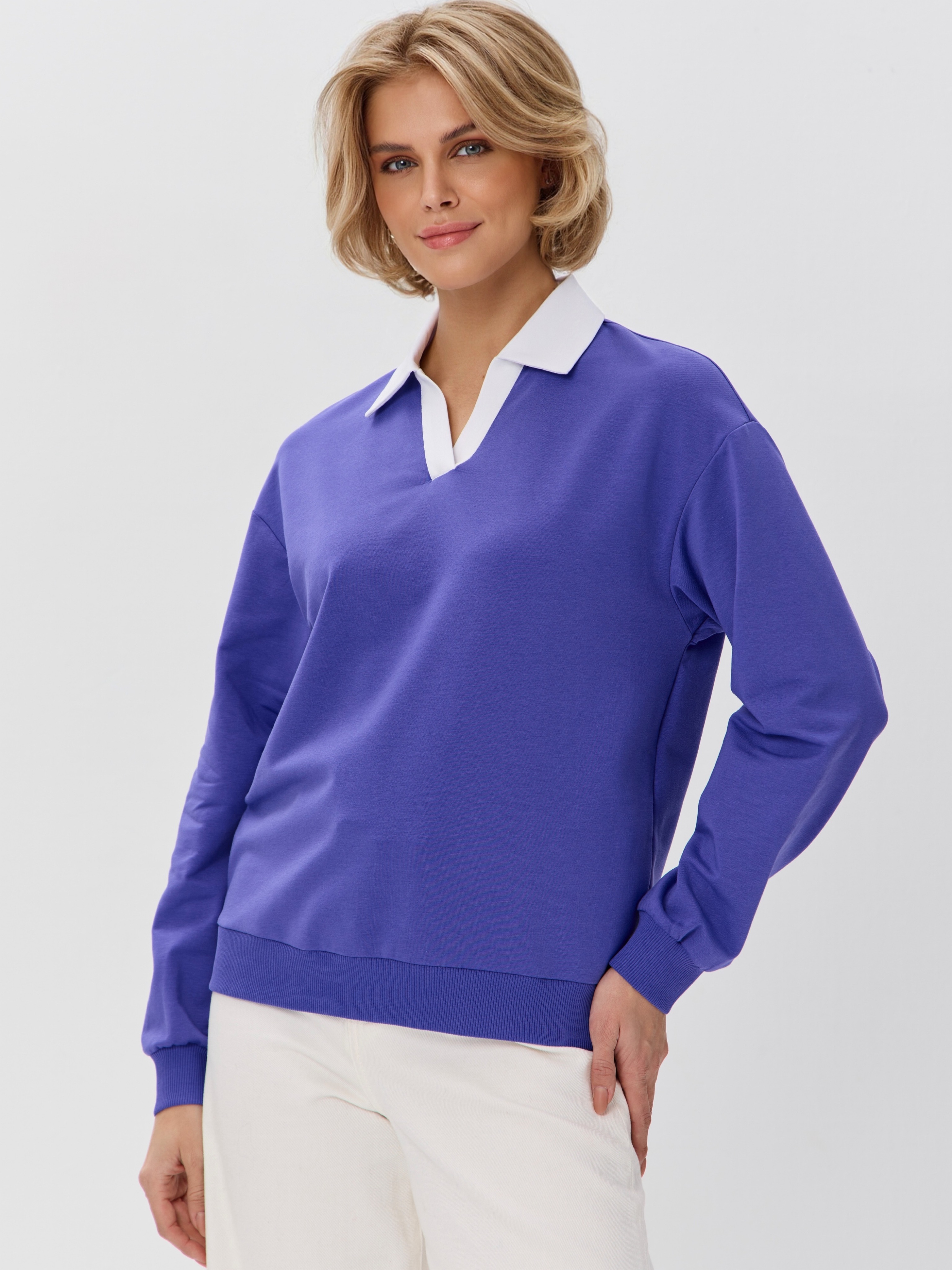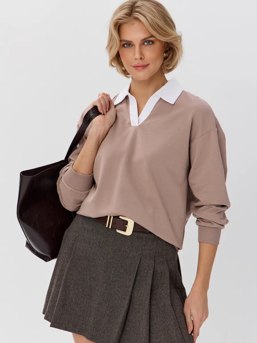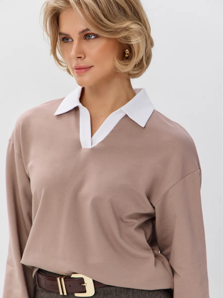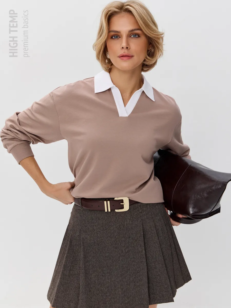 Джемпер с рубашечным воротником поло - современный элегантный уют. Откройте для себя идеальный баланс комфорта и стиля — женский джемпер с контрастным белым воротником‑поло. Это не просто кофта, а настоящая находка для тех, кто ценит в одежде продуманные детали и универсальность. Модель сочетает уют классического свитшота и лаконичность рубашки благодаря контрастному белому воротнику. Такой акцент мгновенно преображает образ, добавляя ему свежести и изысканности. Джемпер выполнен из хлопкового футера 2-нитки с добавлением эластана. Это значит, что натуральная основа дарит комфорт и позволяет коже «дышать», а эластан обеспечивает идеальную посадку по фигуре и устойчивость к деформации. Материал приятен к телу и сохраняет форму даже после множества стирок. Этот джемпер с эффектом двойки легко впишется в любой гардероб: для офиса и школы — сочетайте с юбкой‑карандаш и лодочками или для прогулок — дополните джинсами и кроссовками. Женский джемпер поло HIGH TEMP - ваш новый базовый элемент с изюминкой. Ведь он подчёркивает женственность благодаря контрастному воротнику; сохраняет тепло в прохладную погоду; выглядит актуально в любом сезоне. Подарите себе ощущение комфорта, которое не придётся жертвовать ради стиля. Этот джемпер — ваш ключ к безупречным образам на каждый день.