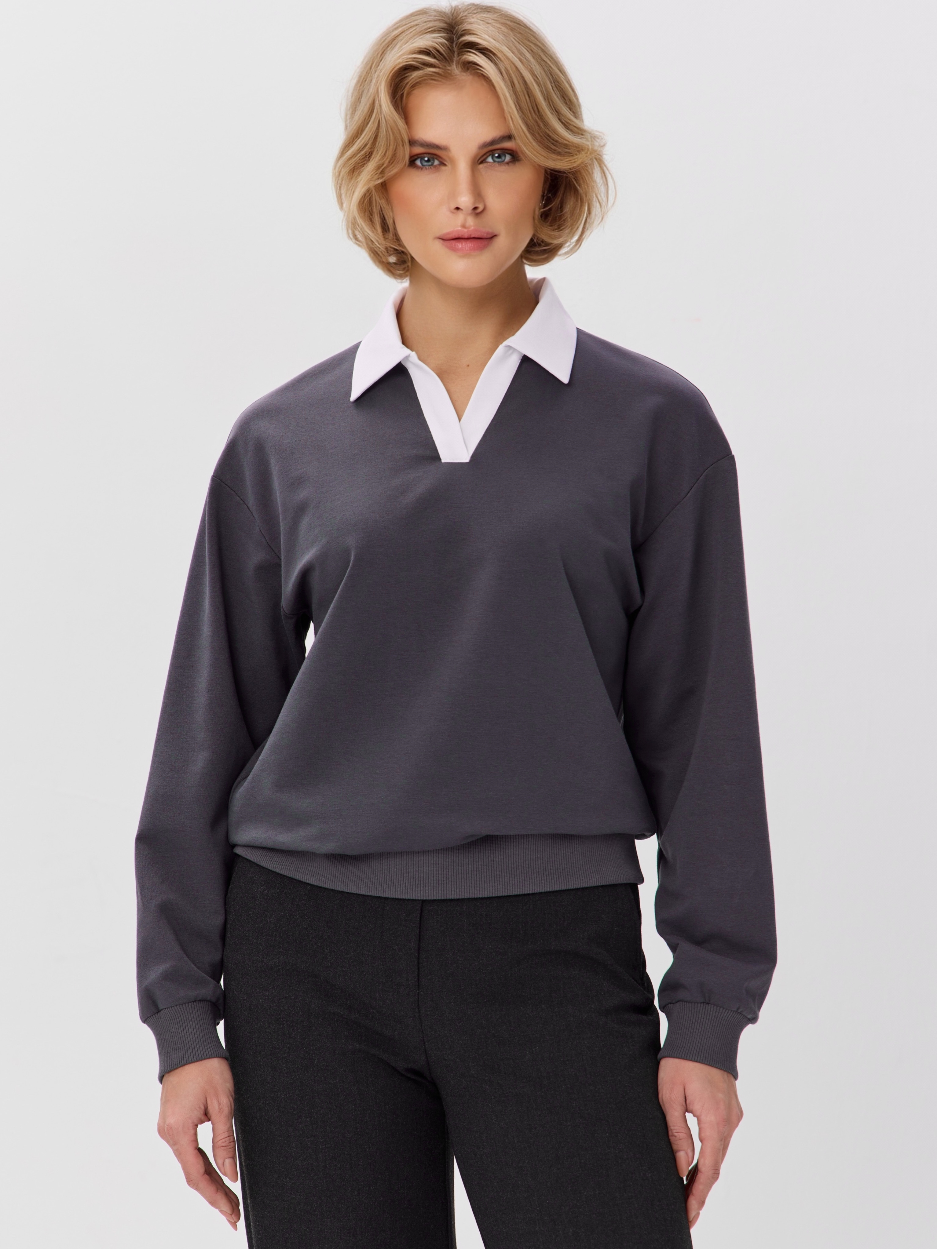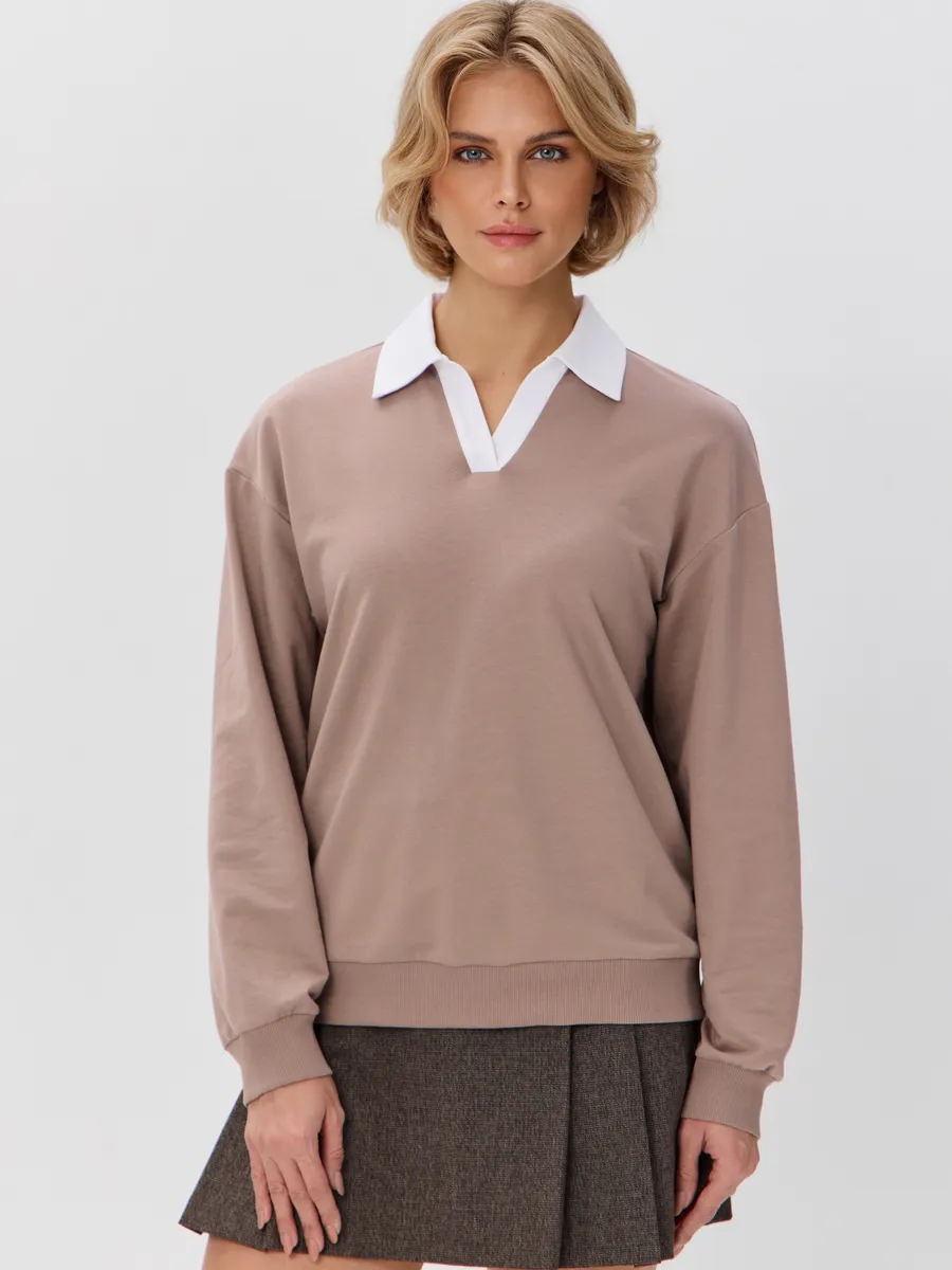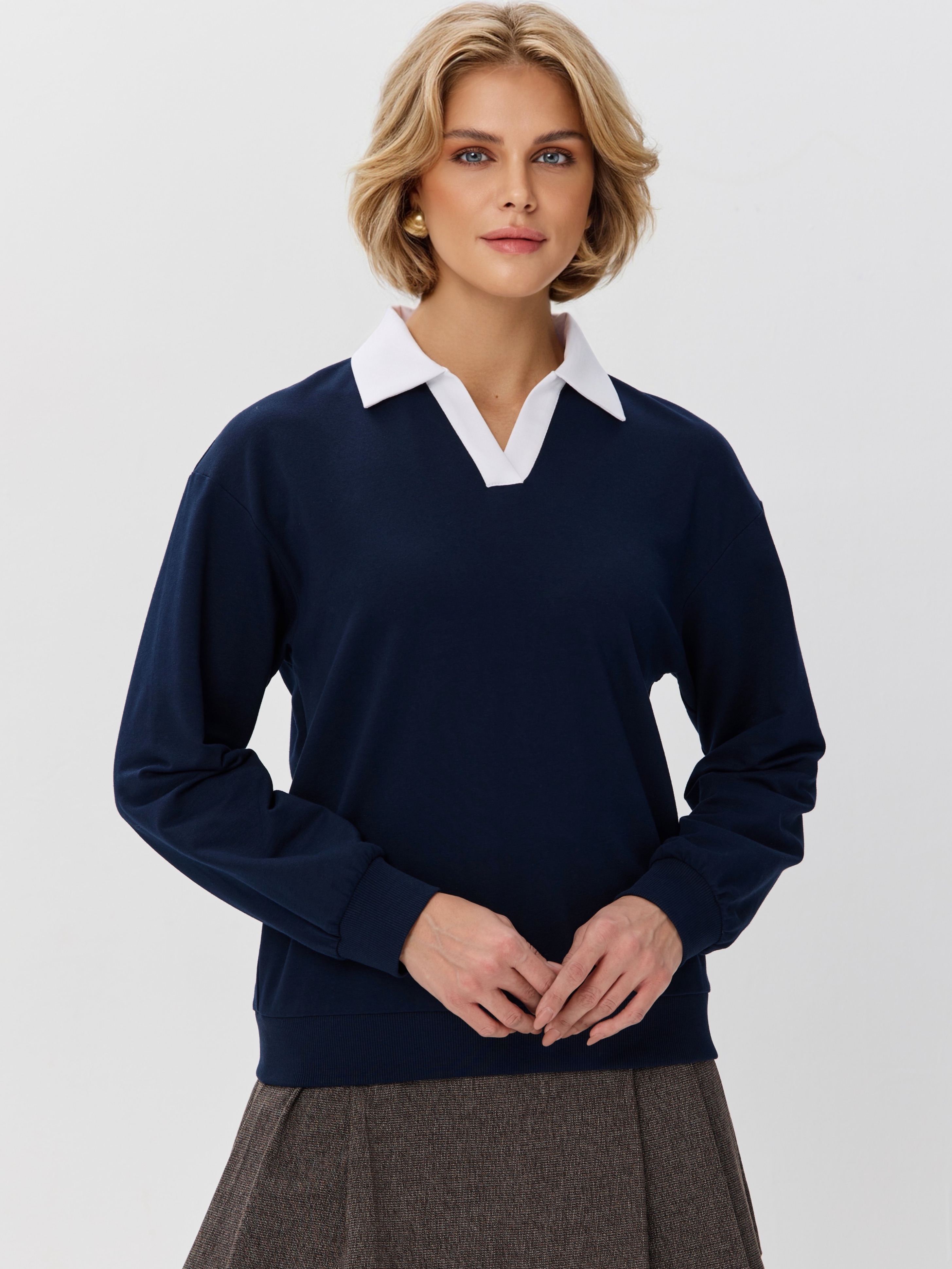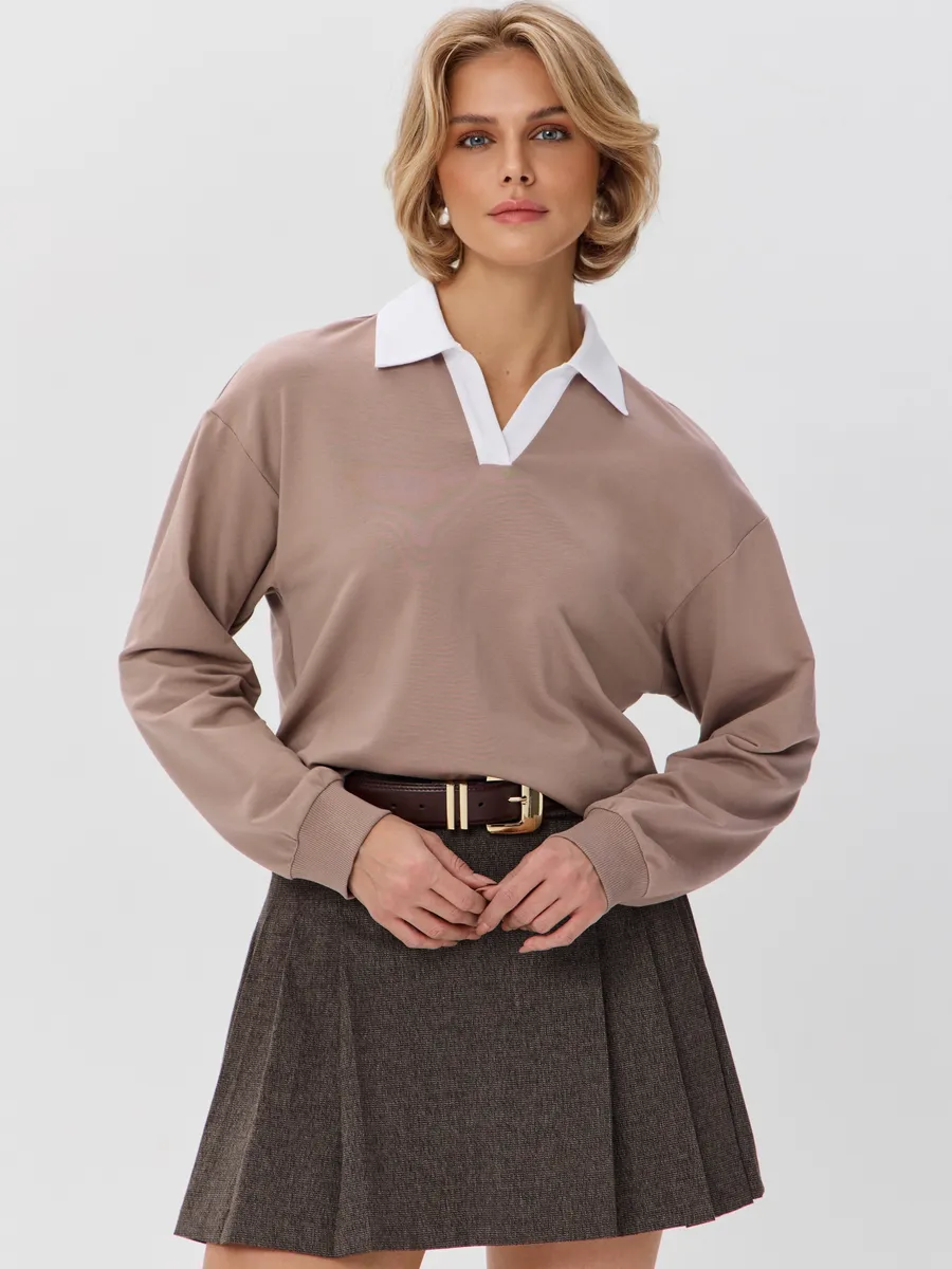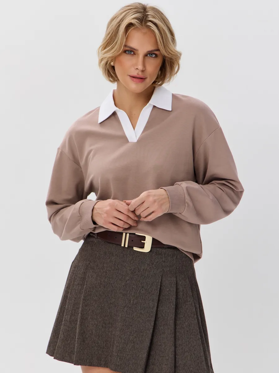 Джемпер с рубашечным воротником поло - современный элегантный уют. Откройте для себя идеальный баланс комфорта и стиля — женский джемпер с контрастным белым воротником‑поло. Это не просто кофта, а настоящая находка для тех, кто ценит в одежде продуманные детали и универсальность. Модель сочетает уют классического свитшота и лаконичность рубашки благодаря контрастному белому воротнику. Такой акцент мгновенно преображает образ, добавляя ему свежести и изысканности. Джемпер выполнен из хлопкового футера 2-нитки с добавлением эластана. Это значит, что натуральная основа дарит комфорт и позволяет коже «дышать», а эластан обеспечивает идеальную посадку по фигуре и устойчивость к деформации. Материал приятен к телу и сохраняет форму даже после множества стирок. Этот джемпер с эффектом двойки легко впишется в любой гардероб: для офиса и школы — сочетайте с юбкой‑карандаш и лодочками или для прогулок — дополните джинсами и кроссовками. Женский джемпер поло HIGH TEMP - ваш новый базовый элемент с изюминкой. Ведь он подчёркивает женственность благодаря контрастному воротнику; сохраняет тепло в прохладную погоду; выглядит актуально в любом сезоне. Подарите себе ощущение комфорта, которое не придётся жертвовать ради стиля. Этот джемпер — ваш ключ к безупречным образам на каждый день.