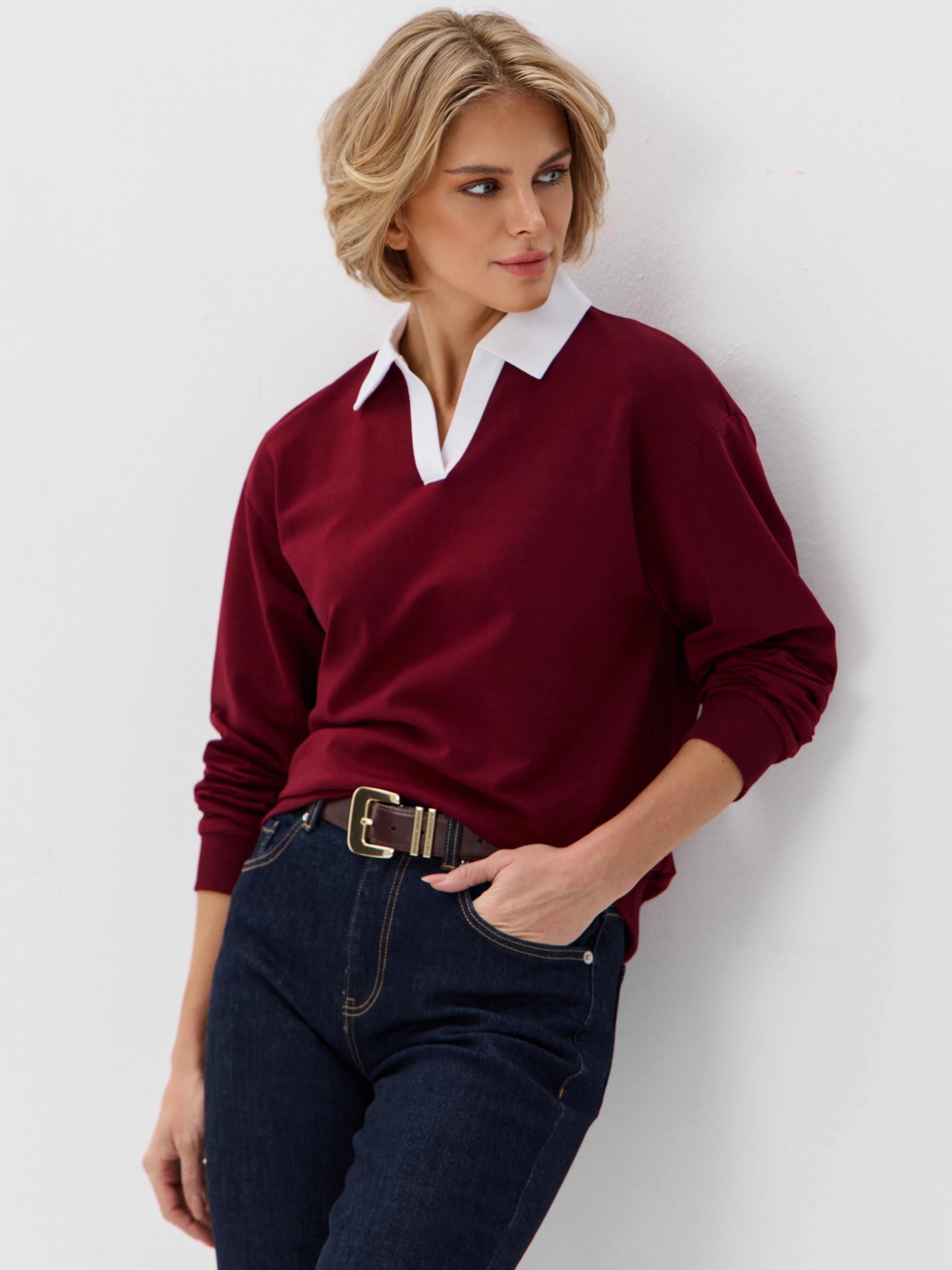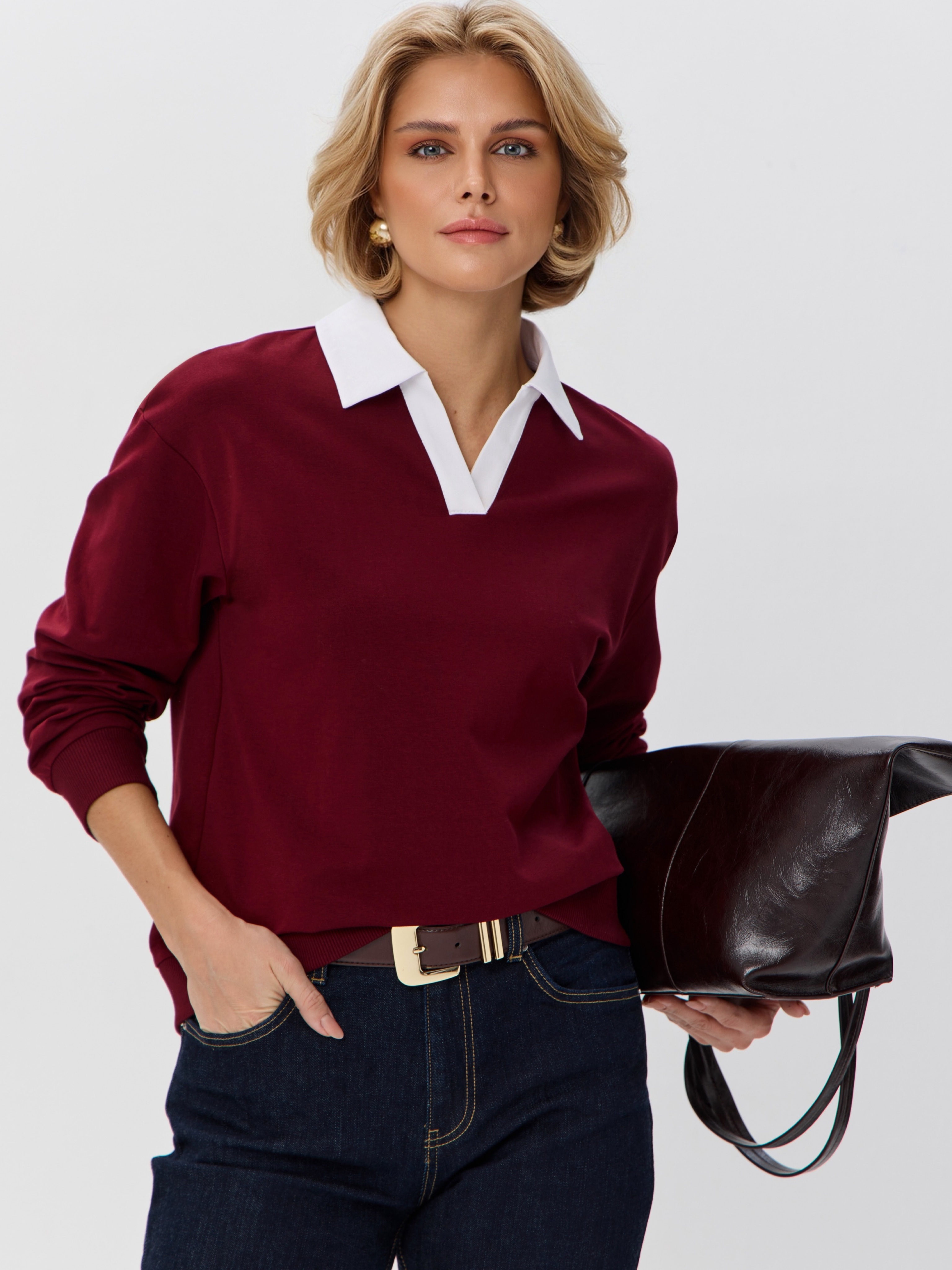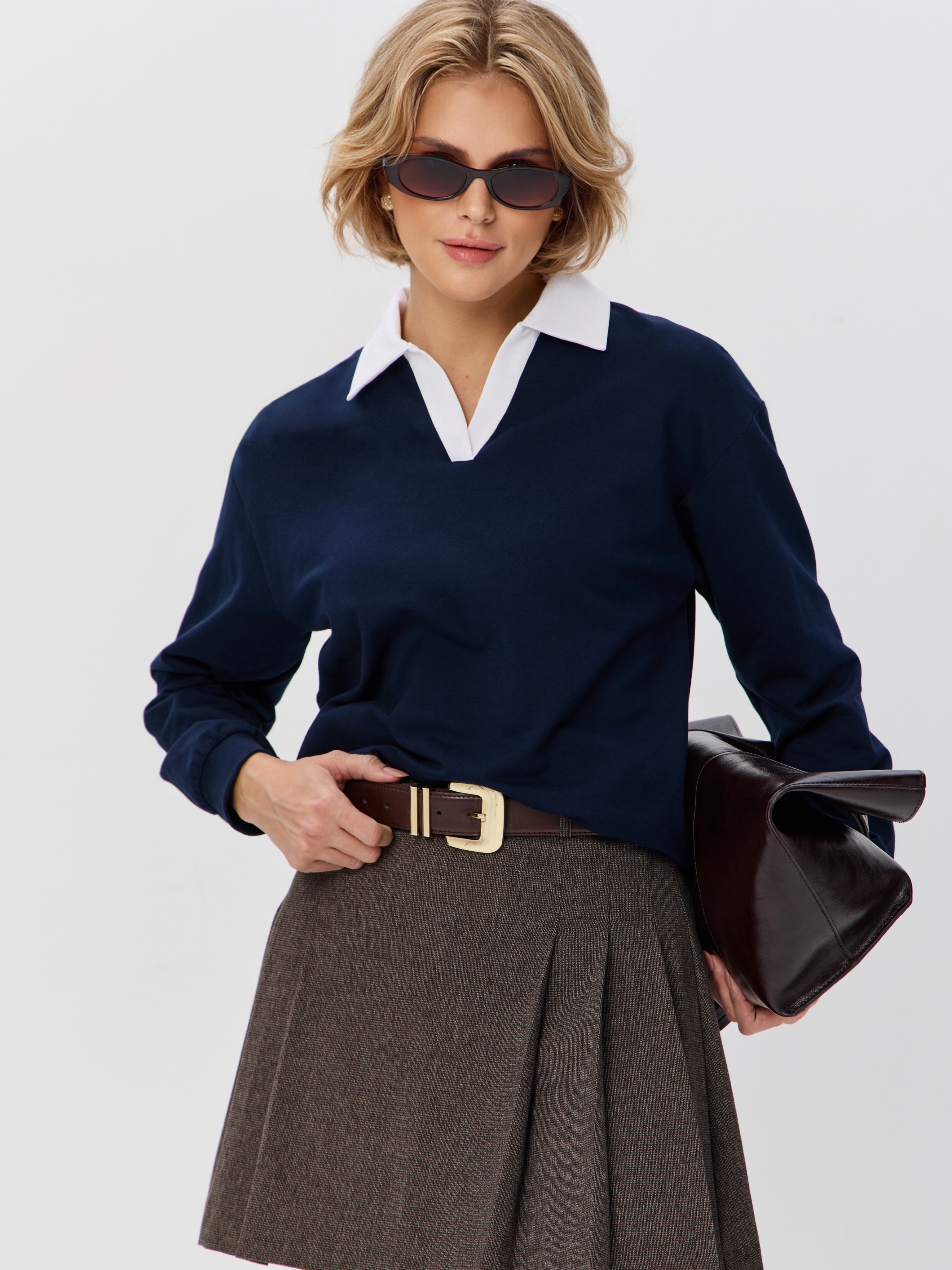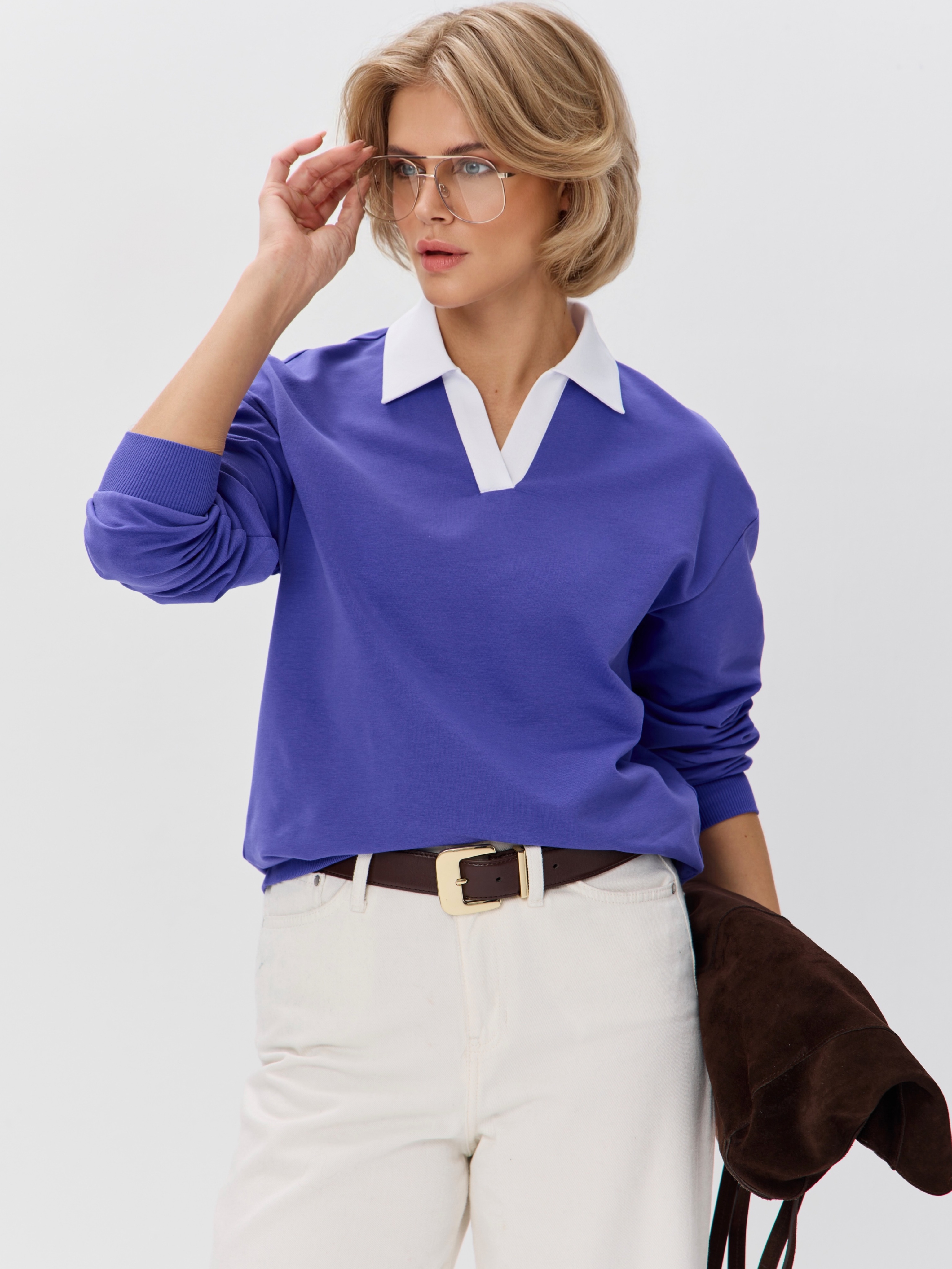 Джемпер с рубашечным воротником поло - современный элегантный уют. Откройте для себя идеальный баланс комфорта и стиля — женский джемпер с контрастным белым воротником‑поло. Это не просто кофта, а настоящая находка для тех, кто ценит в одежде продуманные детали и универсальность. Модель сочетает уют классического свитшота и лаконичность рубашки благодаря контрастному белому воротнику. Такой акцент мгновенно преображает образ, добавляя ему свежести и изысканности. Джемпер выполнен из хлопкового футера 2-нитки с добавлением эластана. Это значит, что натуральная основа дарит комфорт и позволяет коже «дышать», а эластан обеспечивает идеальную посадку по фигуре и устойчивость к деформации. Материал приятен к телу и сохраняет форму даже после множества стирок. Этот джемпер с эффектом двойки легко впишется в любой гардероб: для офиса и школы — сочетайте с юбкой‑карандаш и лодочками или для прогулок — дополните джинсами и кроссовками. Женский джемпер поло HIGH TEMP - ваш новый базовый элемент с изюминкой. Ведь он подчёркивает женственность благодаря контрастному воротнику; сохраняет тепло в прохладную погоду; выглядит актуально в любом сезоне. Подарите себе ощущение комфорта, которое не придётся жертвовать ради стиля. Этот джемпер — ваш ключ к безупречным образам на каждый день.