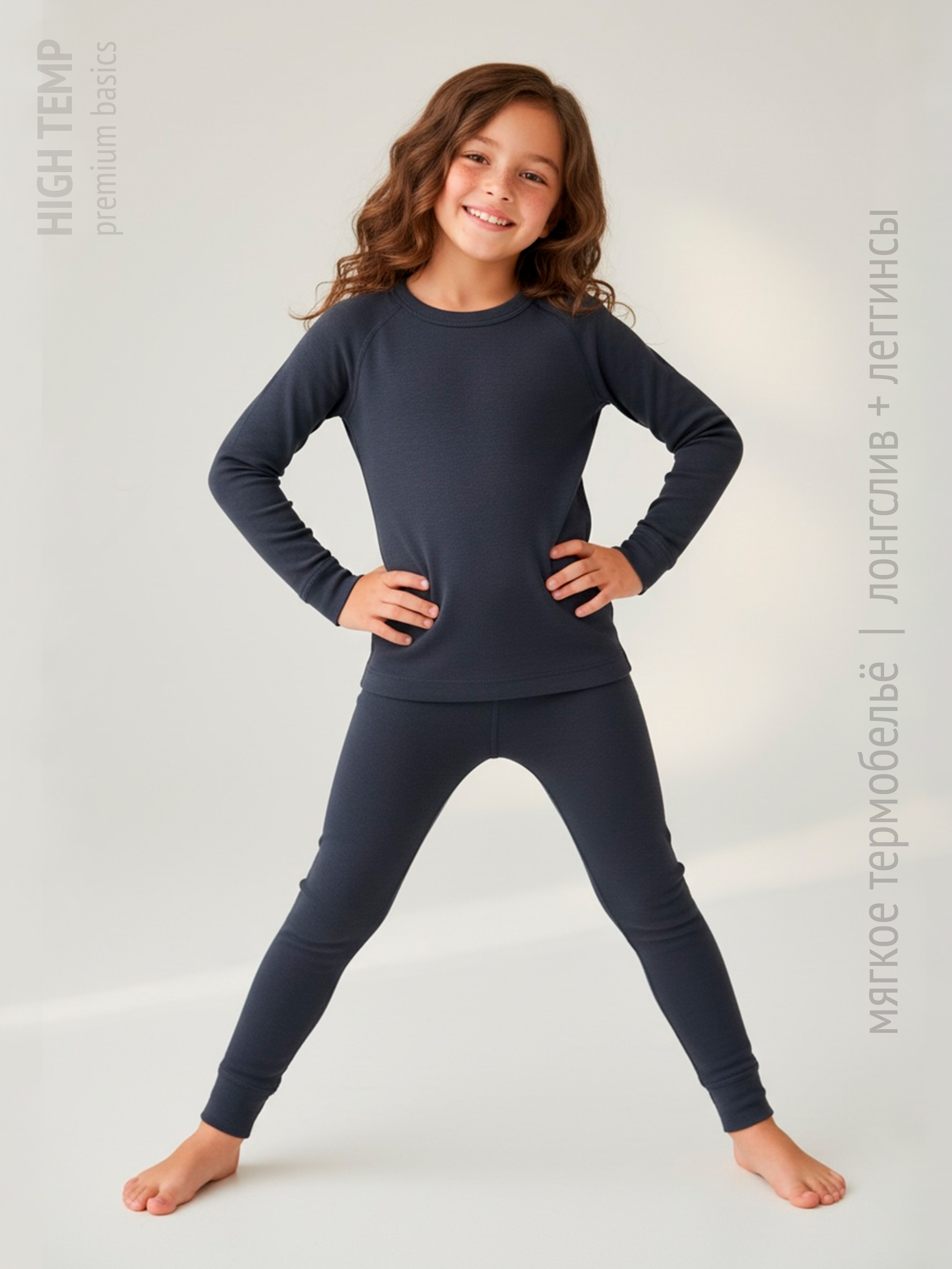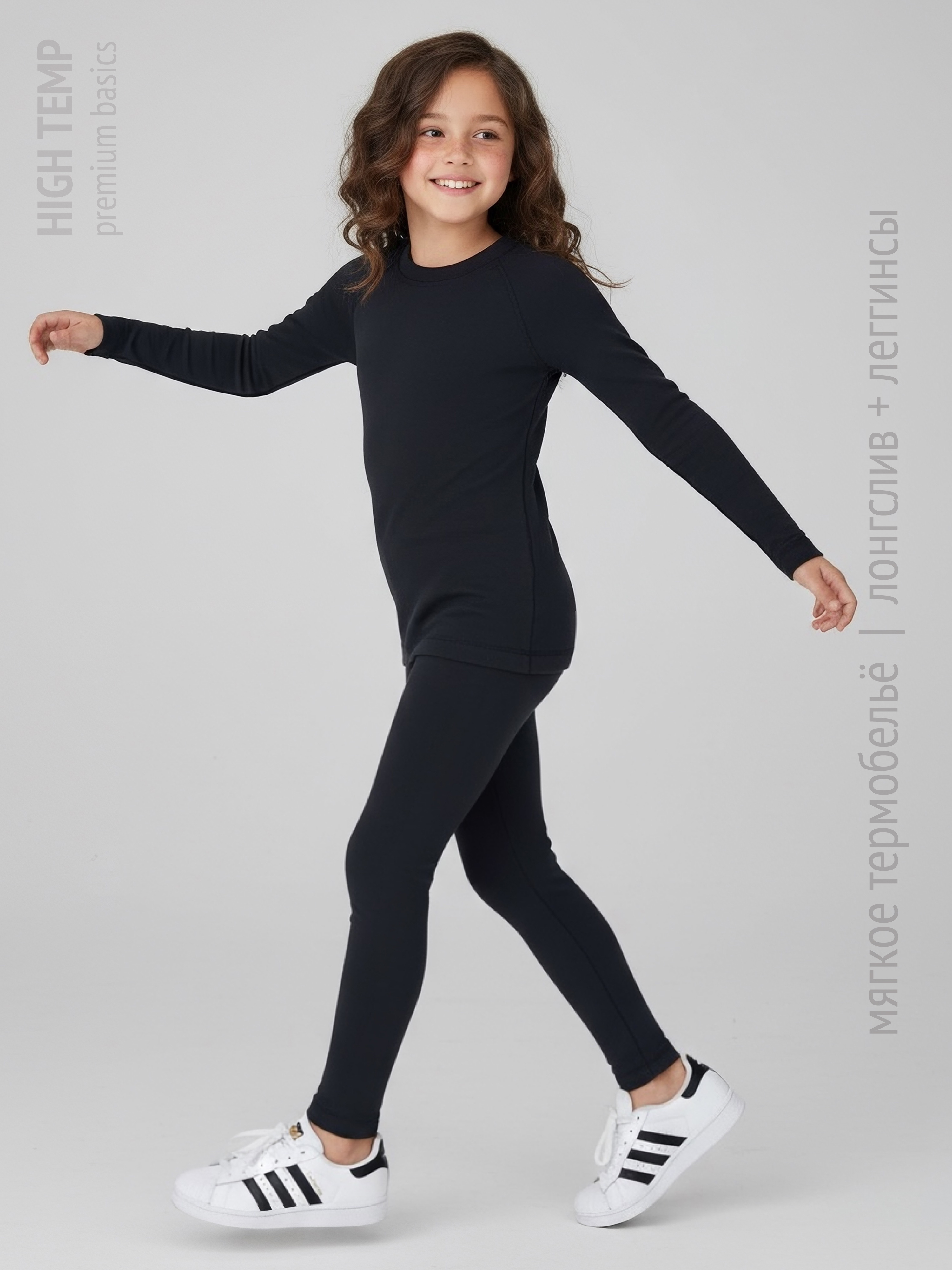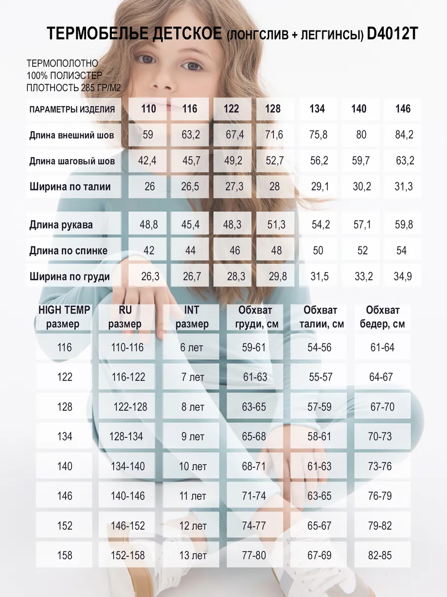 Нежное тепло для вашей принцессы: термобельё HIGH TEMP для девочек. Прохладные прогулки и активные игры на свежем воздухе — с комплектом термобелья от HIGH TEMP ваша малышка всегда будет в комфорте и тепле, не жертвуя подвижностью и настроением. Набор одежды состоит из двух идеально сочетающихся предметов: лонгслив с округлым вырезом и аккуратными плоскими швами; леггинсы с мягкой эластичной резинкой, не передавливающей животик. Ткань словно обнимает кожу: ультрамягкий внутренний слой дарит ощущение нежности, а внешний эффективно отводит влагу. Ребёнок не потеет и не мёрзнет. Эргономичный крой учитывает особенности детской фигуры. Рукава достаточной длины, чтобы не задирались при подъёме рук; леггинсы не сползают и не собираются в складки; швы выполнены по современной технологии — не натирают даже самую чувствительную кожу. Комплект детского термобелья очень практичен, он легко надевается и снимается, не теряет форму после множества стирок, быстро сохнет, не линяет и не выцветает. Представлен широкий диапазон размеров — от 110 до 146см. Уход за термо-бельем очень прост: стирка при 30°C, деликатный отжим, сушка в расправленном виде, глажка при низкой температуре (по желанию). Подарите ребёнку тепло, которое не ощущается! Комплект термобелья HIGH TEMP — это не просто одежда. Это забота, воплощённая в ткани. Это уверенность, что ваша малышка будет активной и весёлой в любую погоду, а вы — спокойны за её комфорт. Выберите нежность и качество для самого дорогого человека. Закажите комплект термобелья (лонгслив и леггинсы) HIGH TEMP.