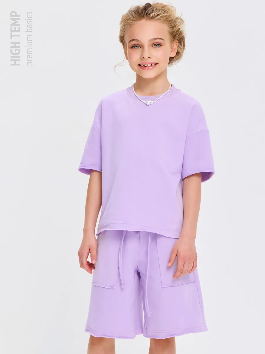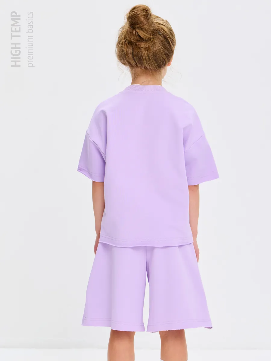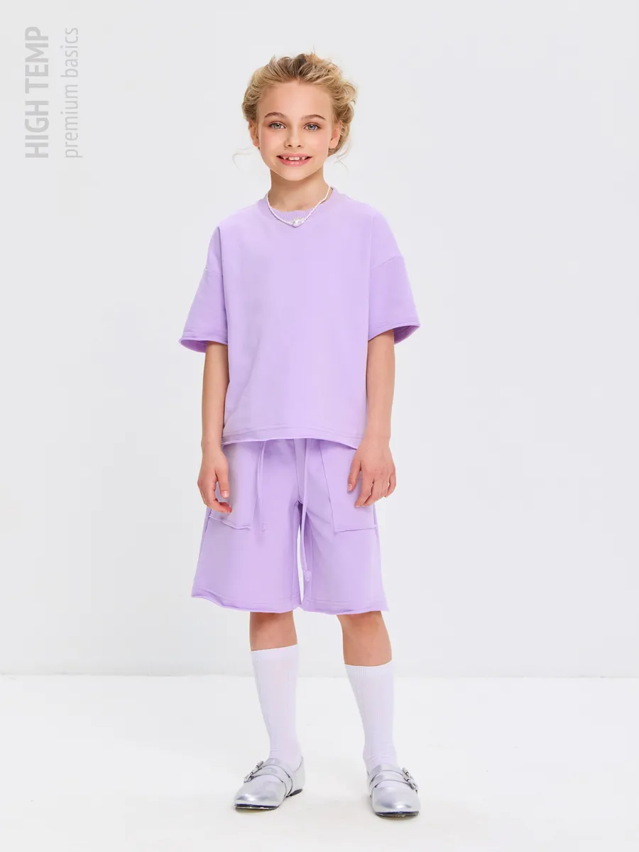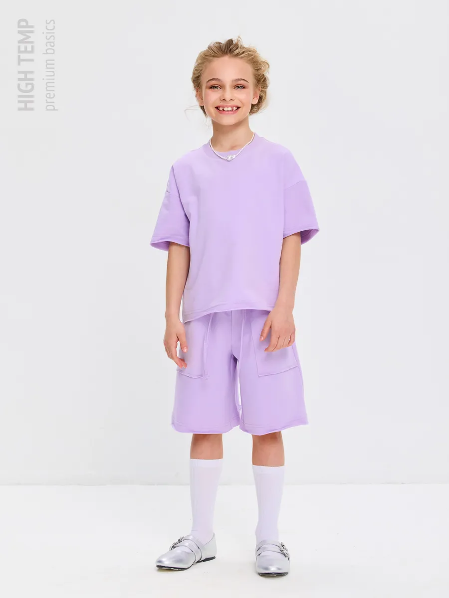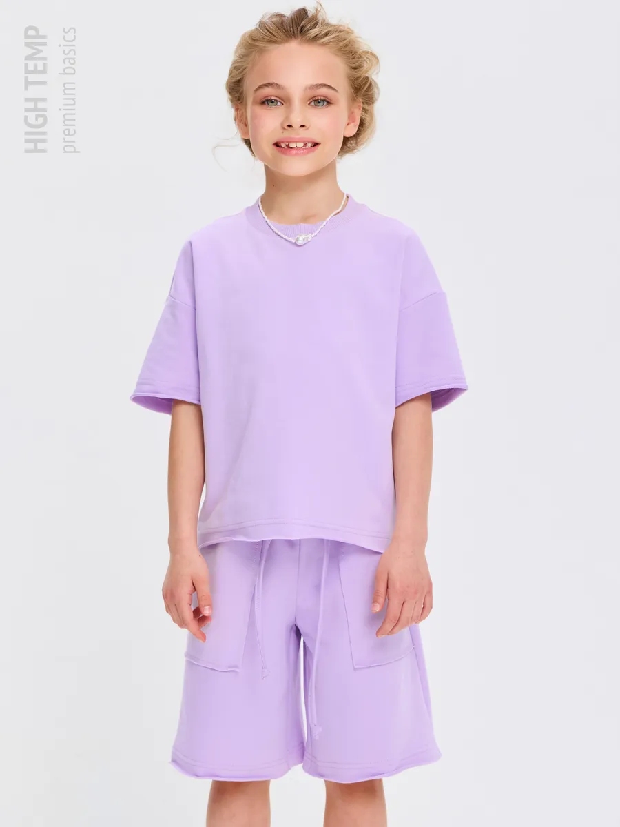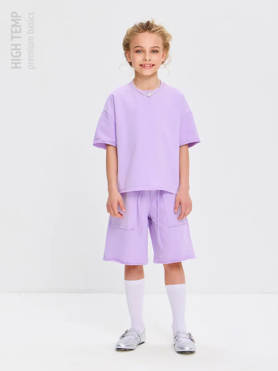 Свободная футболка оверсайз с открытыми срезами и необработанными швами, как и шорты — придает образу дерзости и индивидуальности, позволяя ребенку чувствовать себя свободно и комфортно.