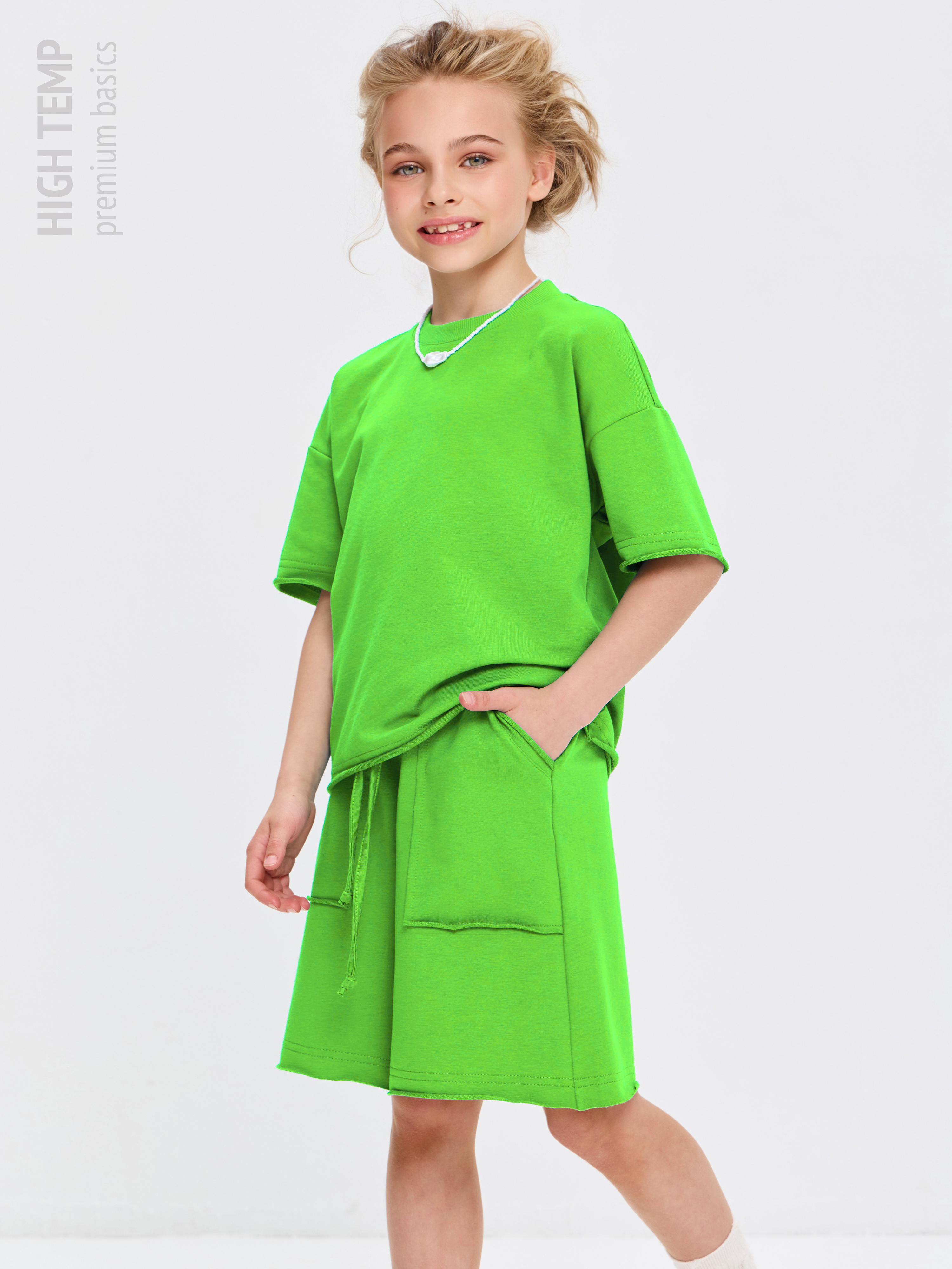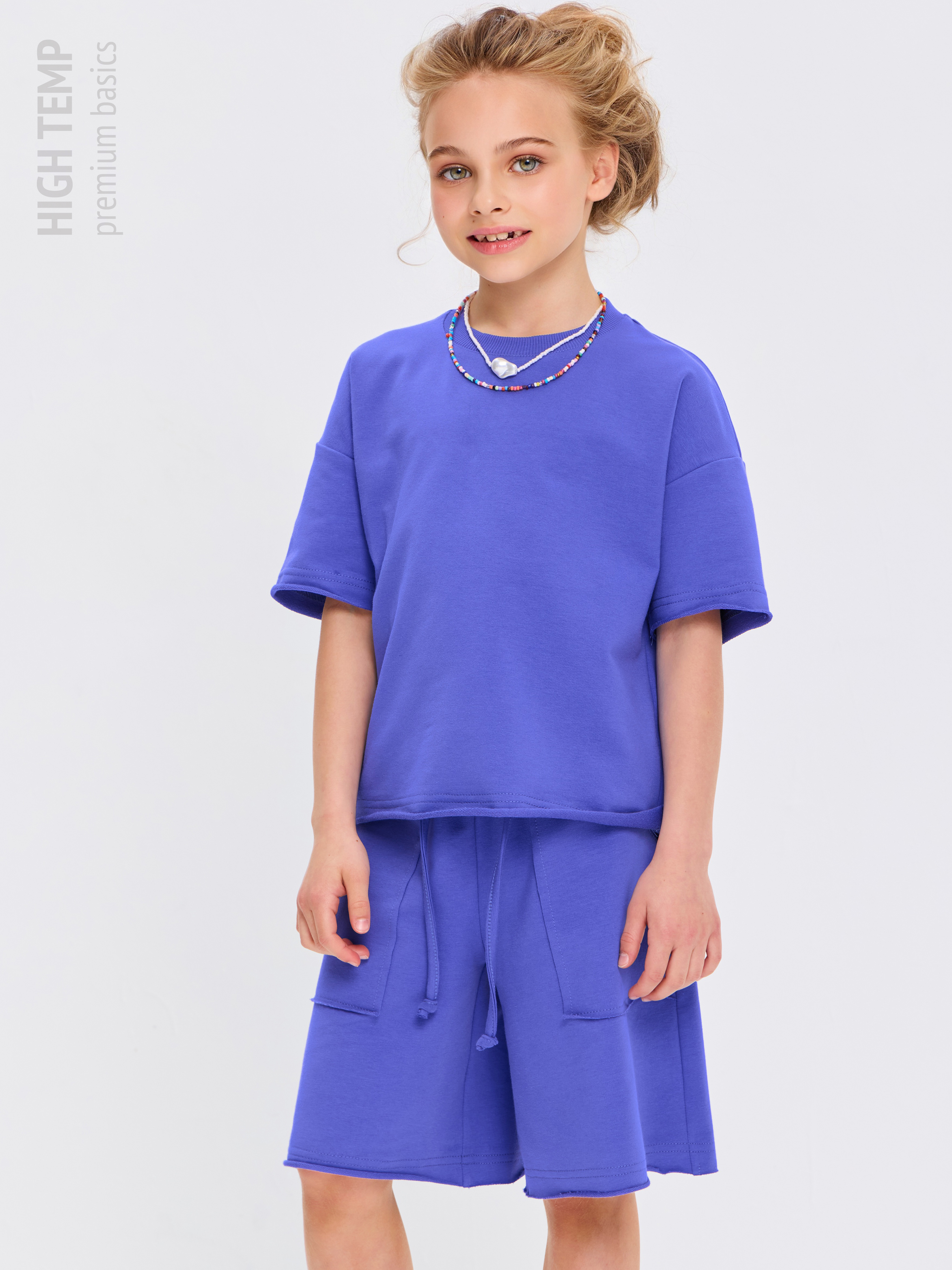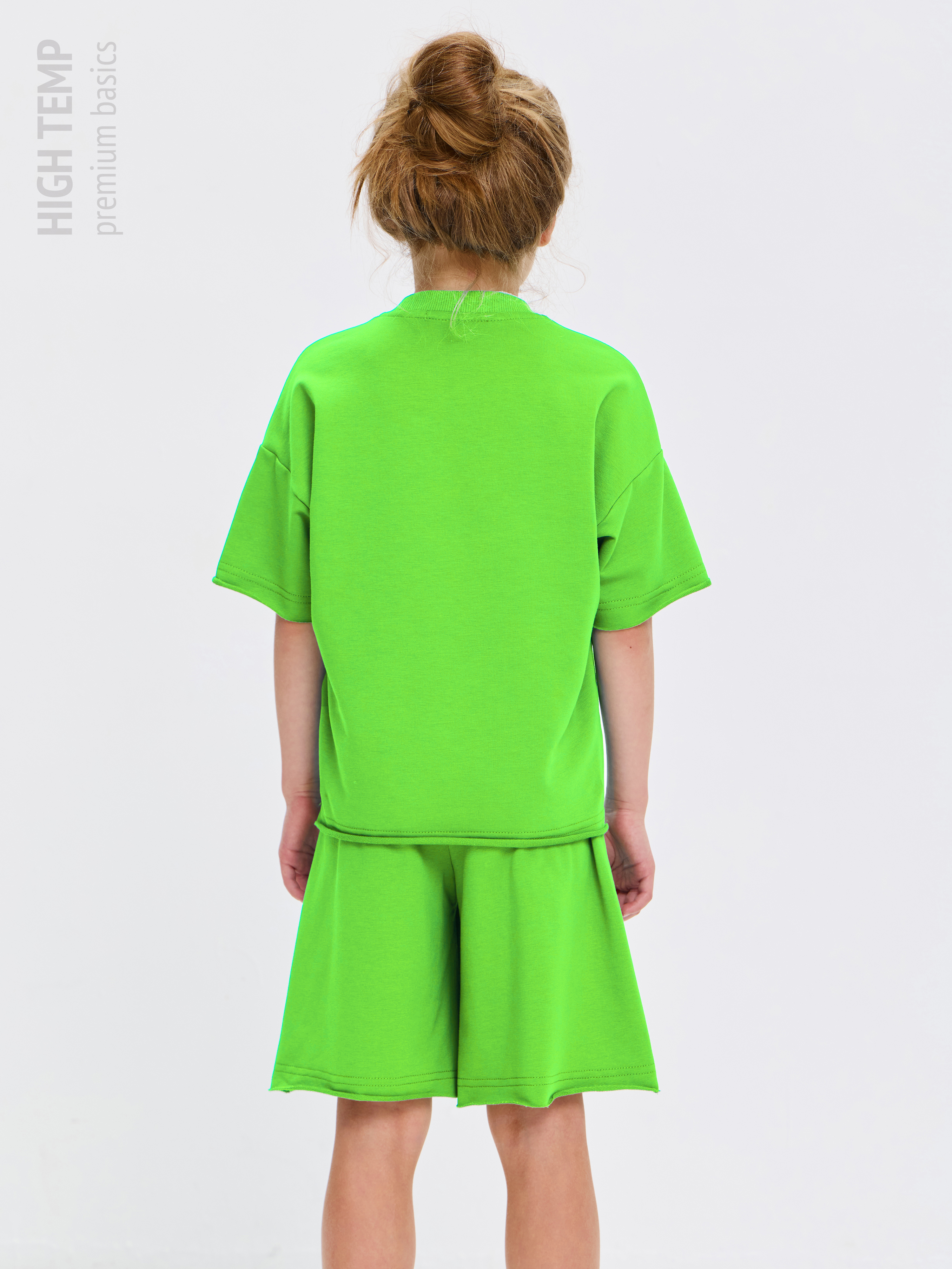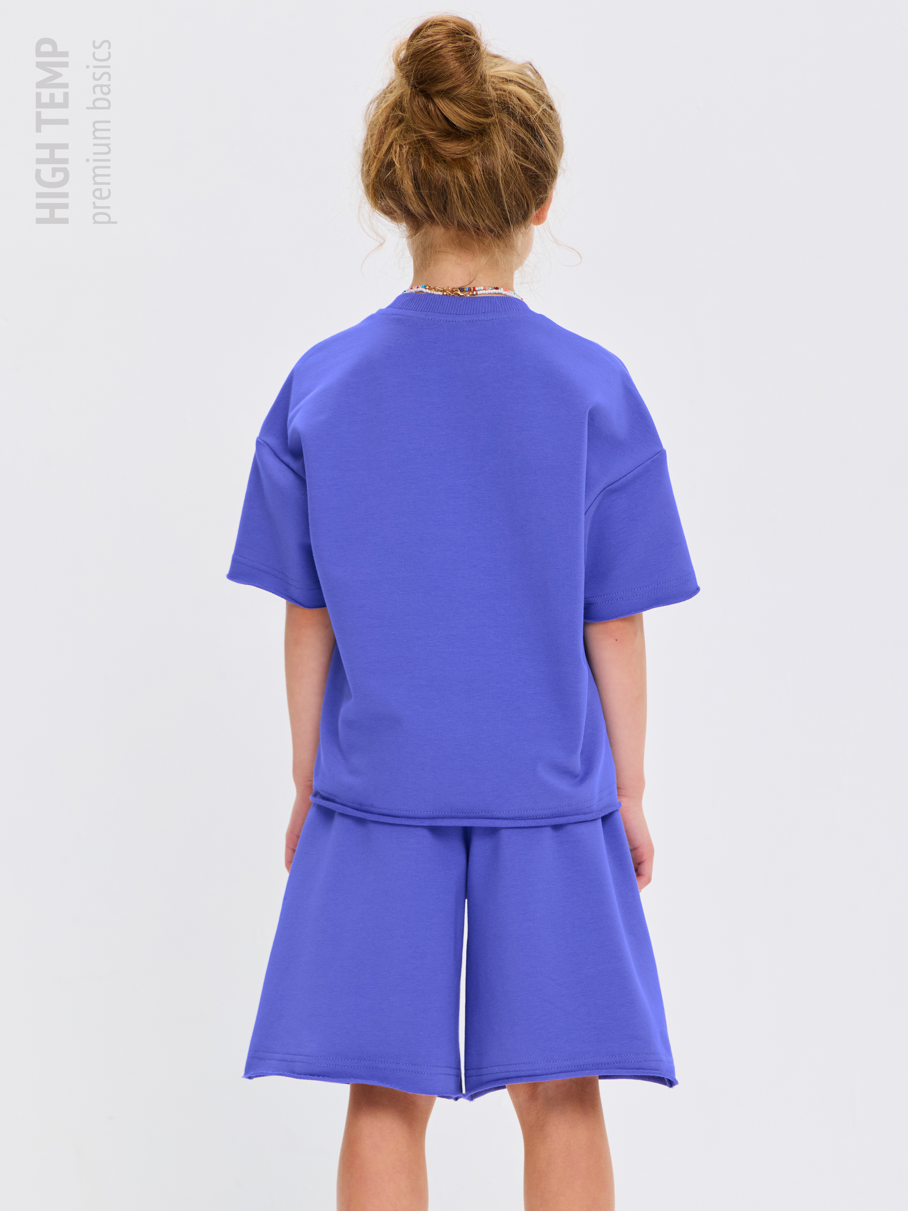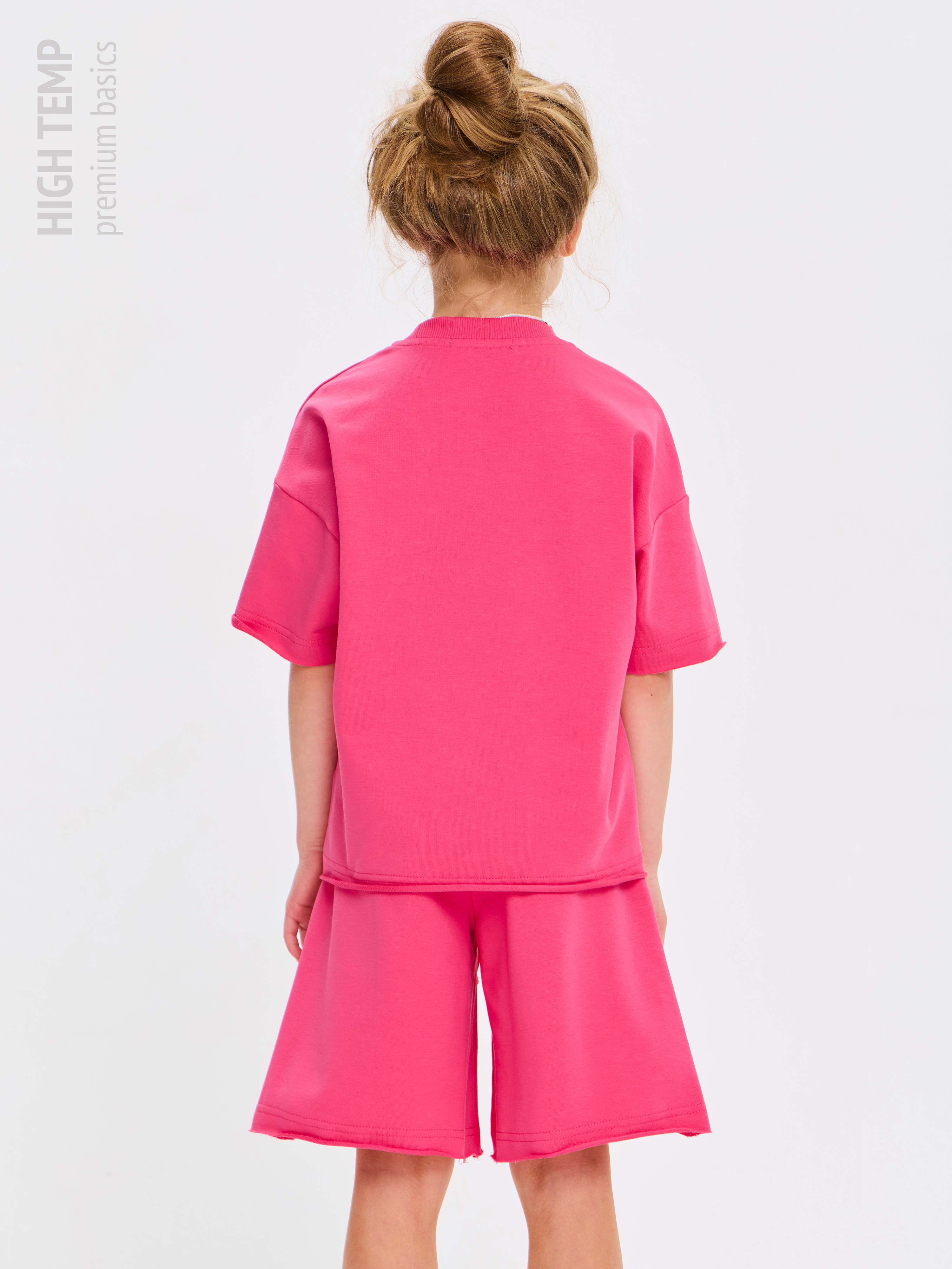 Свободная футболка оверсайз с открытыми срезами и необработанными швами, как и шорты — придает образу дерзости и индивидуальности, позволяя ребенку чувствовать себя свободно и комфортно.