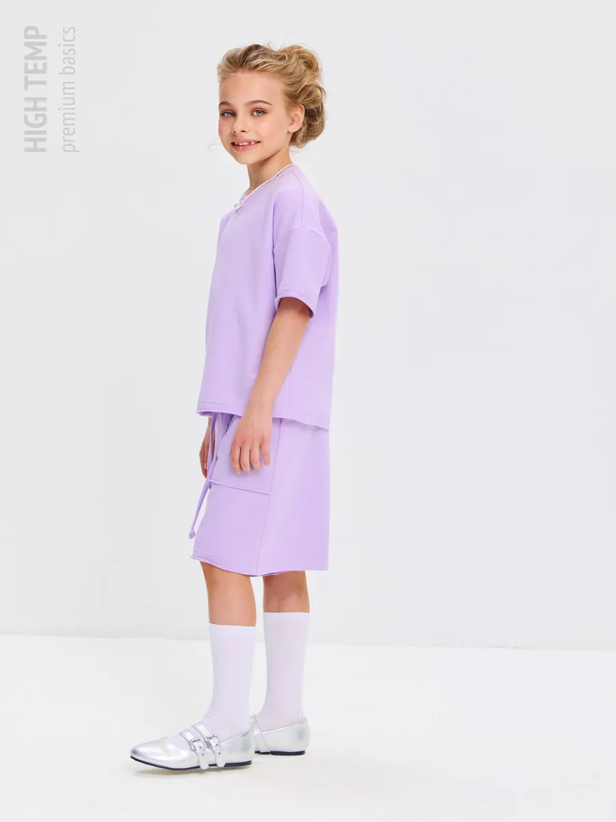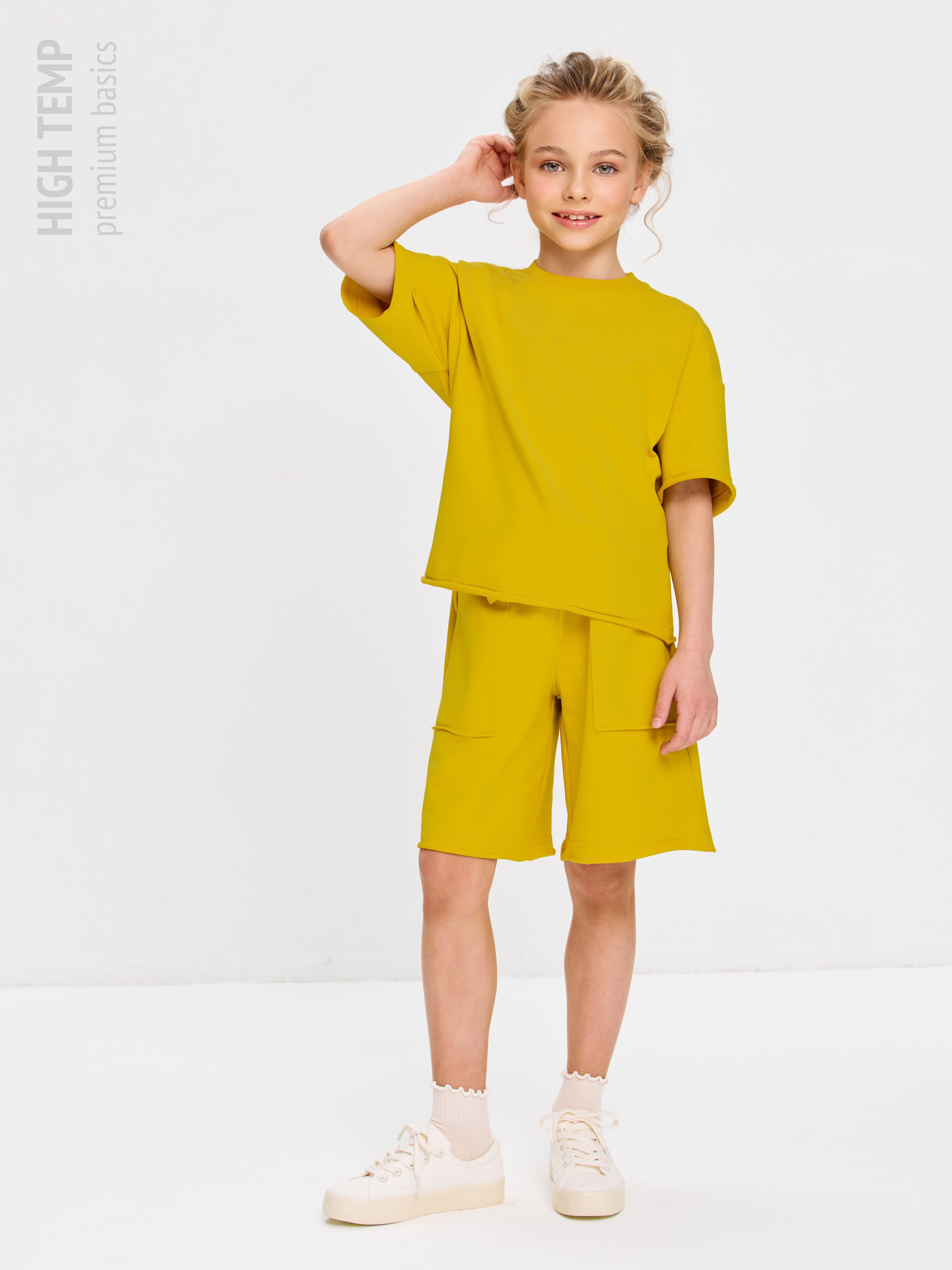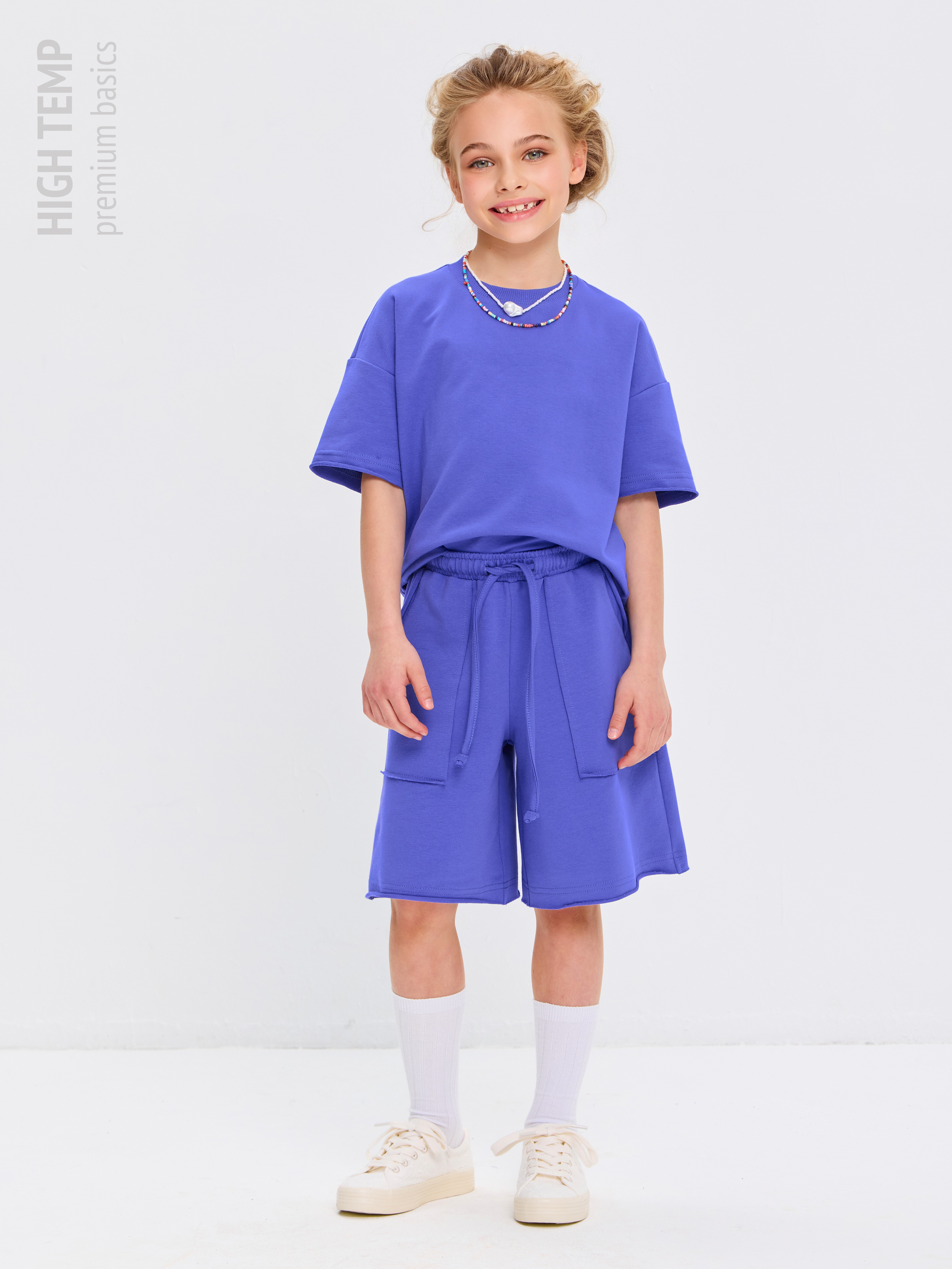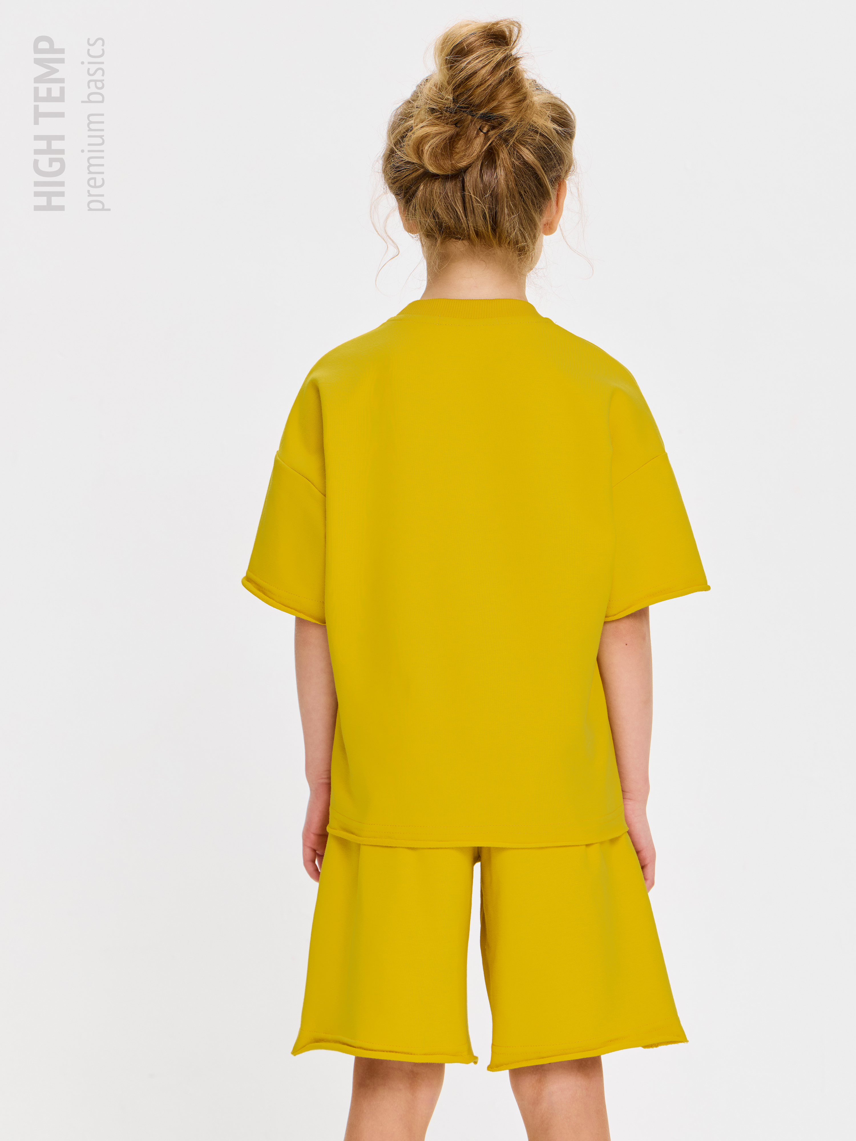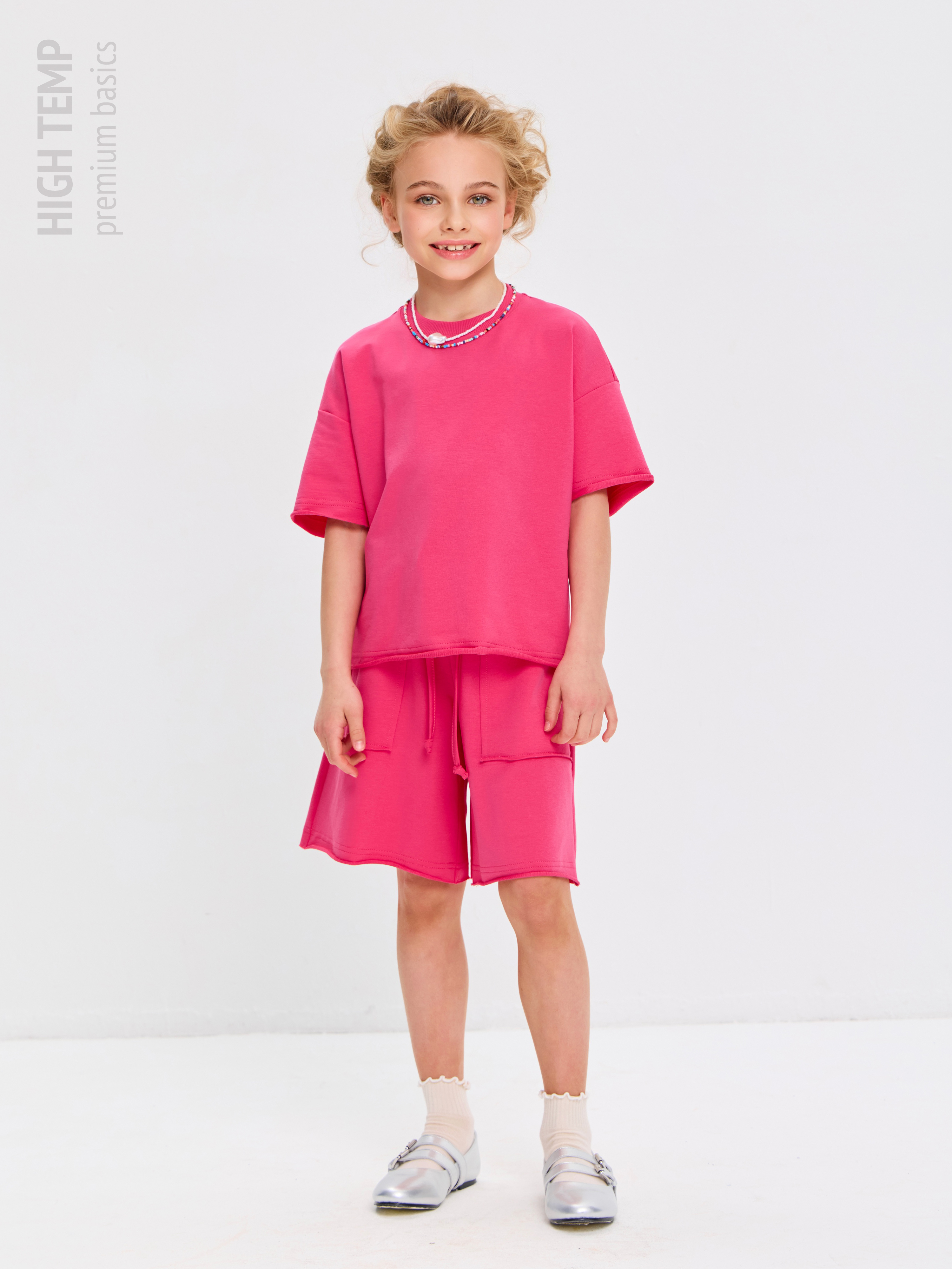 Свободная футболка оверсайз с открытыми срезами и необработанными швами, как и шорты — придает образу дерзости и индивидуальности, позволяя ребенку чувствовать себя свободно и комфортно.