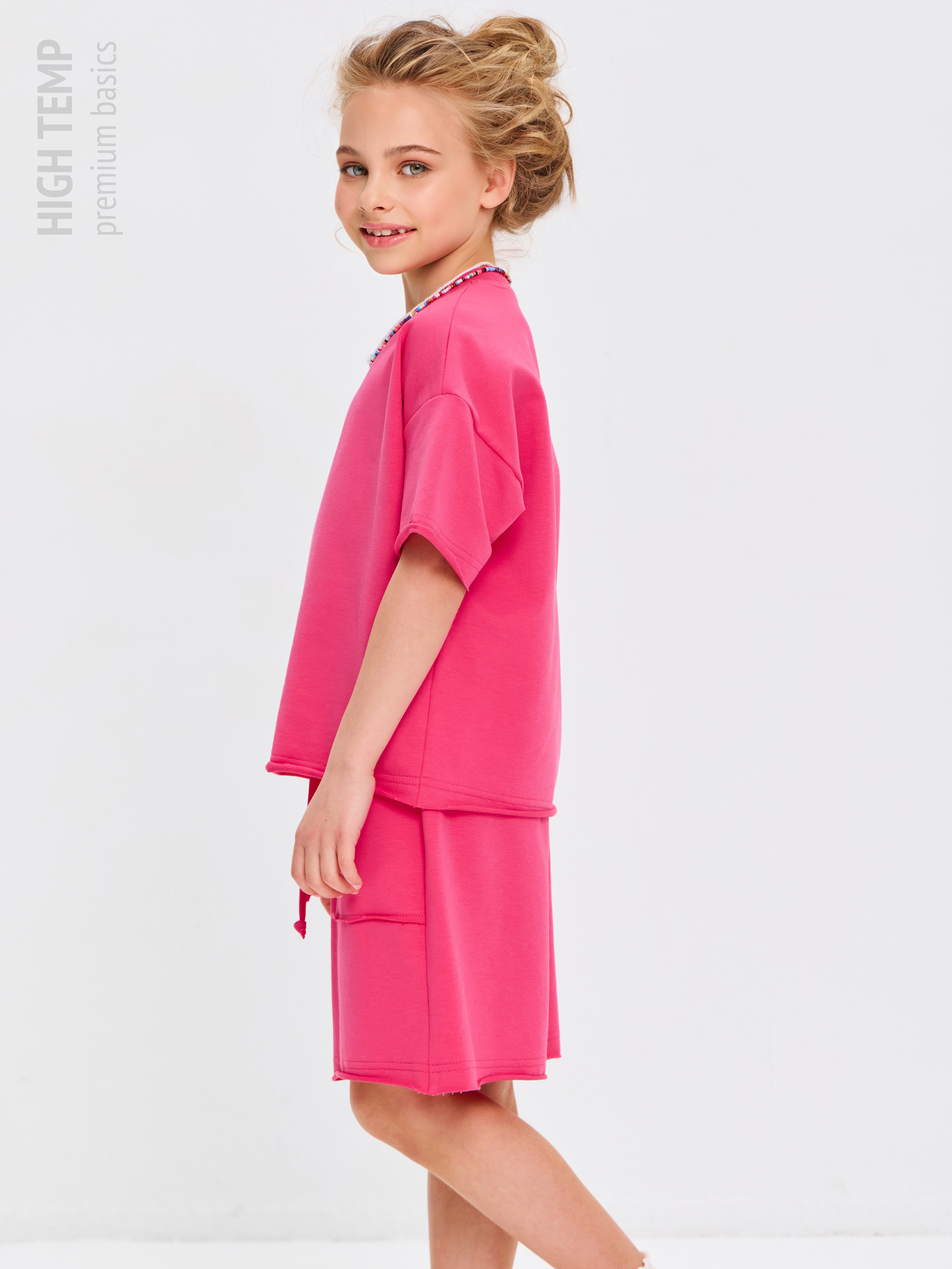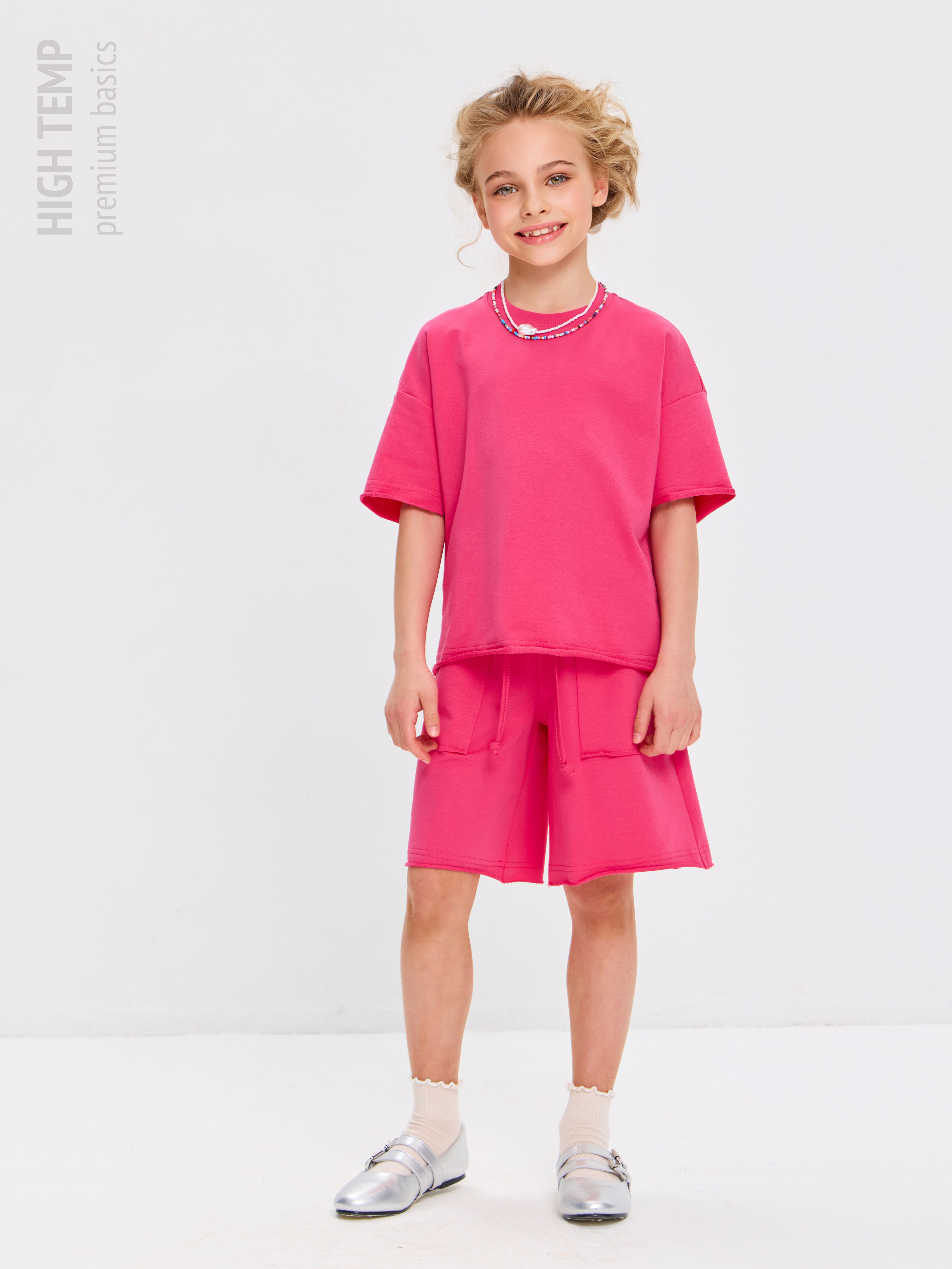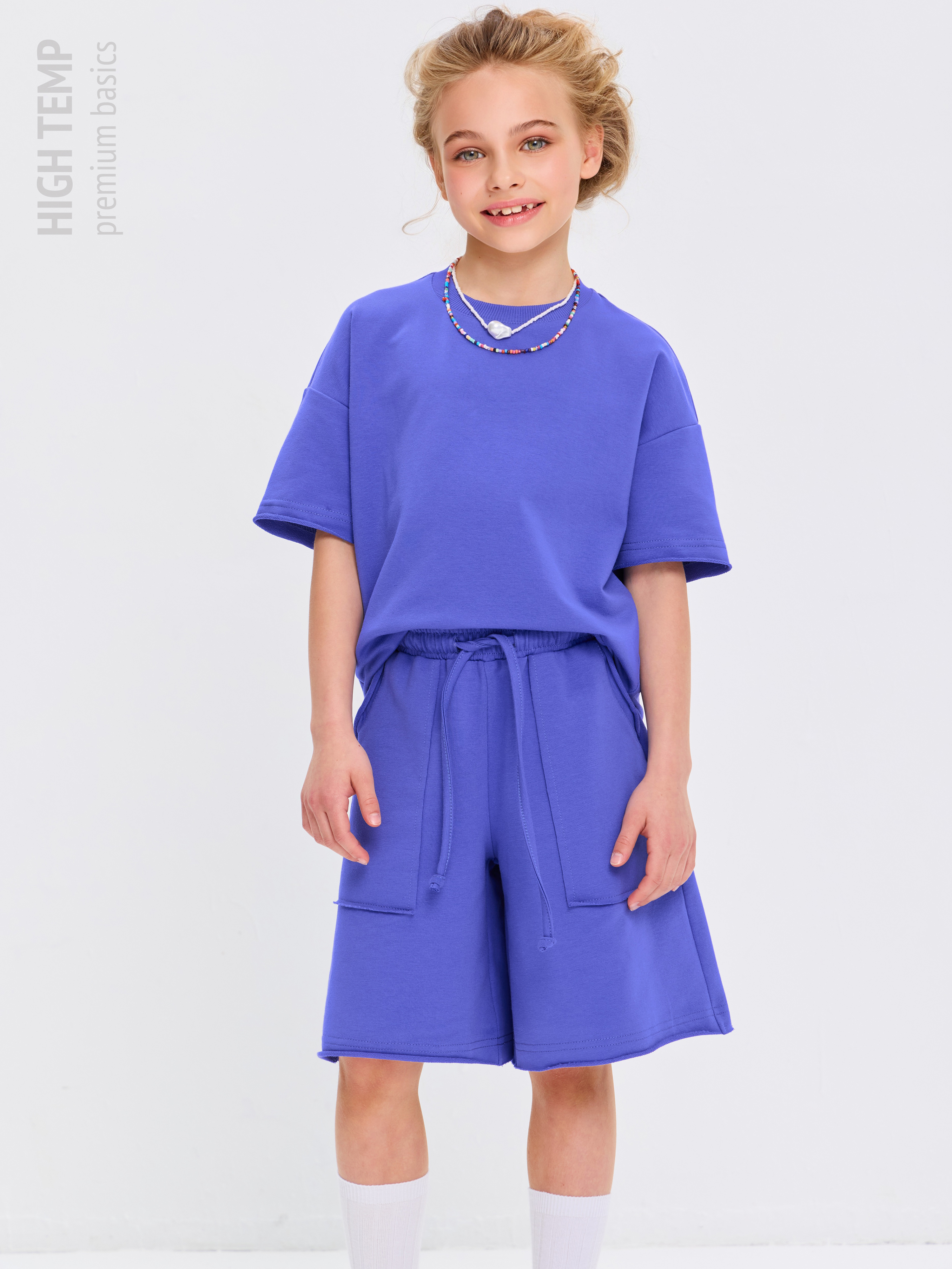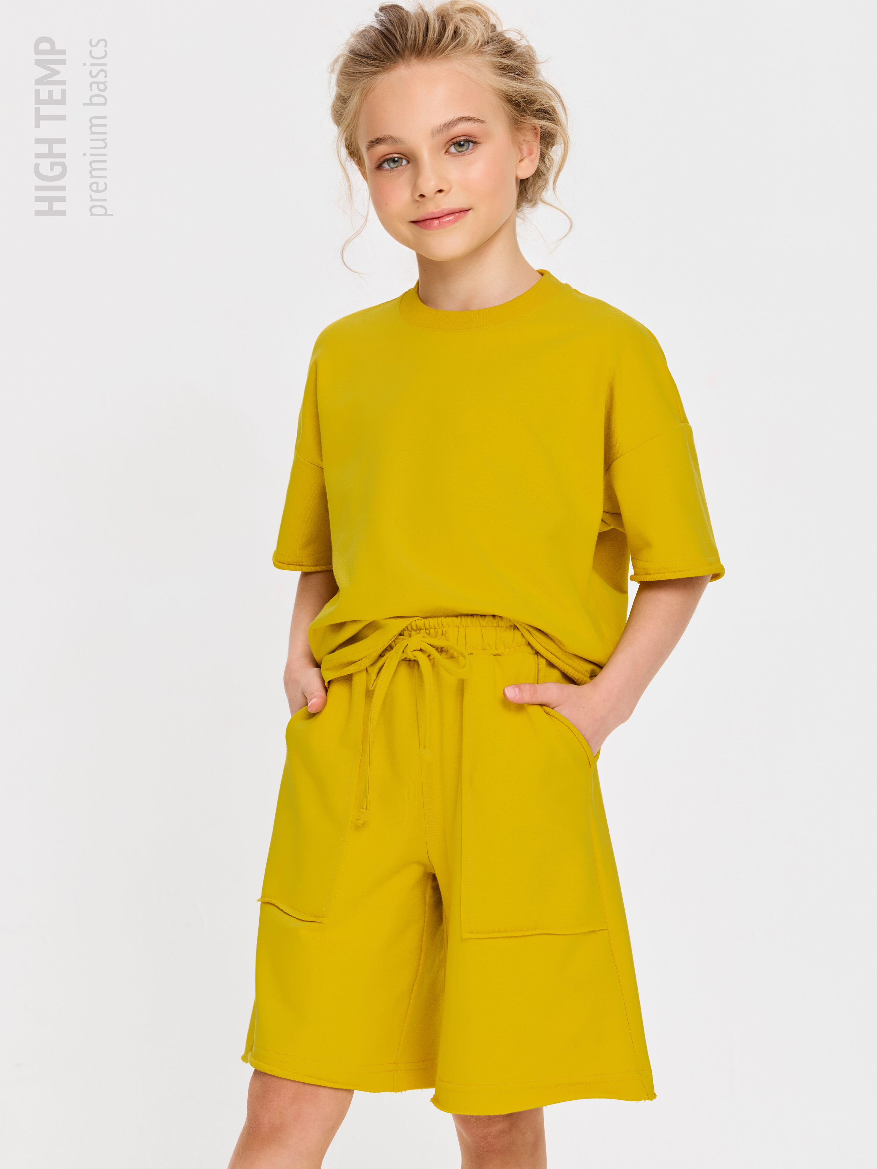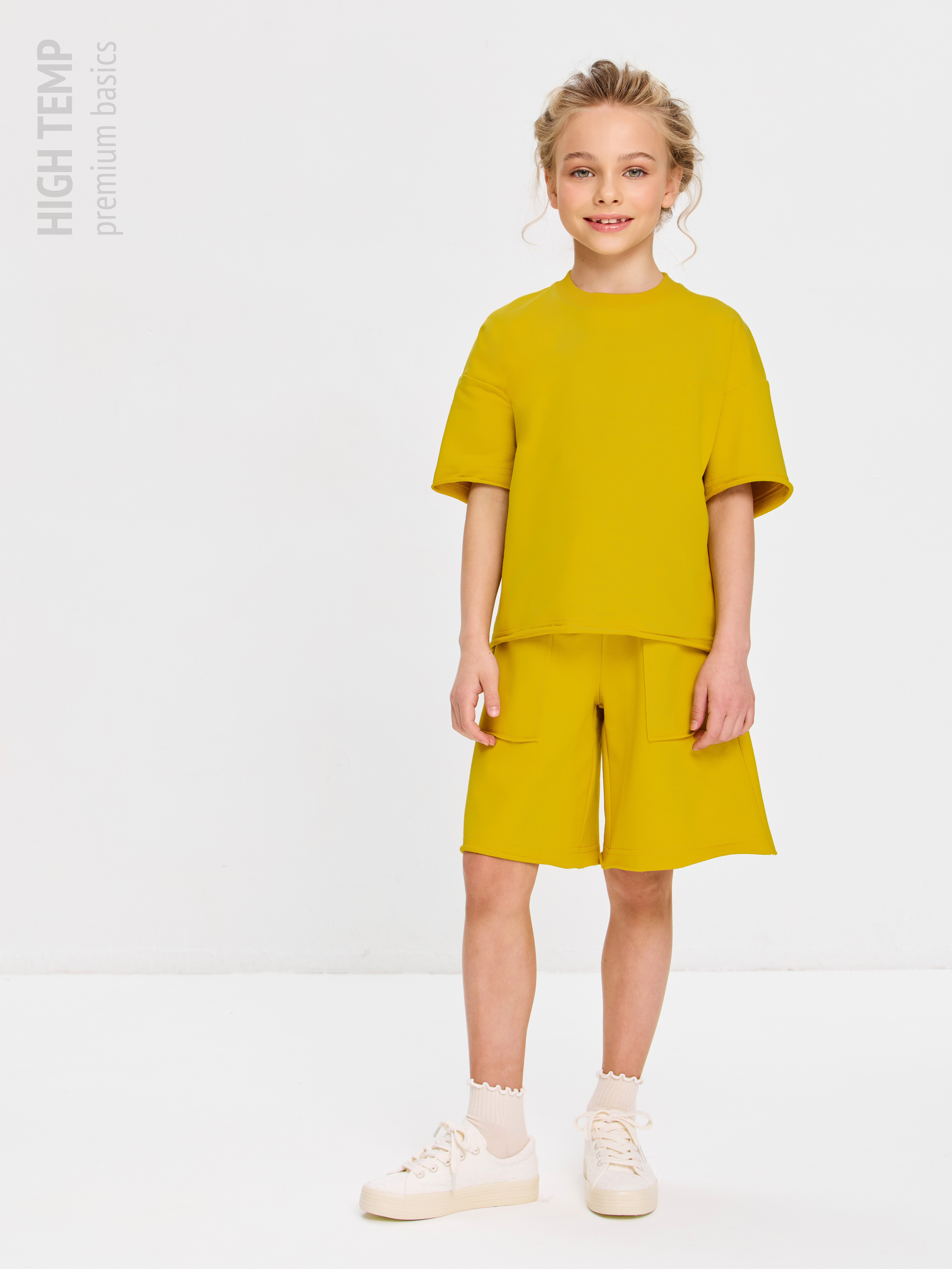 Свободная футболка оверсайз с открытыми срезами и необработанными швами, как и шорты — придает образу дерзости и индивидуальности, позволяя ребенку чувствовать себя свободно и комфортно.