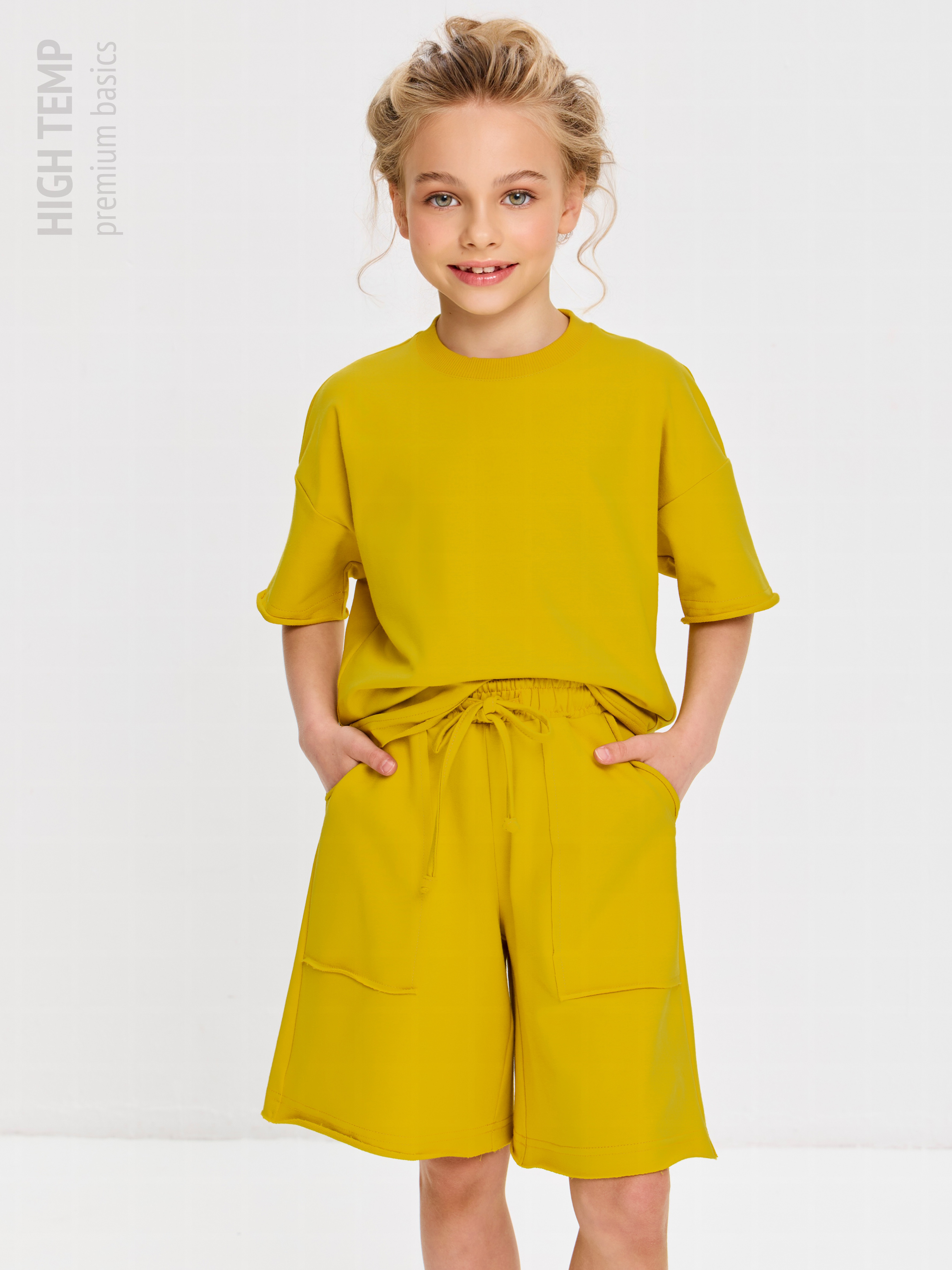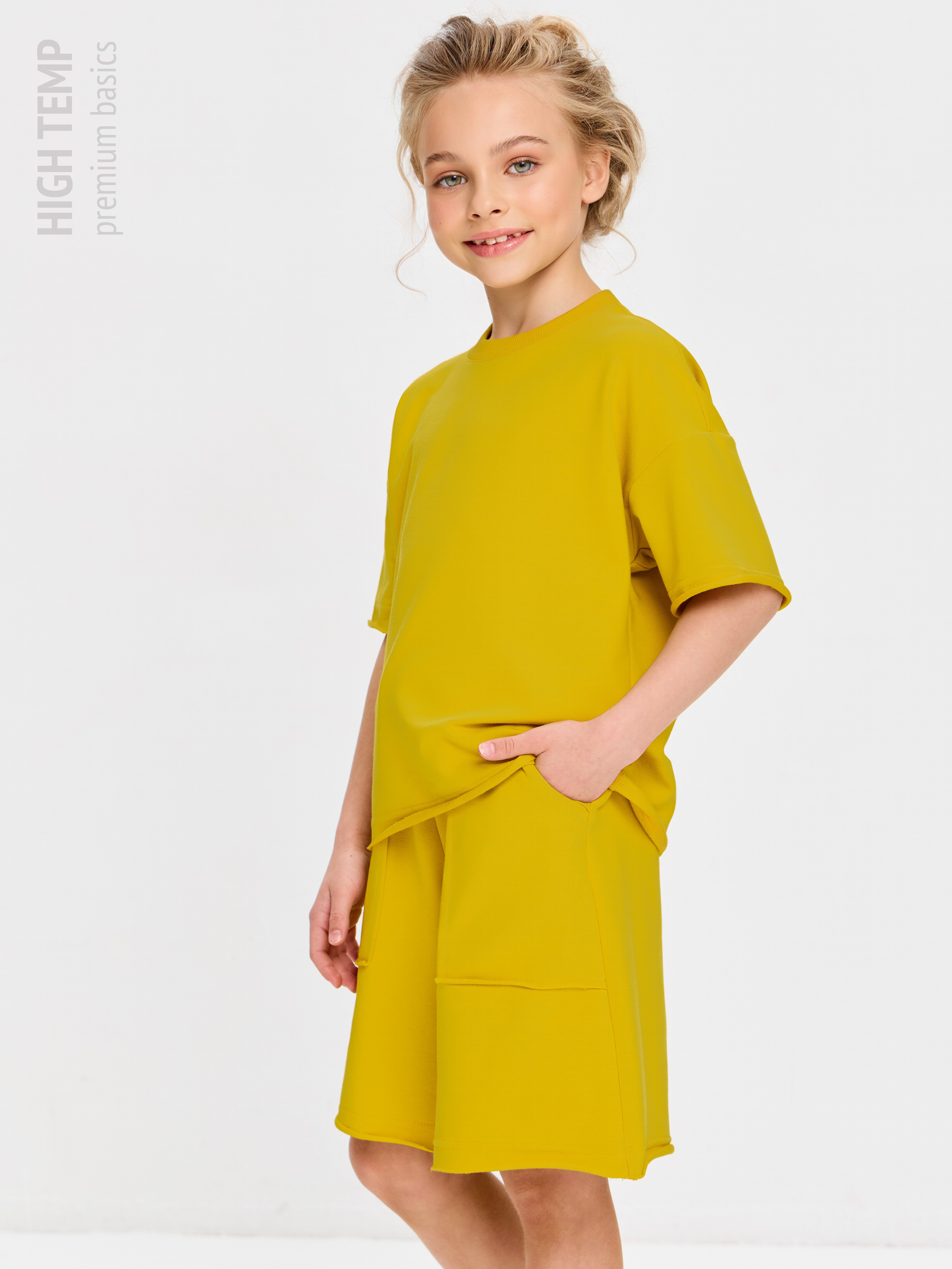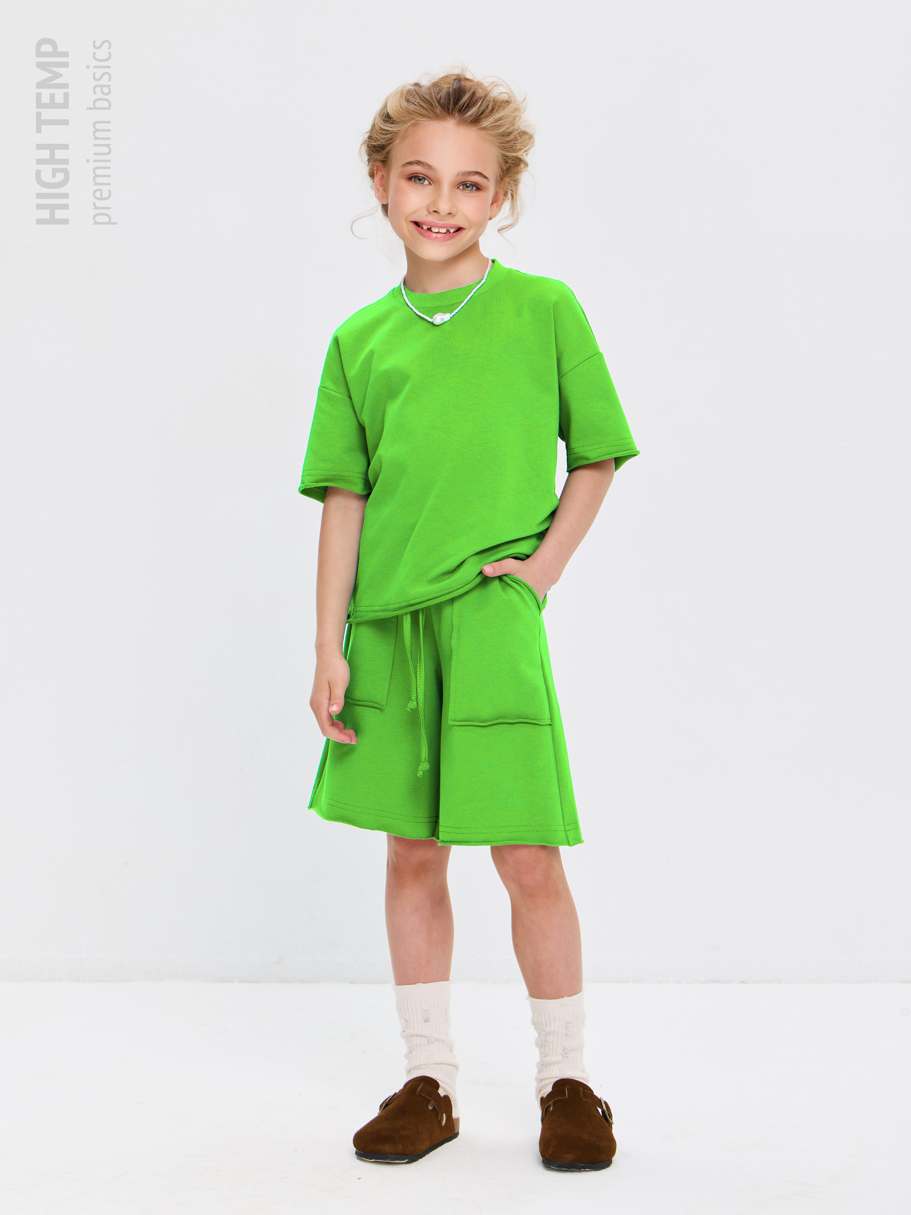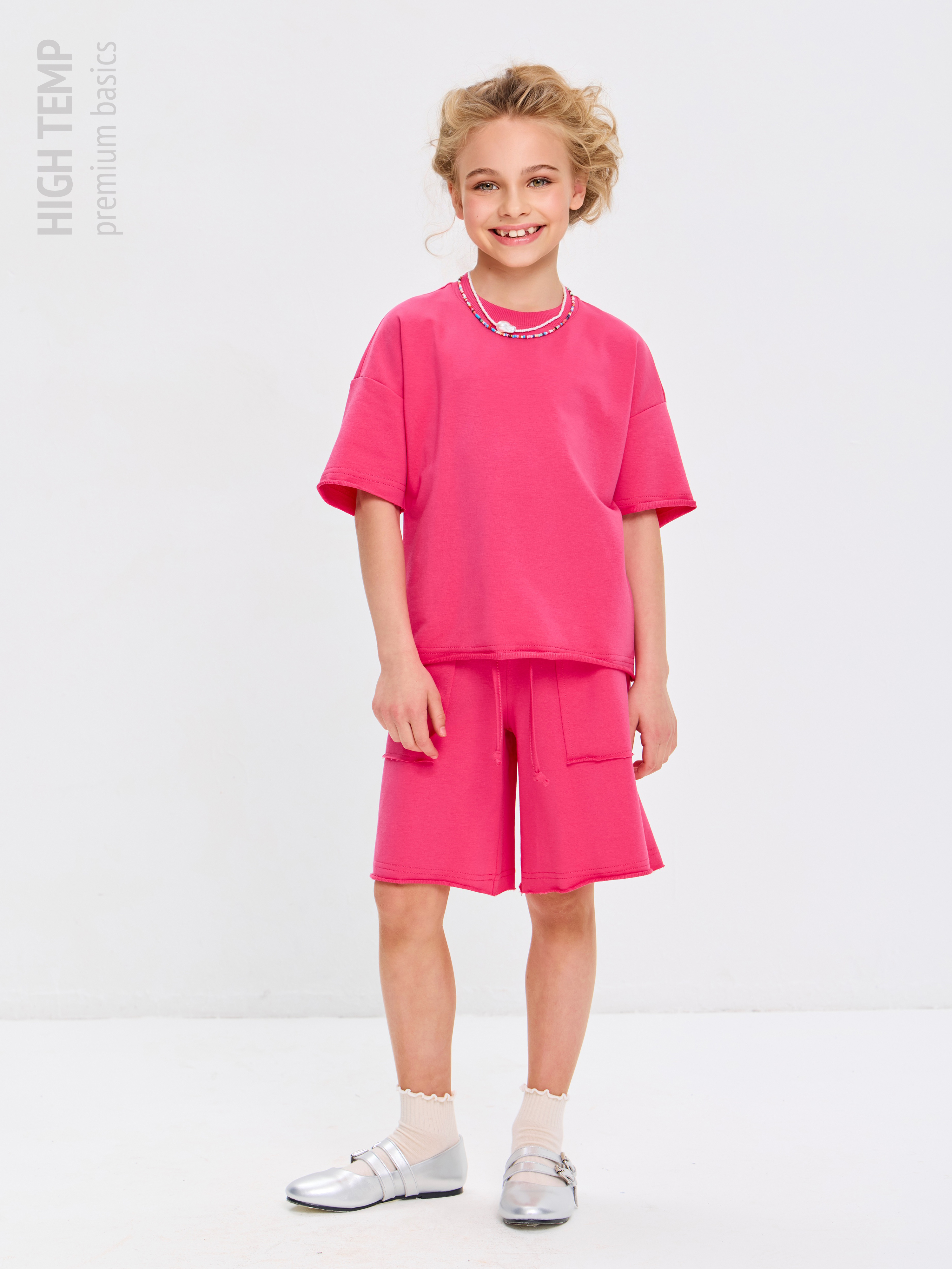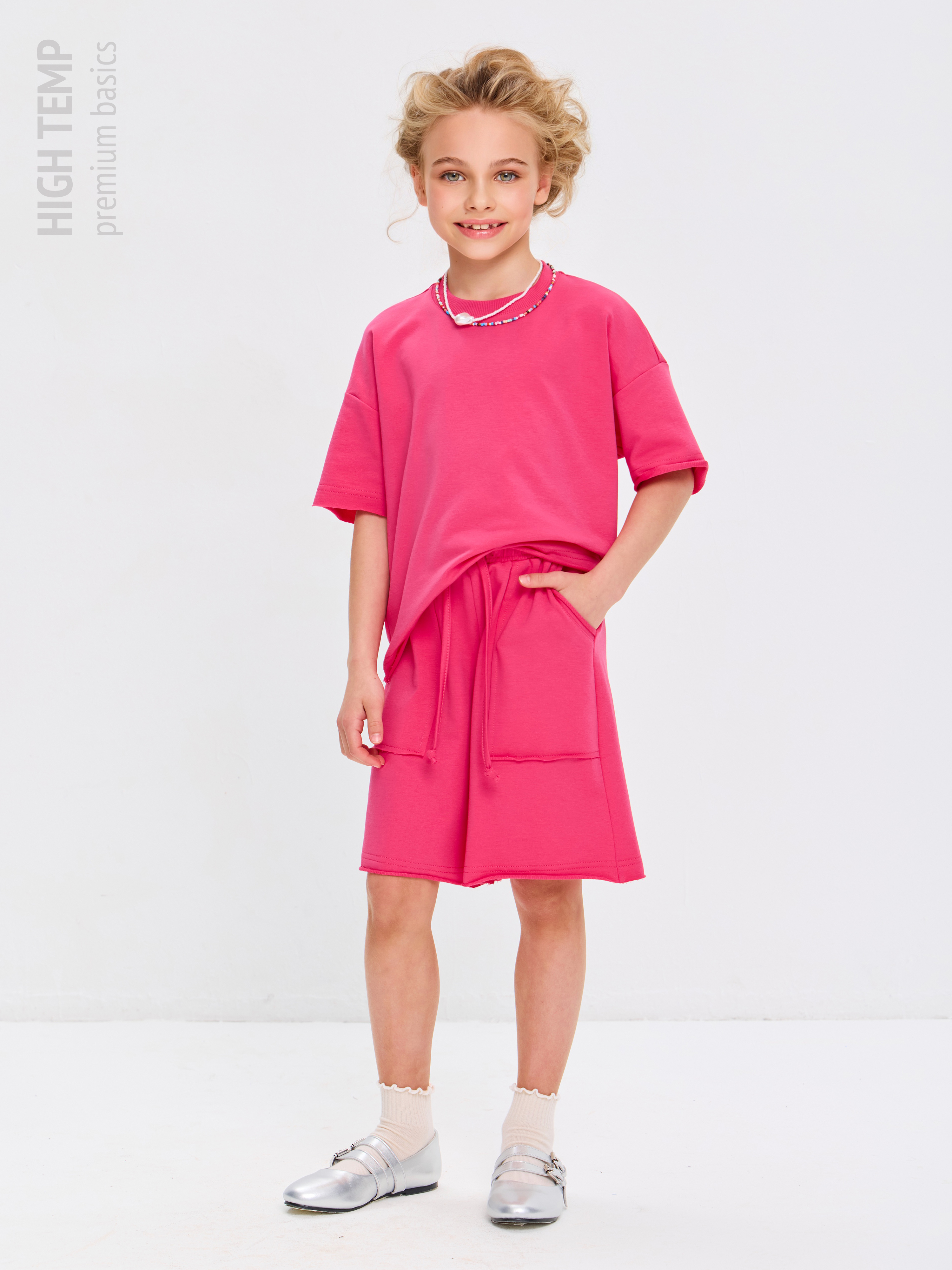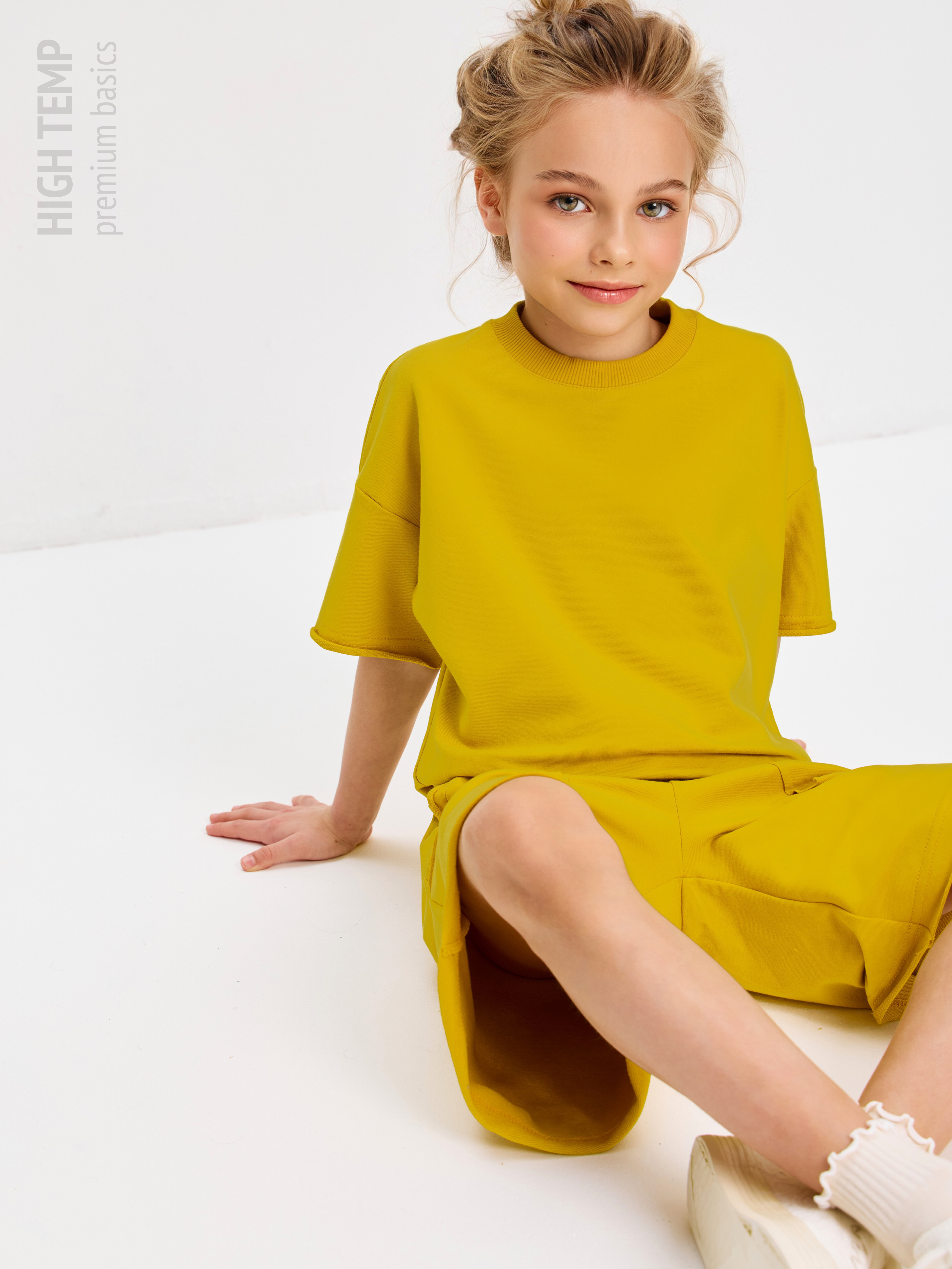Свободная футболка оверсайз с открытыми срезами и необработанными швами, как и шорты — придает образу дерзости и индивидуальности, позволяя ребенку чувствовать себя свободно и комфортно.