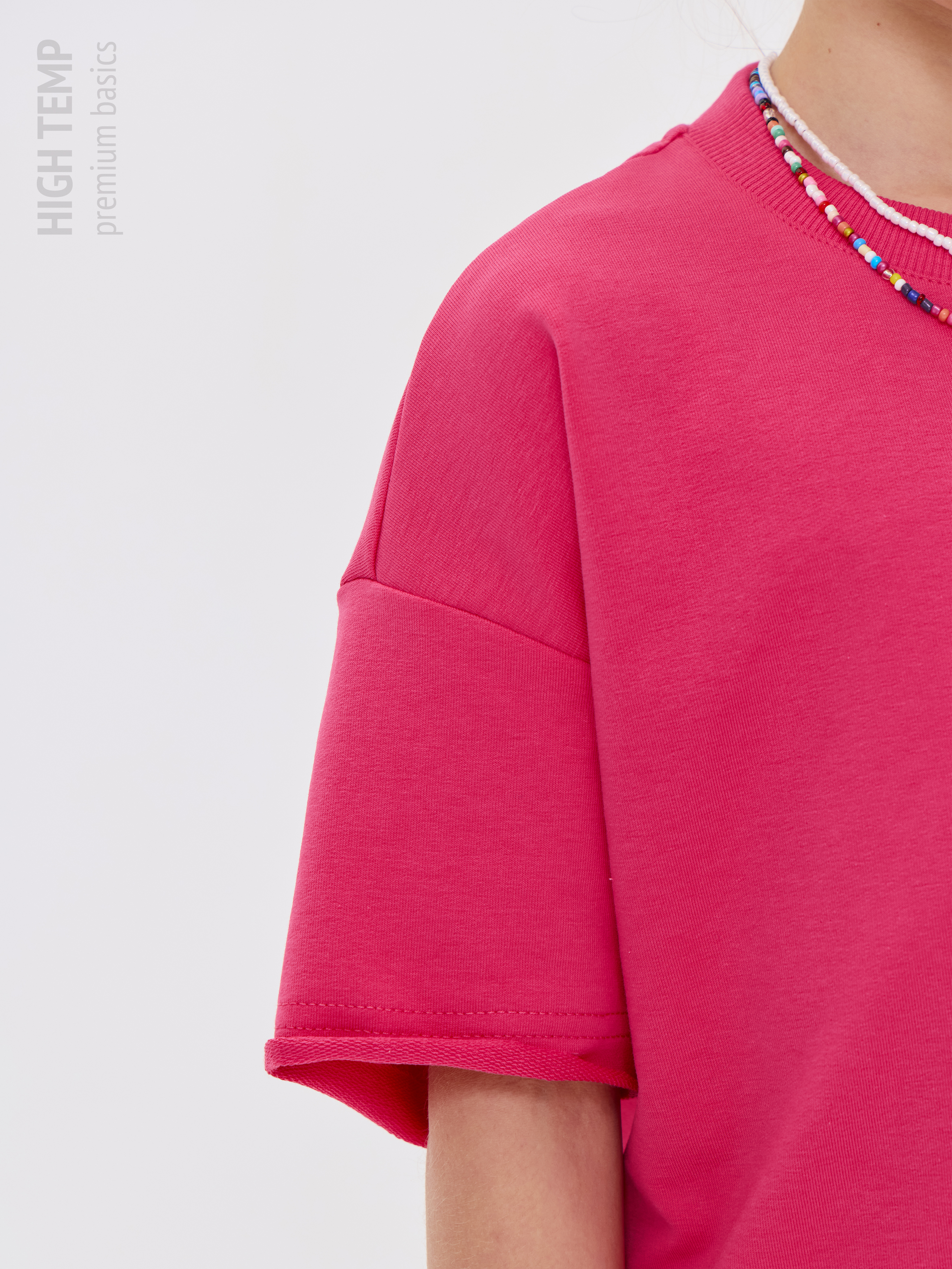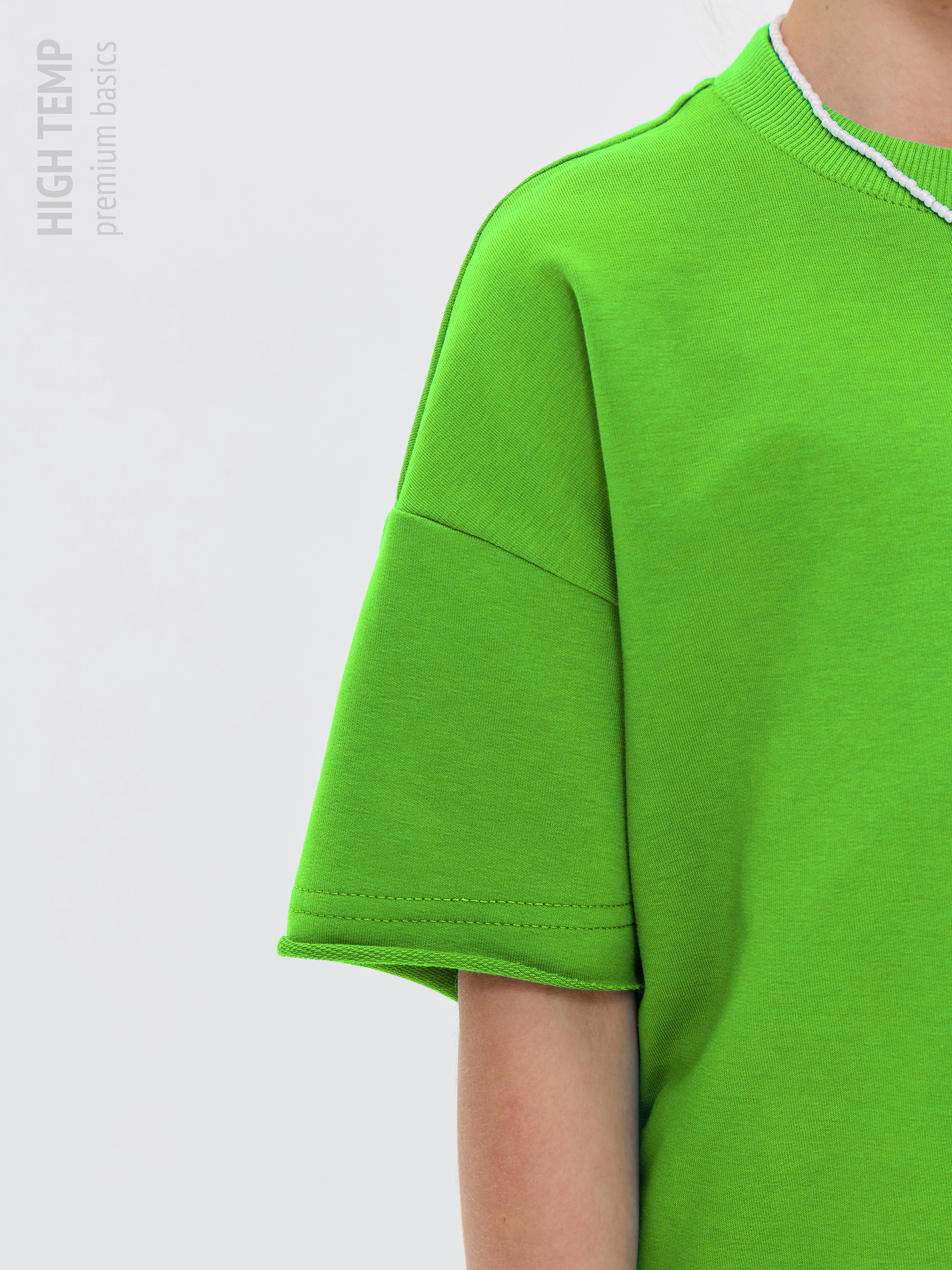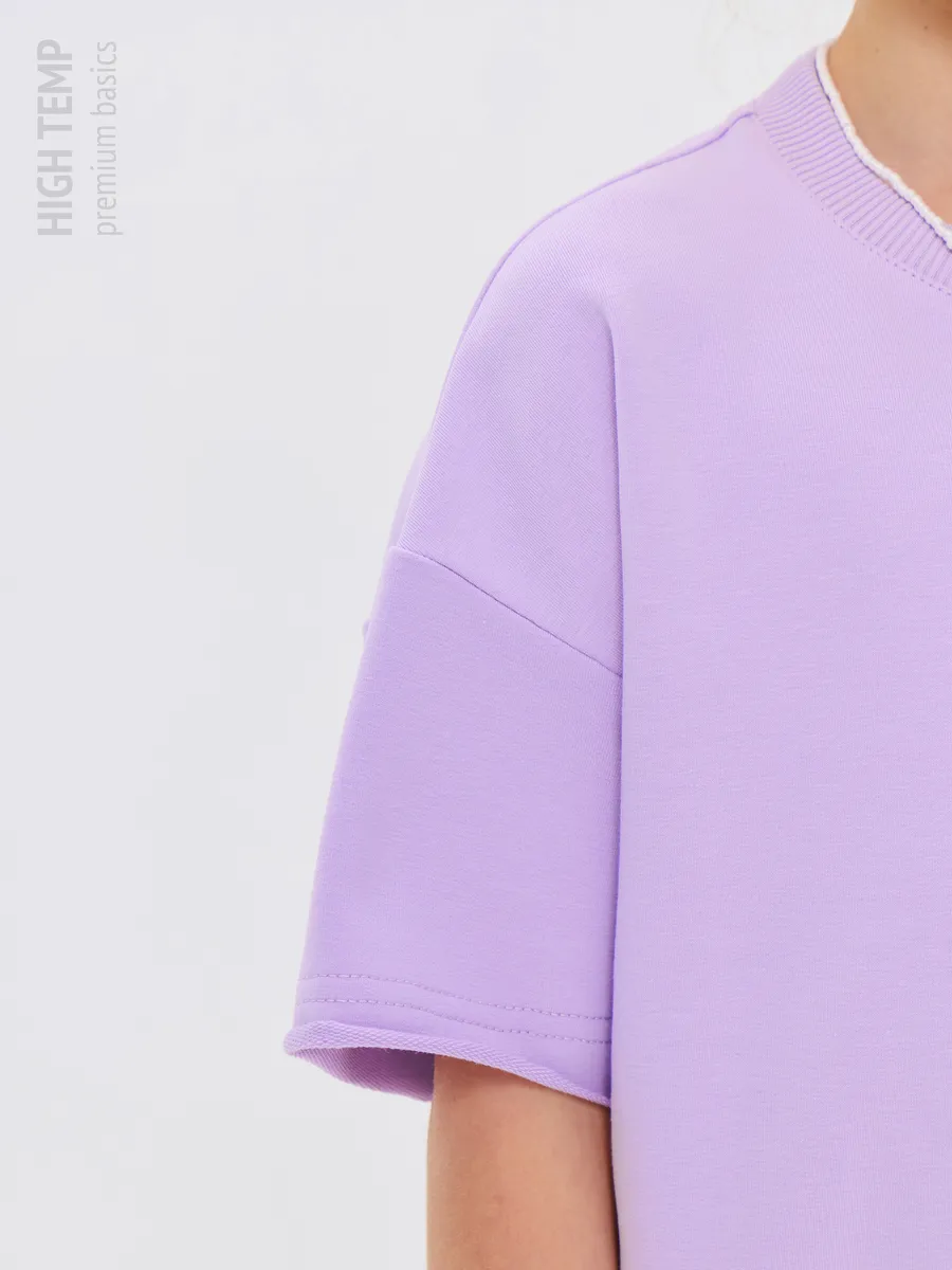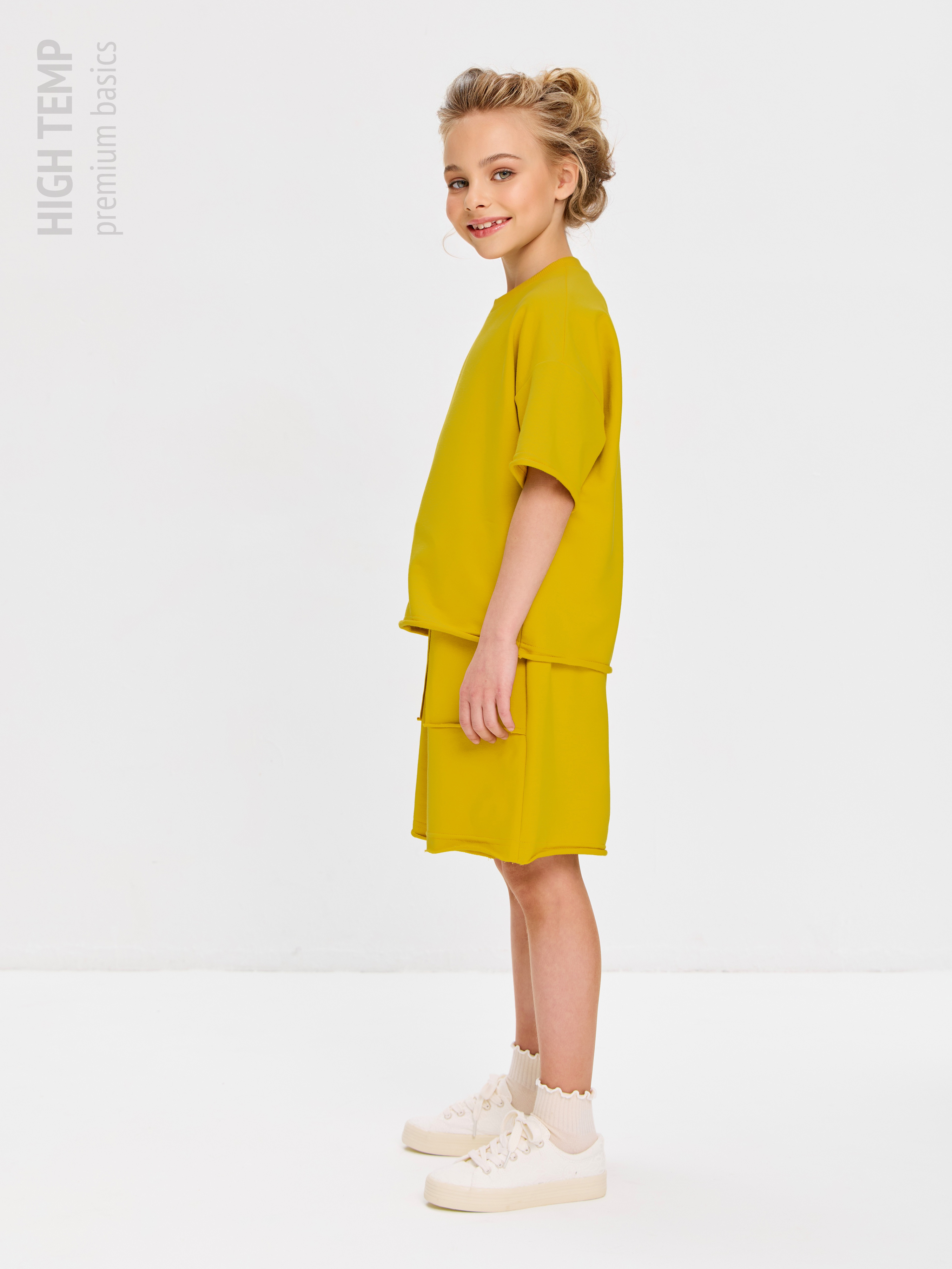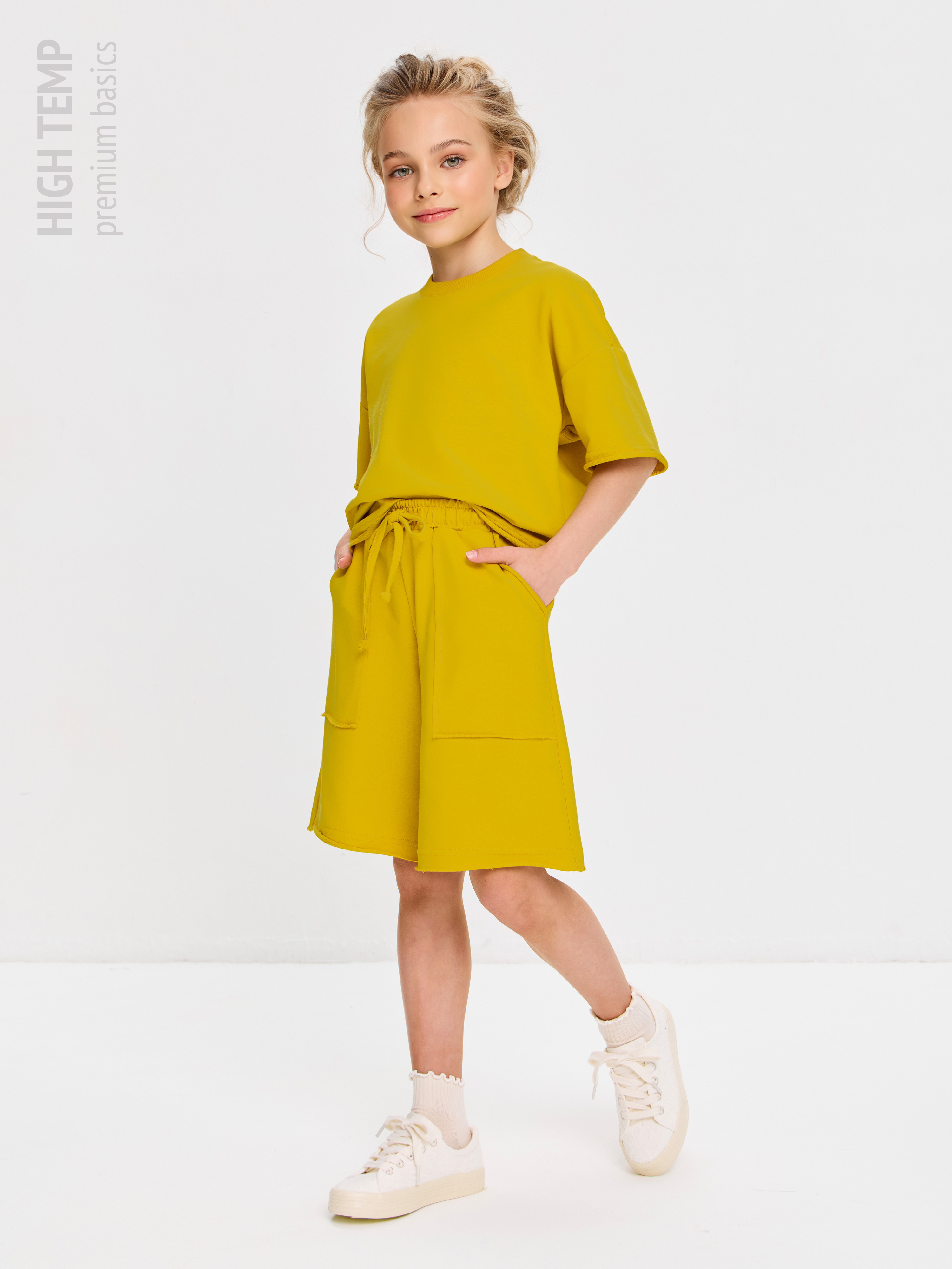 Свободная футболка оверсайз с открытыми срезами и необработанными швами, как и шорты — придает образу дерзости и индивидуальности, позволяя ребенку чувствовать себя свободно и комфортно.