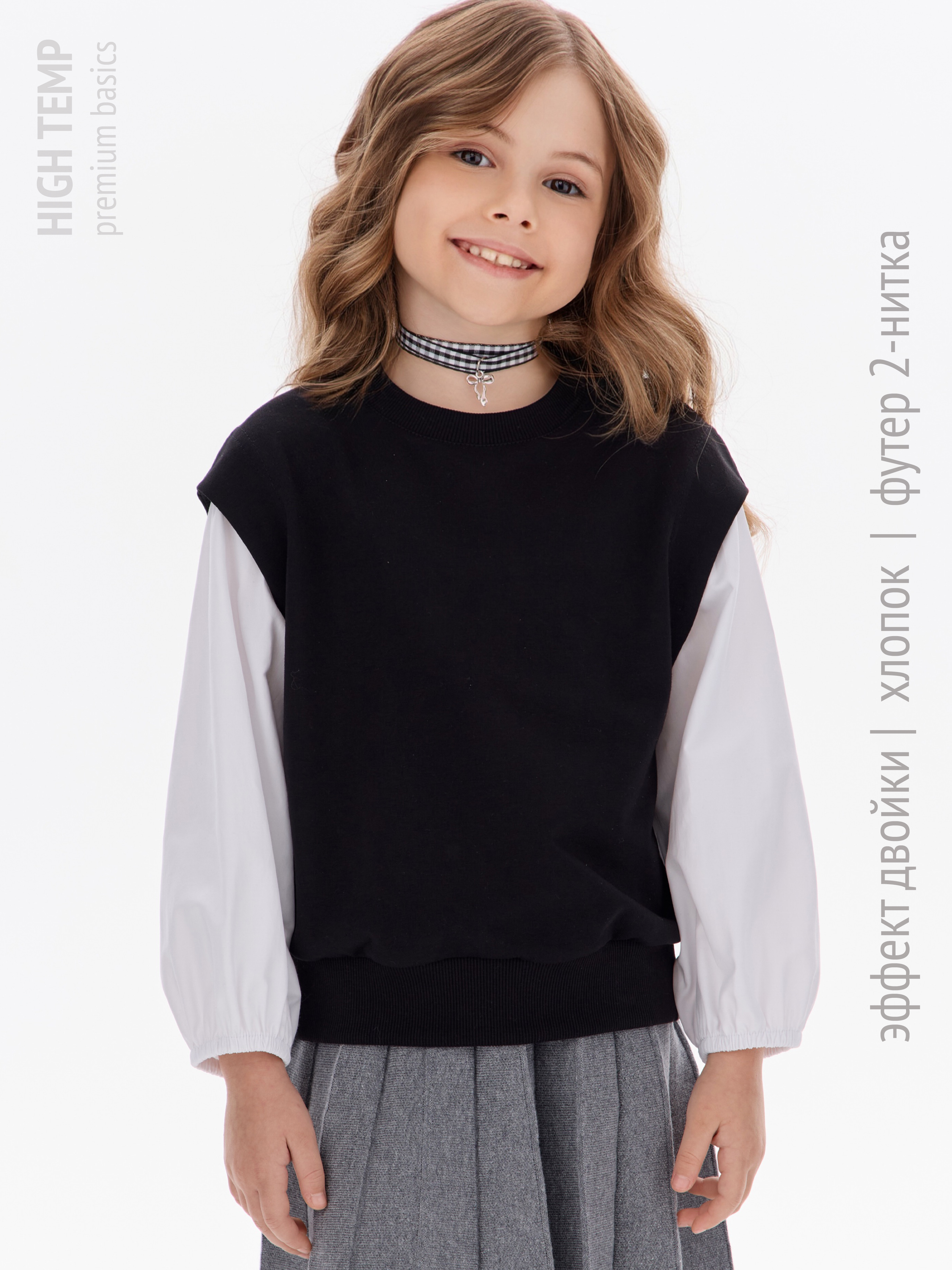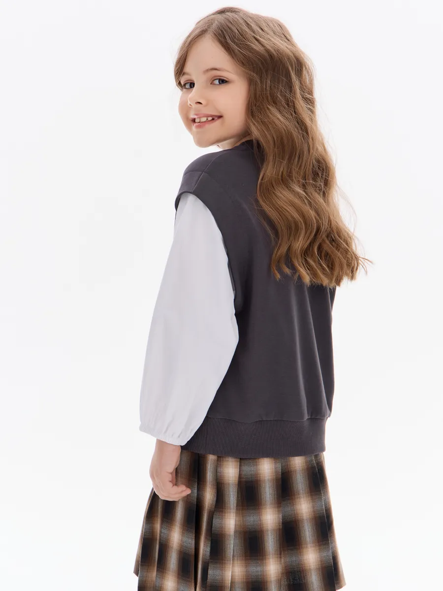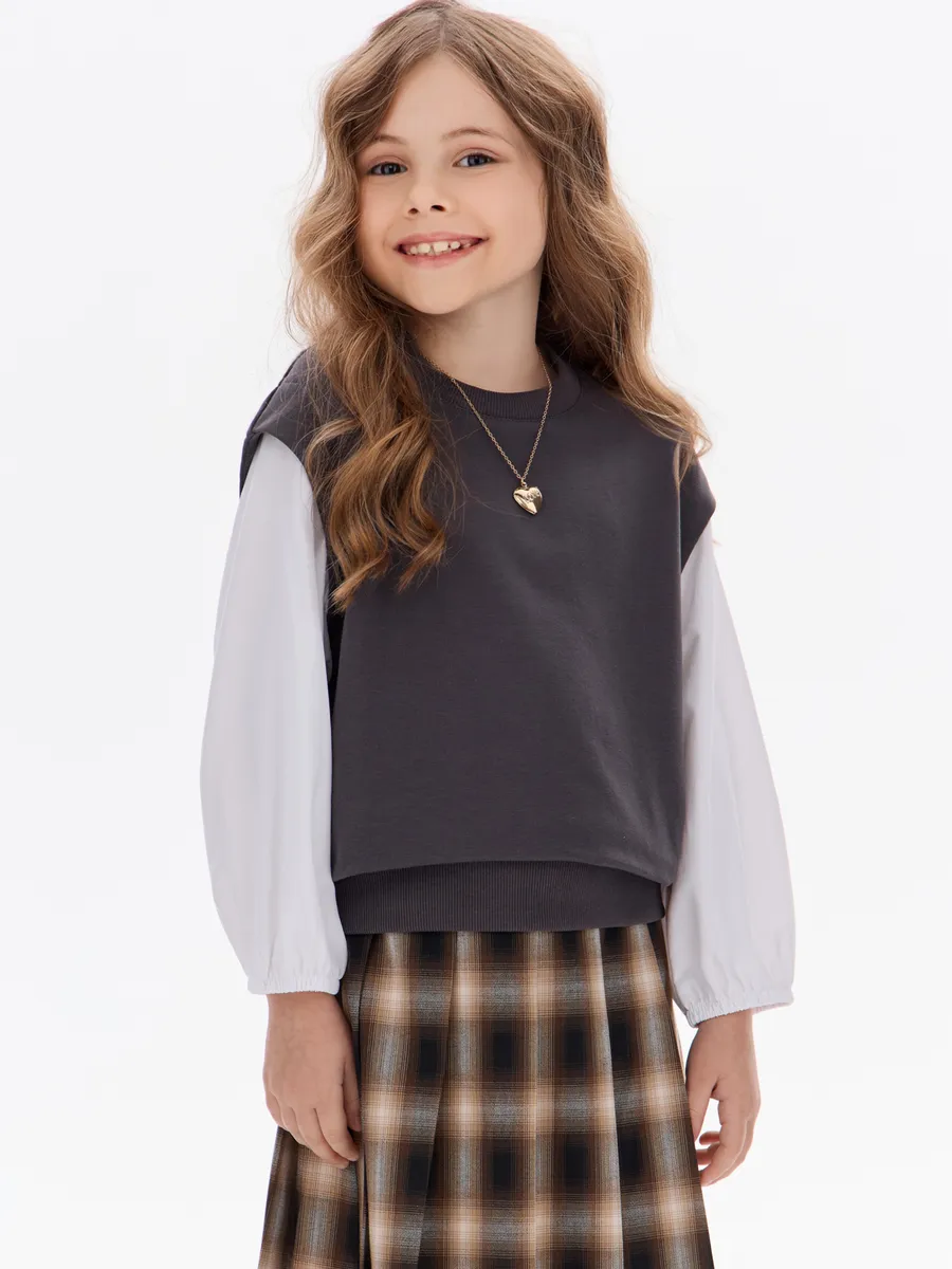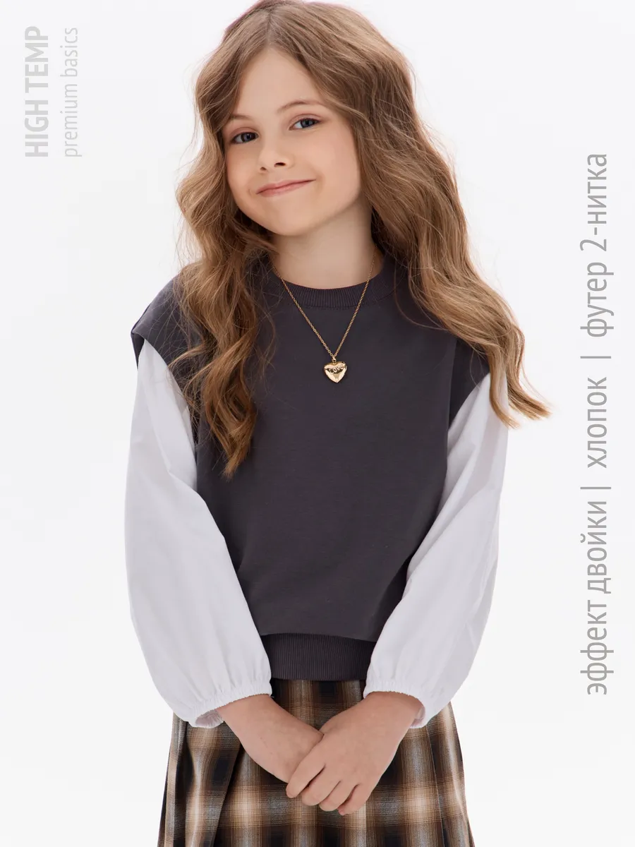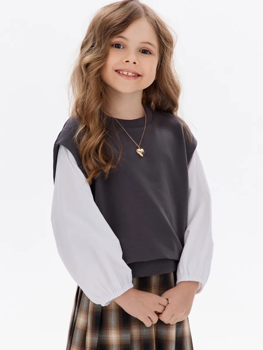 Этот свитшот-рубашка станет любимой кофтой на все случаи: в школу— стильно сочетается с юбками, брюками или джинсами; на прогулку— тёплый и удобный, не мешает активным играм; на праздник— благодаря лаконичным белым рукавам выглядит нарядно, но без излишеств.