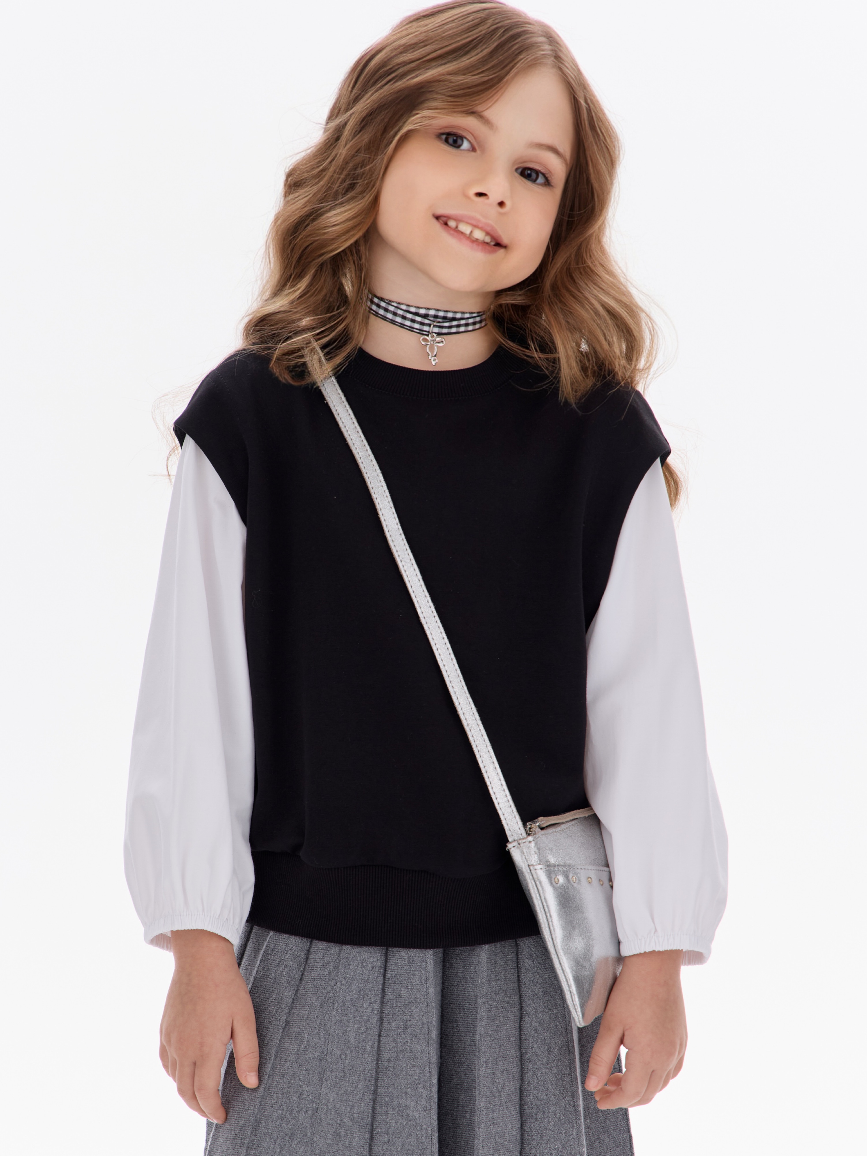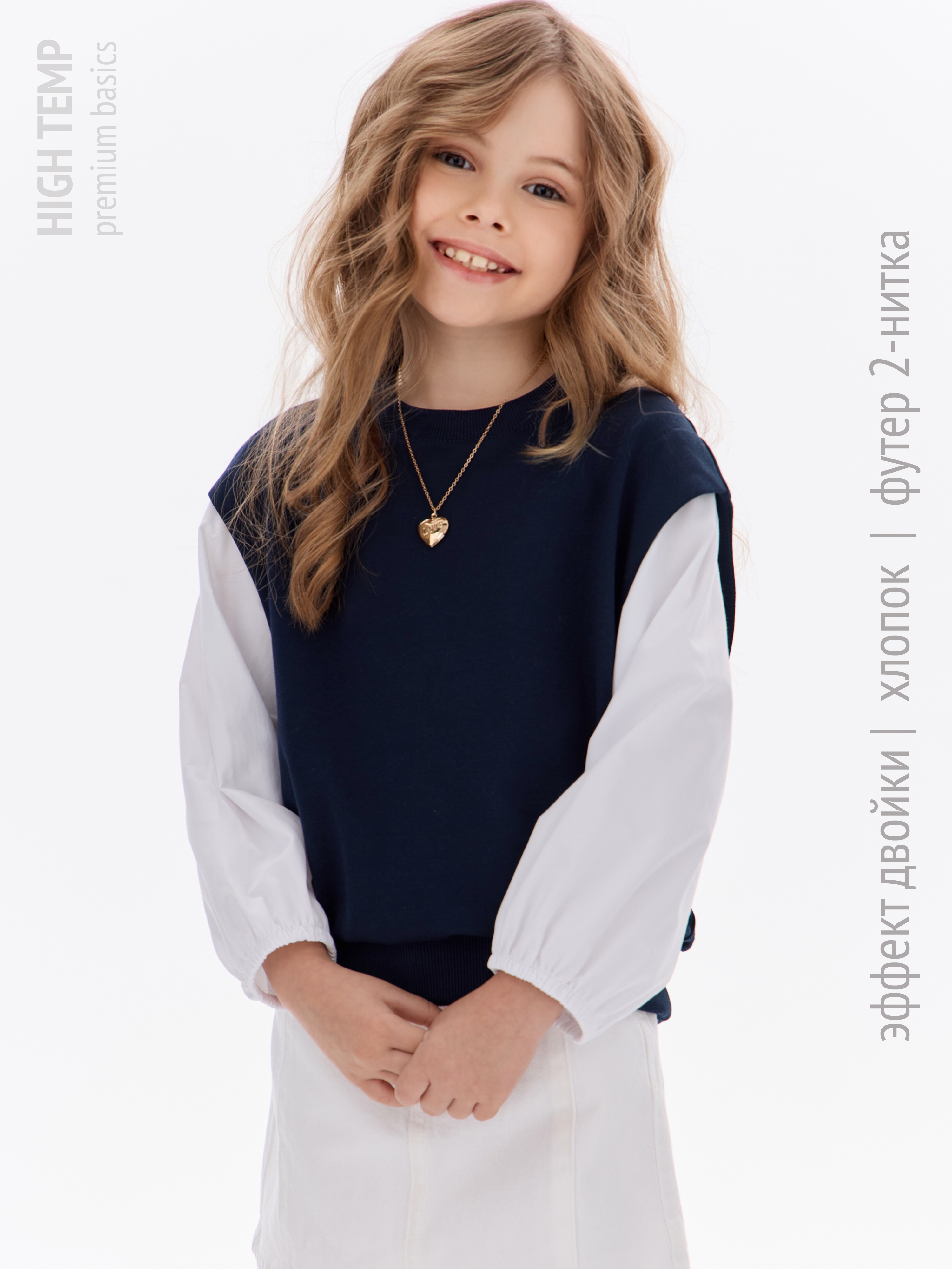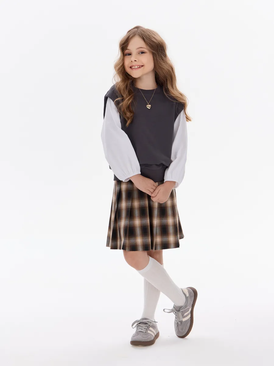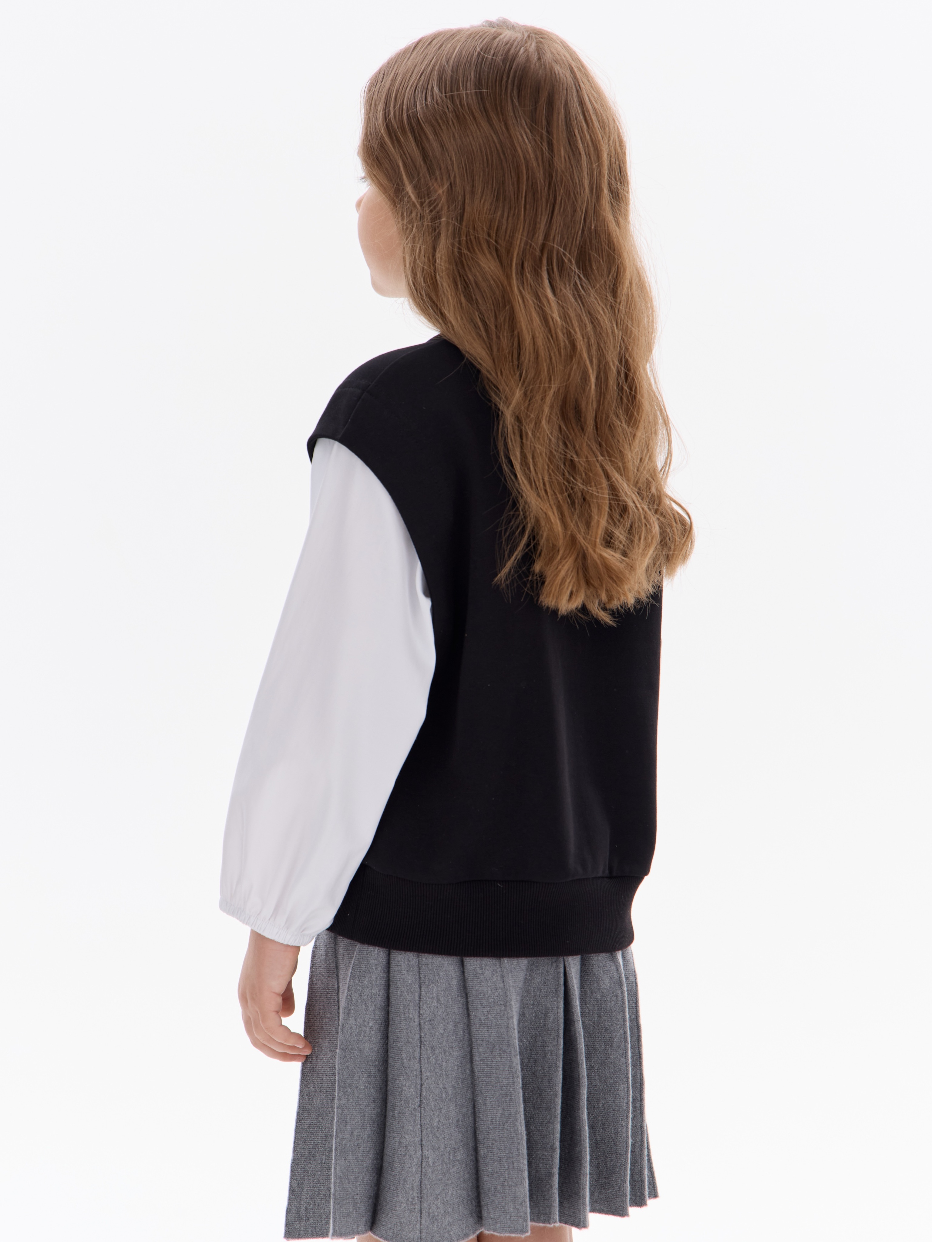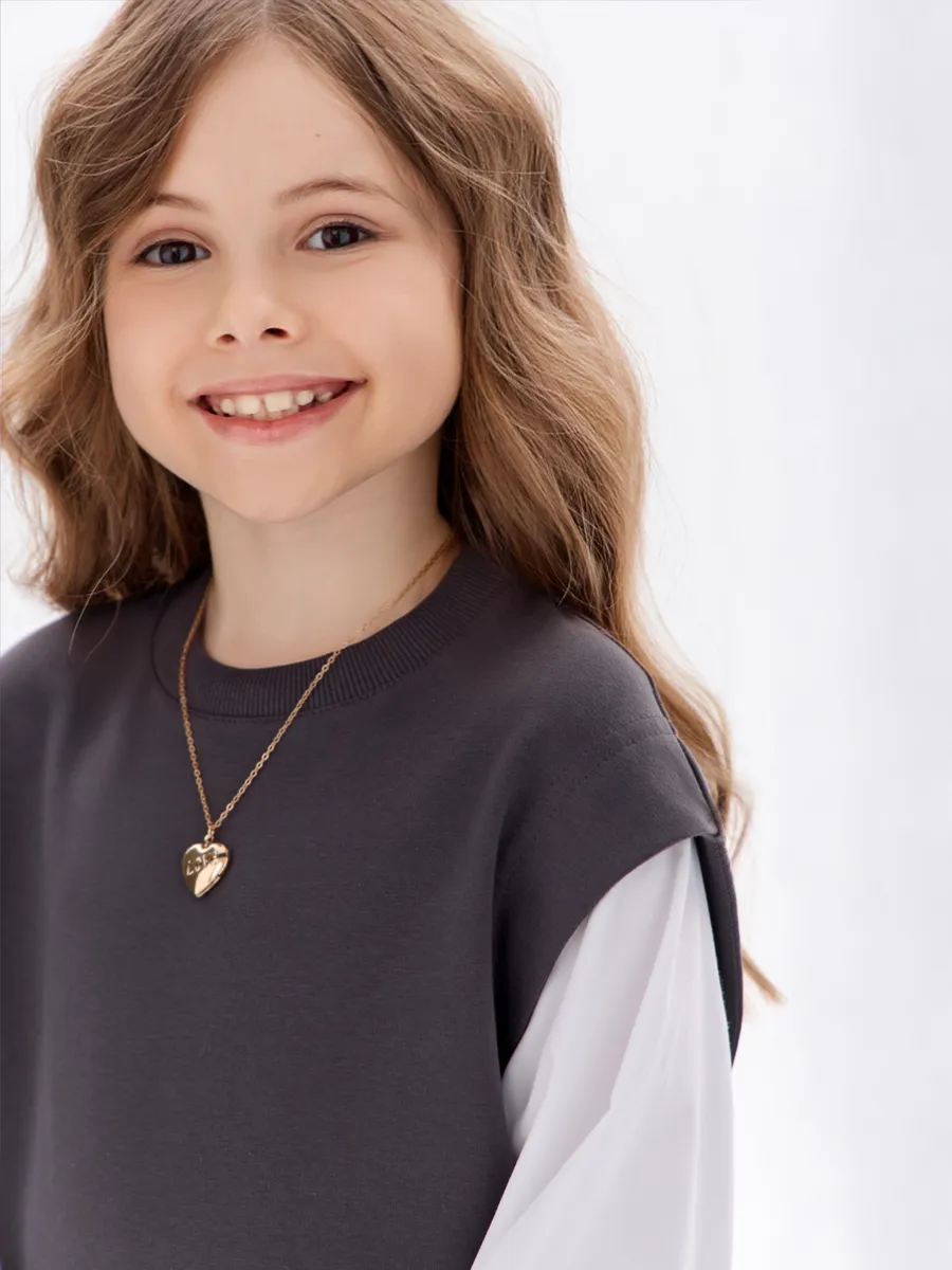 Этот свитшот-рубашка станет любимой кофтой на все случаи: в школу— стильно сочетается с юбками, брюками или джинсами; на прогулку— тёплый и удобный, не мешает активным играм; на праздник— благодаря лаконичным белым рукавам выглядит нарядно, но без излишеств.
