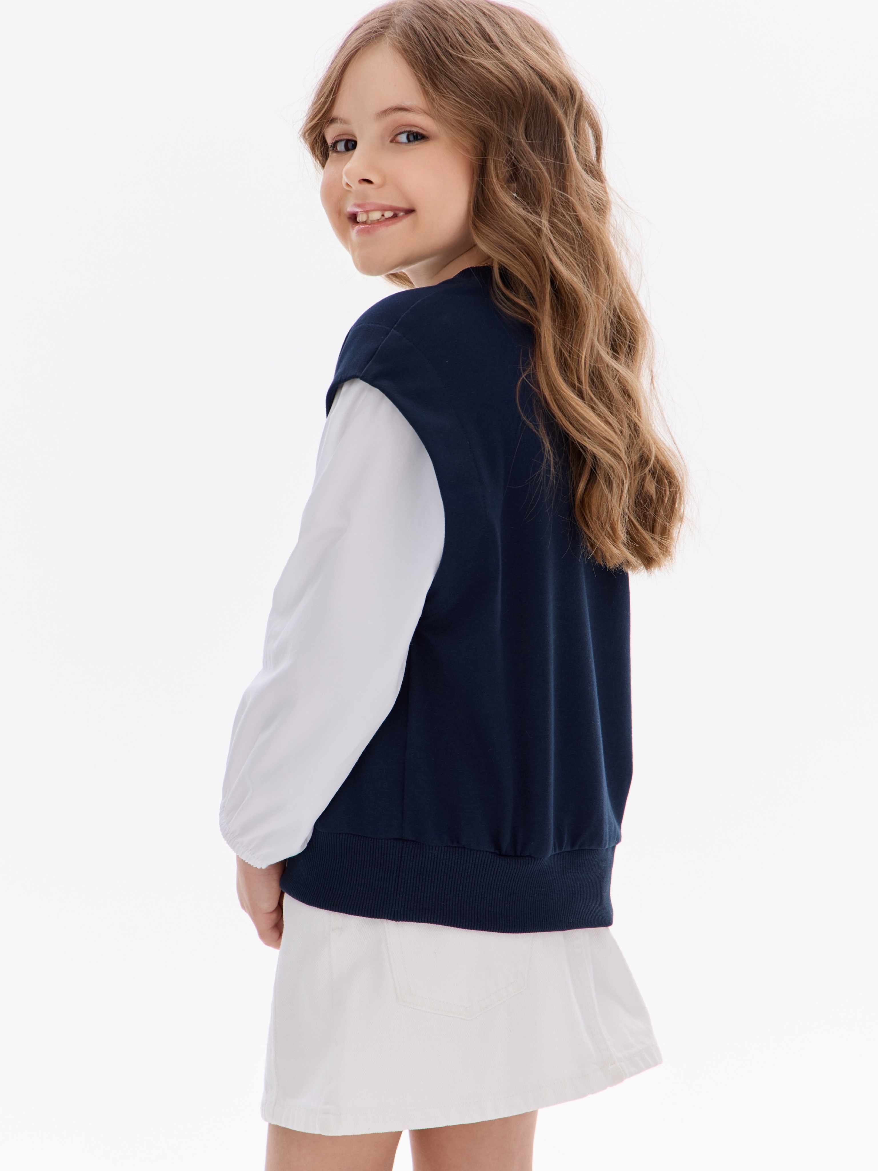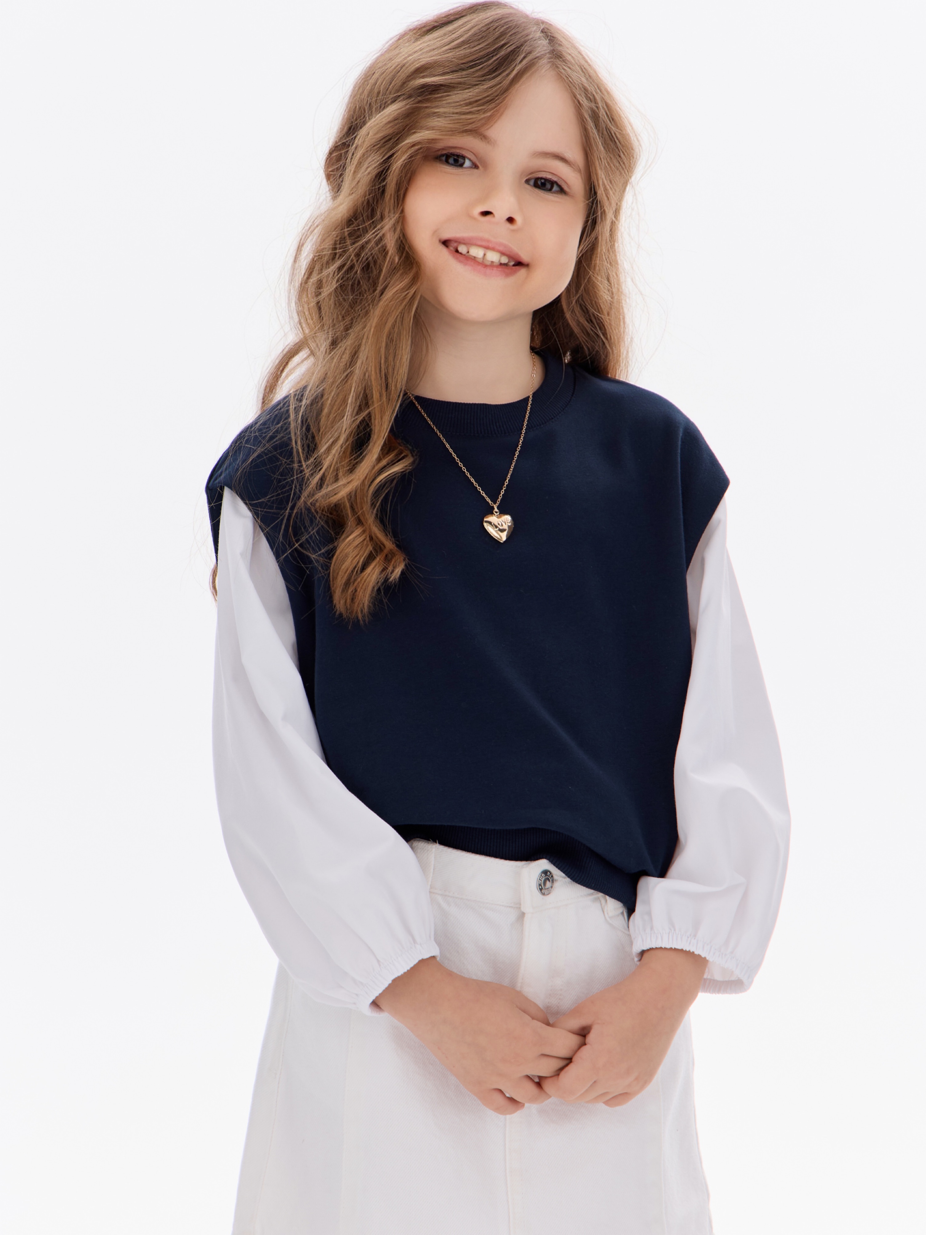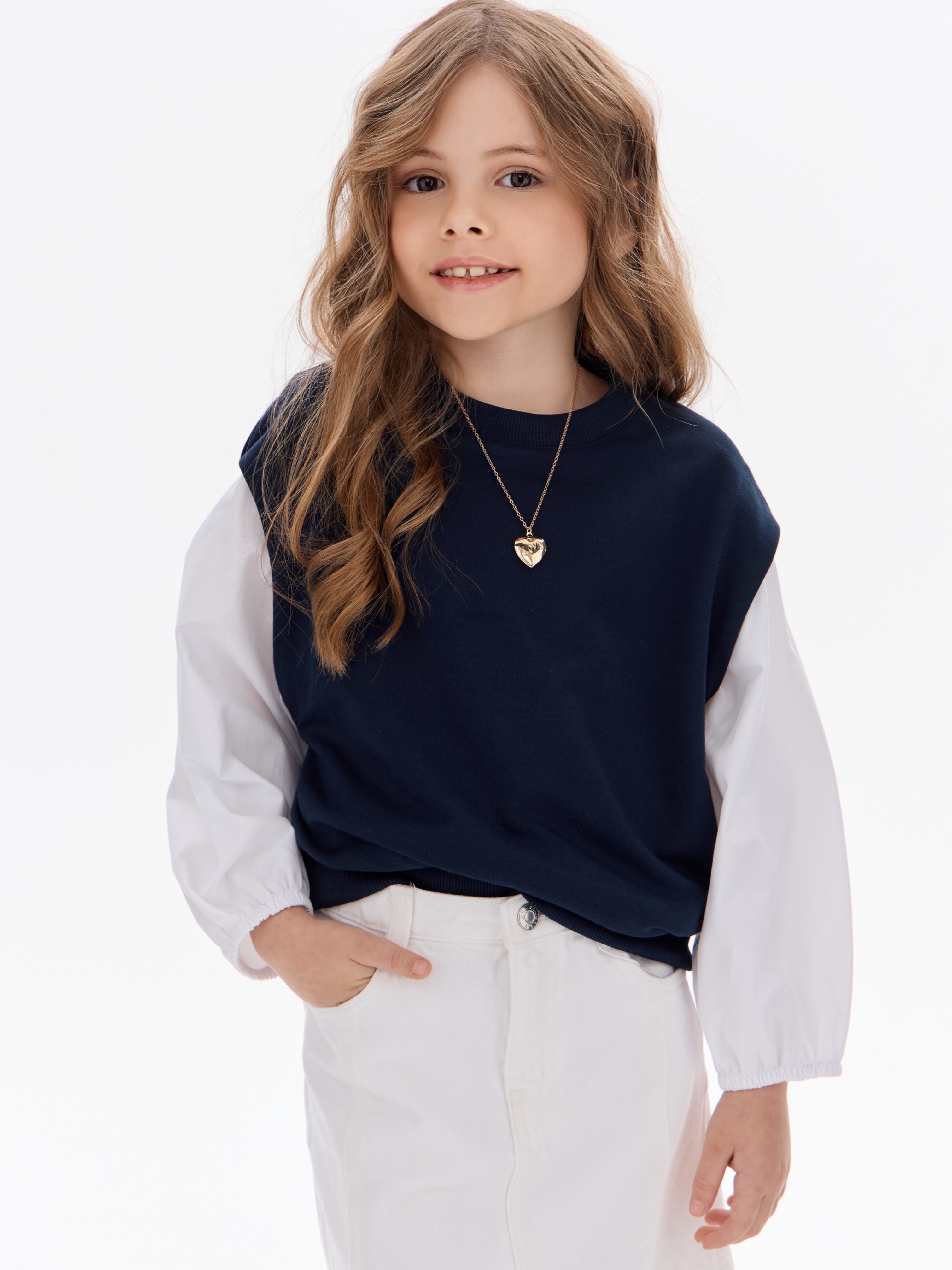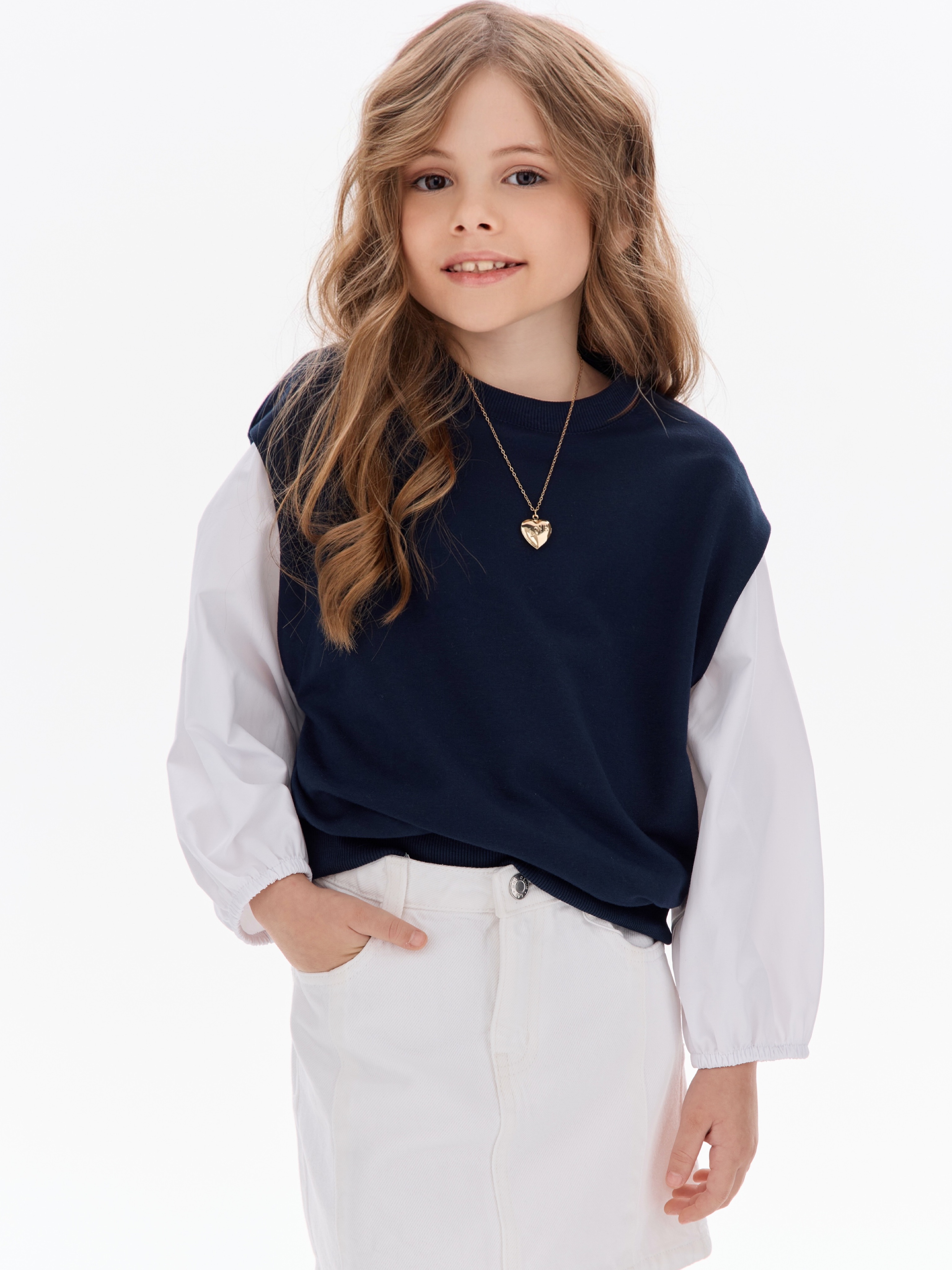 Этот свитшот-рубашка станет любимой кофтой на все случаи: в школу— стильно сочетается с юбками, брюками или джинсами; на прогулку— тёплый и удобный, не мешает активным играм; на праздник— благодаря лаконичным белым рукавам выглядит нарядно, но без излишеств.